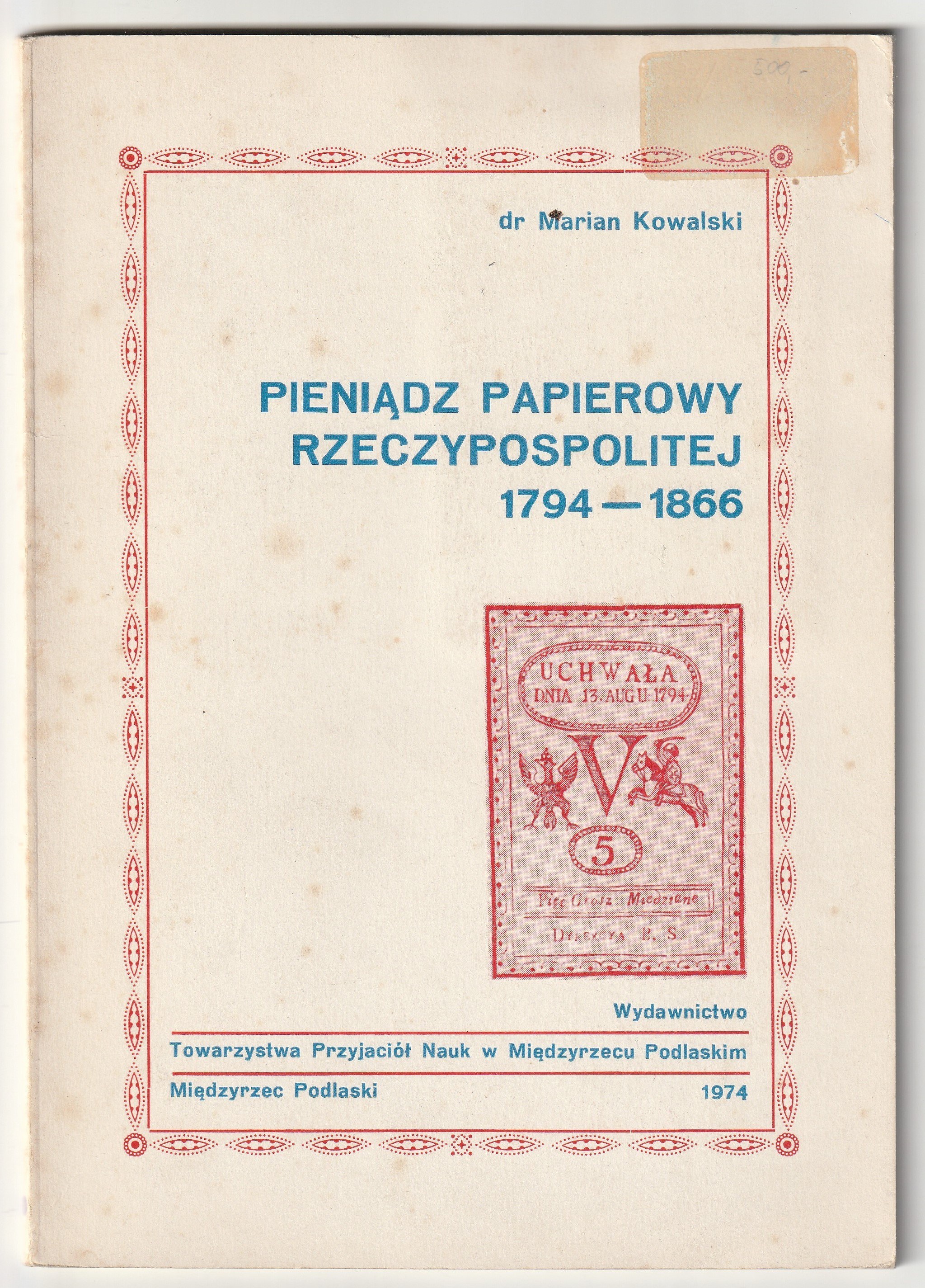 KOWALSKI Marian. Pieniądz papierowy Rzeczypospolitej 1794-1866, wyd. Wydawnictwo Towarzystwa Przyjaciół Nauk w Międzyrzecu Podlaskim, Międzyrzec Podlaski 1974, str. 64; oprawa miękka, ślad po naklejce, rdzawe plamki, na wewnętrznej stronie przedniej okładki exlibris Fryderyka Lorka, st. db.; wym. ok. 160x230 mm.