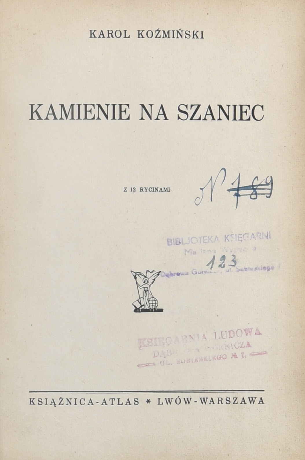 8, s. 195, [5], opr. ppł. wtórna. Na str. tytuł. pieczęcie i numery inwentarzowe, 3 karty podkl. "Kamienie na szaniec - to życiorysy dwunastu poległych na polu chwały żołnierzy naszych, pochodzących zarówno z Pierwszej Brygady, jak i innych brygad legionowych, zarówno z Legionów jak i formacyj wschodnich, czy armii polskiej we Francji". [Ze wstępu]