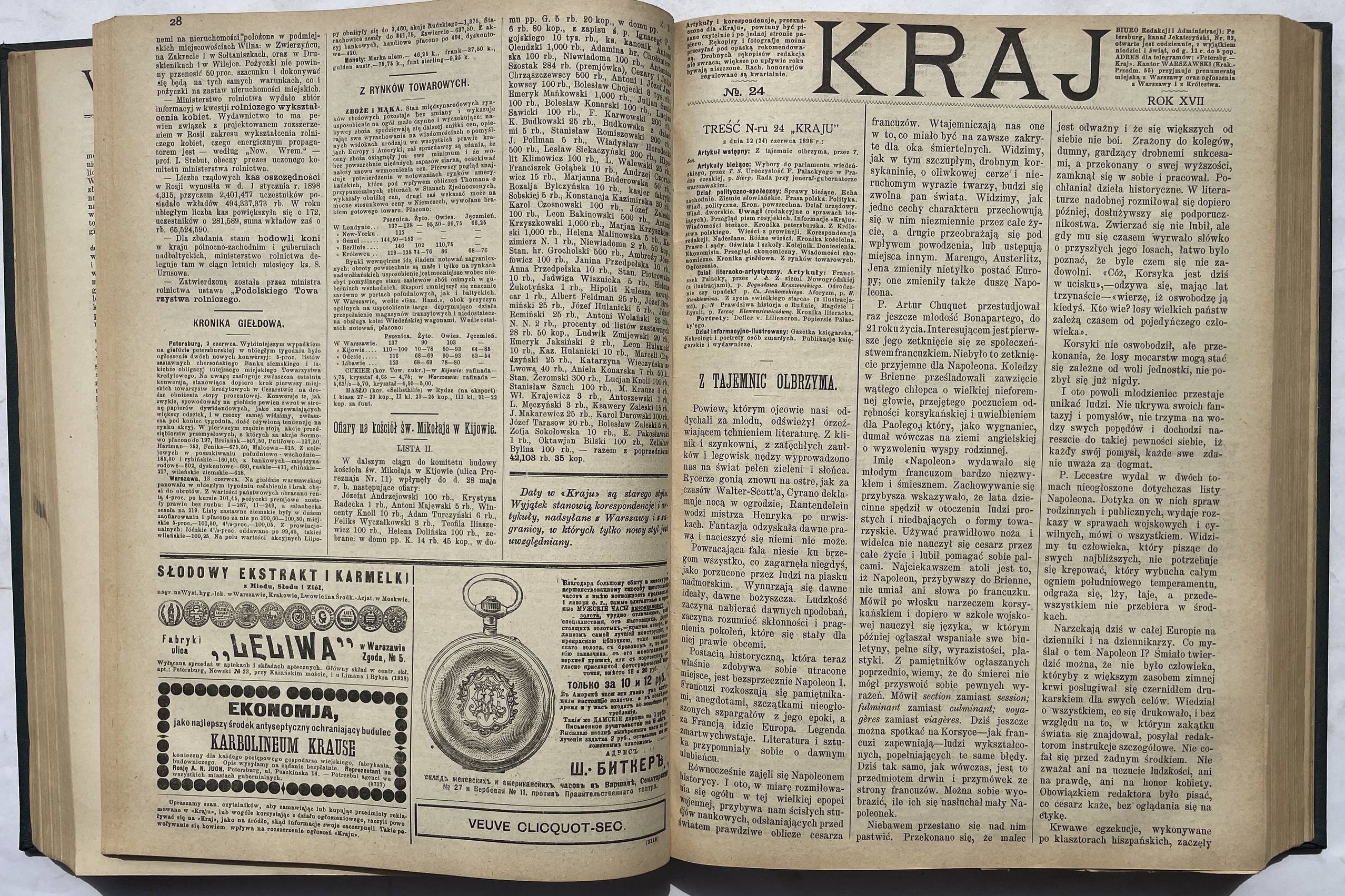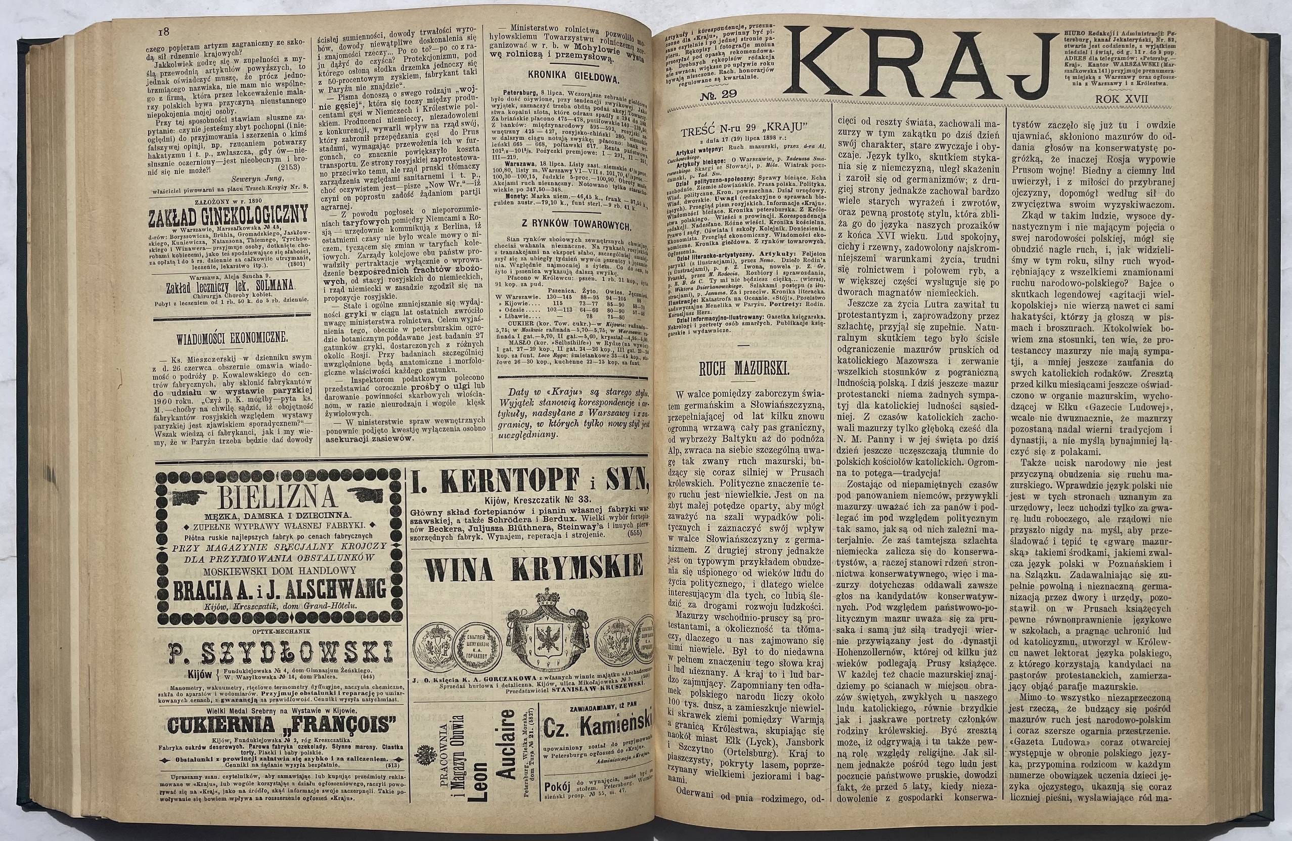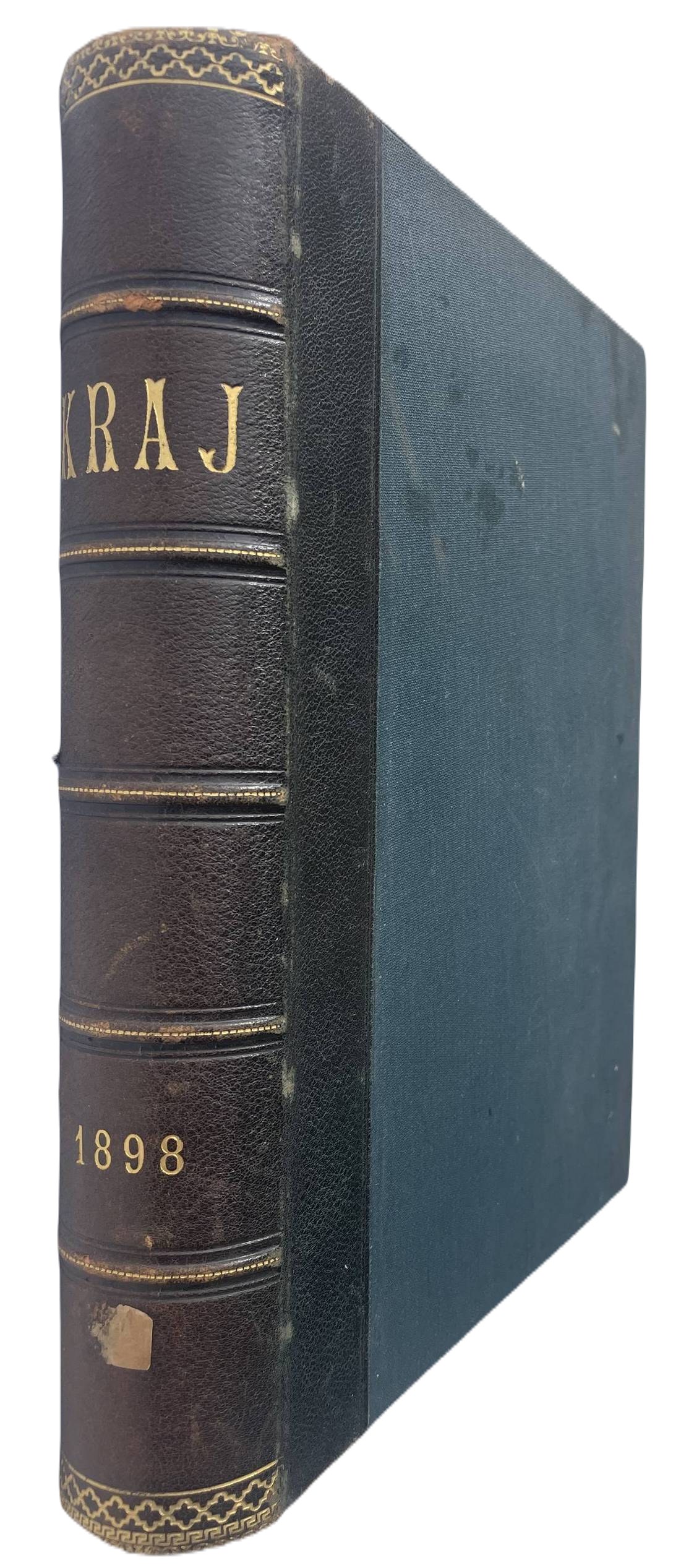 Kraj. Tygodnik społeczno-polityczny. Rok 1898 nr 1-39 (brak nr 5, 13, 16, 18 i 20) oraz 15 dodatków od nr 34. Format 31 cm, każdy nr ca 20-30 stron. Oprawa z epoki płsk. złoc., stan b. dobry, ładny egz.