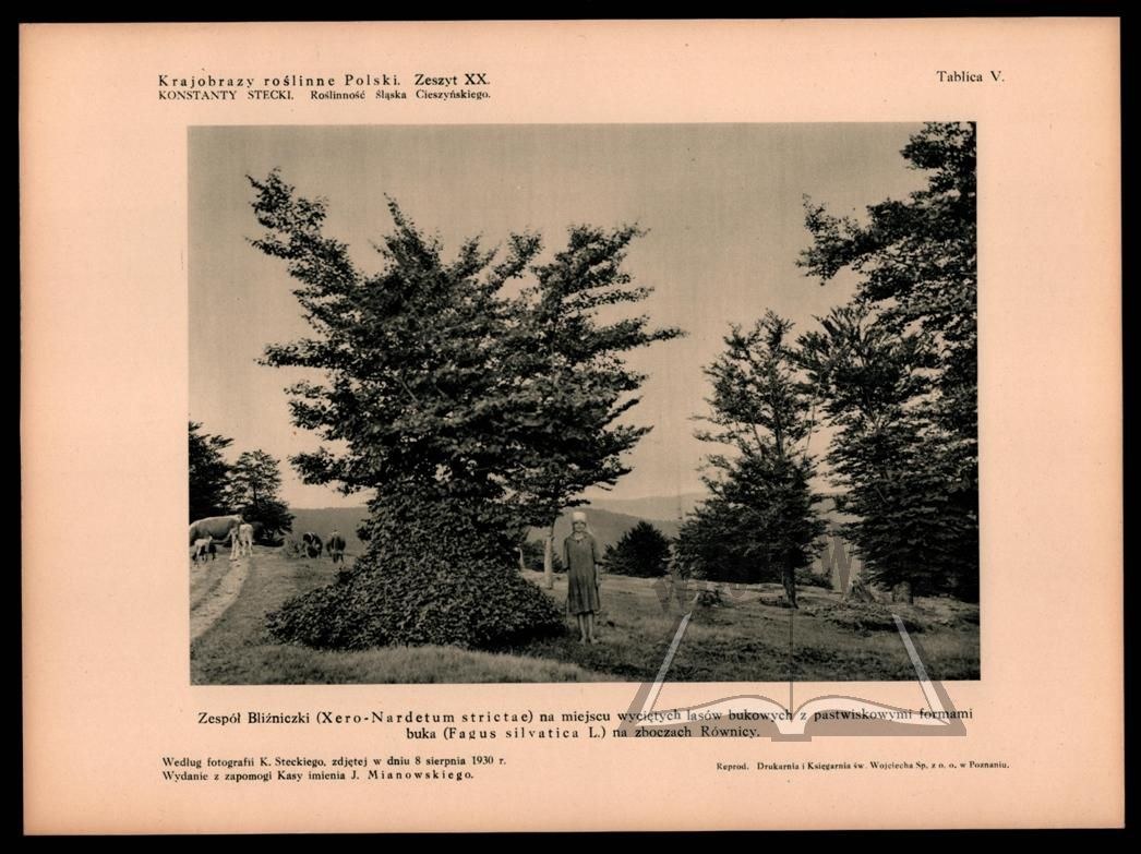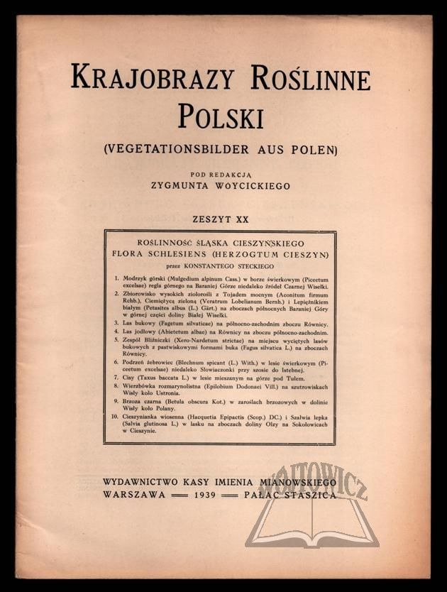 (Vegetationsbilder aus Polen). Pod red. Zygmunta Wóycickiego. Zeszyt XX. Roślinność Śląska Cieszyńskiego przez Konstantego Steckiego. Warszawa 1939. Pałac Staszica. Wyd. Kasy im. Mianowskiego. Drukarnia i Litografia Jan Cotty. Folio, s. 38, ilustr. w tekście i na 10 osobn. tabl., teka brosz. oryg. Tekst w j. polskim i niemieckim.
