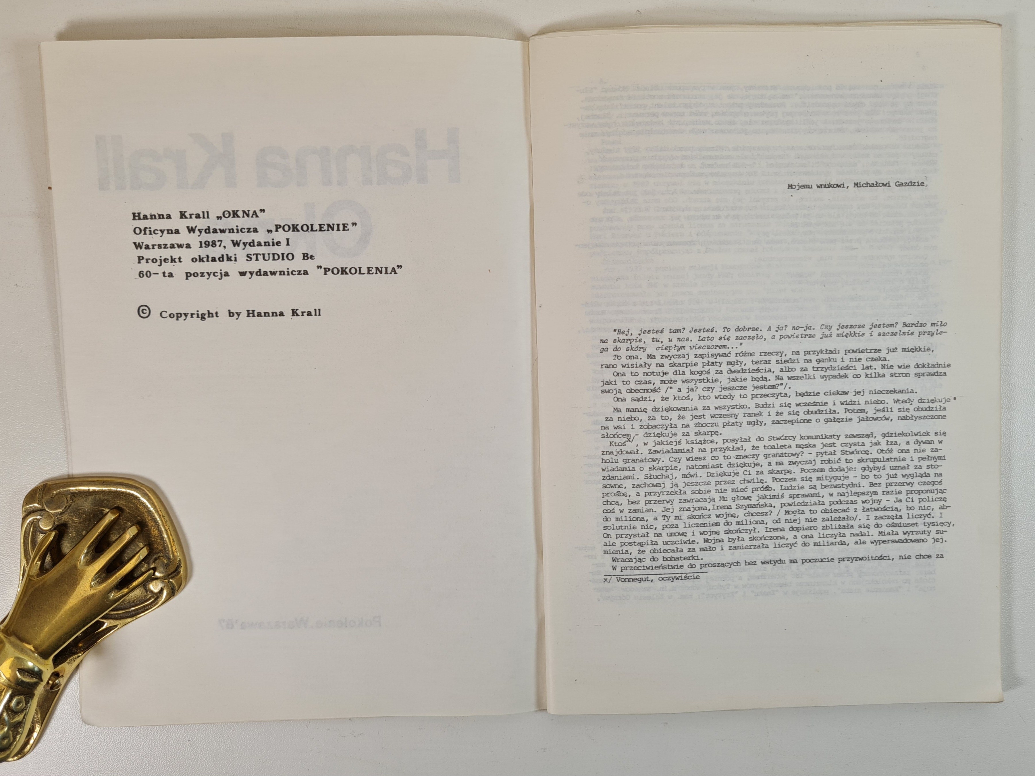 OW Pokolenie, Warszawa 1987. Wym.21x14,5 cm; stron 62. Broszura (nieznaczne zabrudzenia, zagięcia). Karty w dobrym stanie.