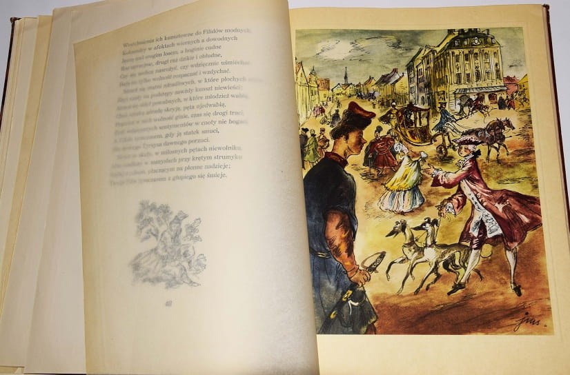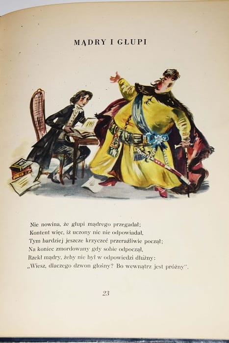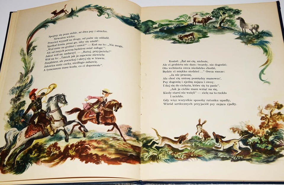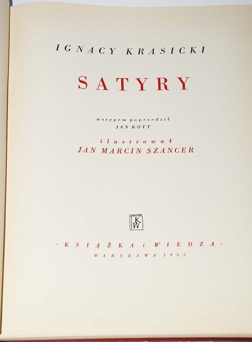 KRASICKI IGNACY - BAJKI, SATYRY. Ilustrował Jan Marcin Szancer. WYDAWNICTWO KSIĄŻKA I WIEDZA, WARSZAWA 1952-54r., 33,5cm. Jan Marcin Szancer ambasador wyobraźni, poz. 187-188. OPRAWA TWARDA PÓŁ-PŁÓCIENNA. STAN Dobry+, otarcia krawędzi oprawy