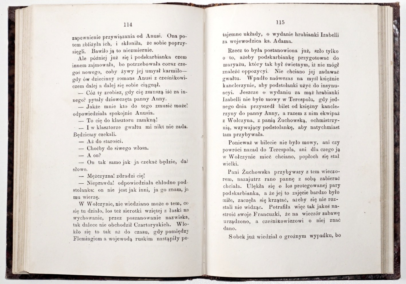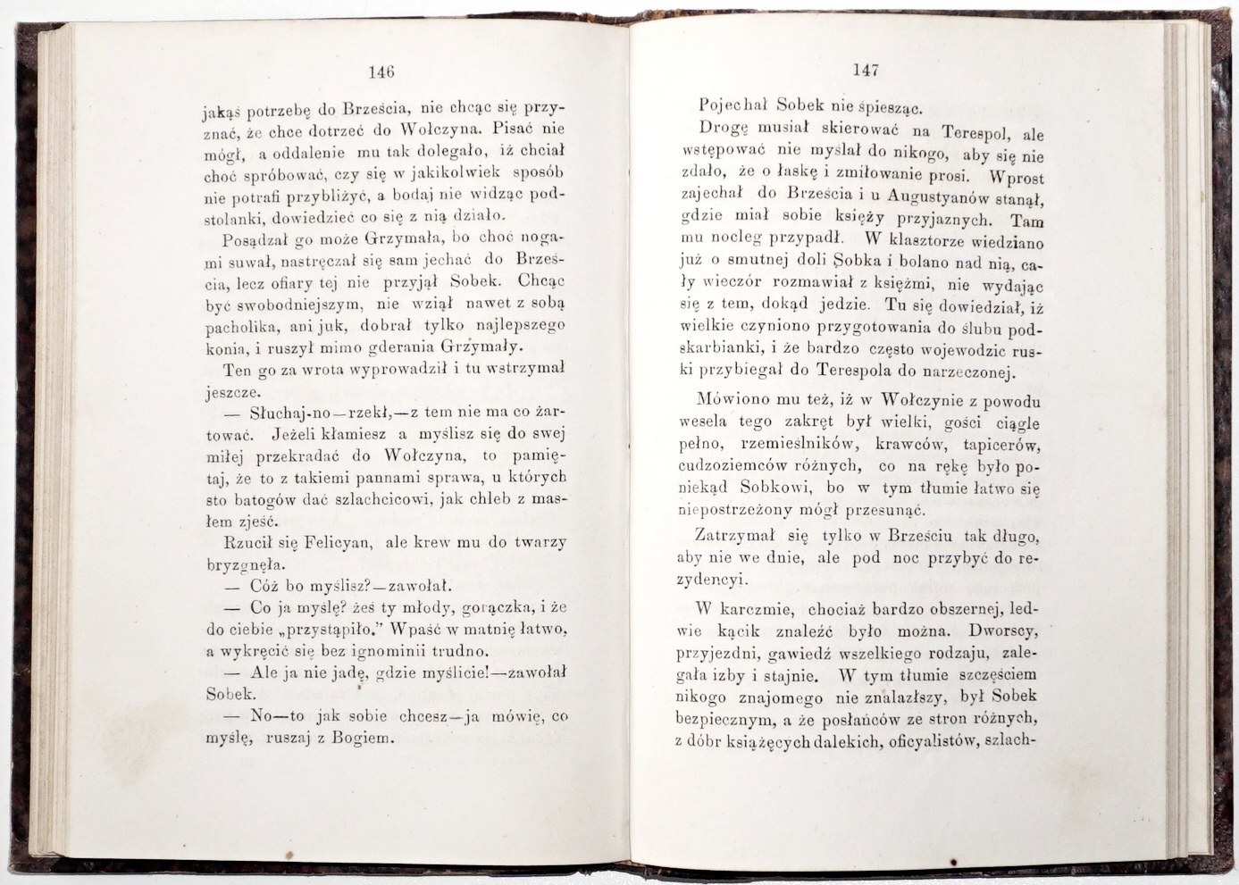 Opisy dworów w Terespolu i w Wołczynie, obrazek burzliwego sejmiku w Brześciu, opowiadanie o ślubie podskarbianki z Czartoryskim, o gospodarce Sobkowej [Kraszewski, Wybór Pism, 1888]