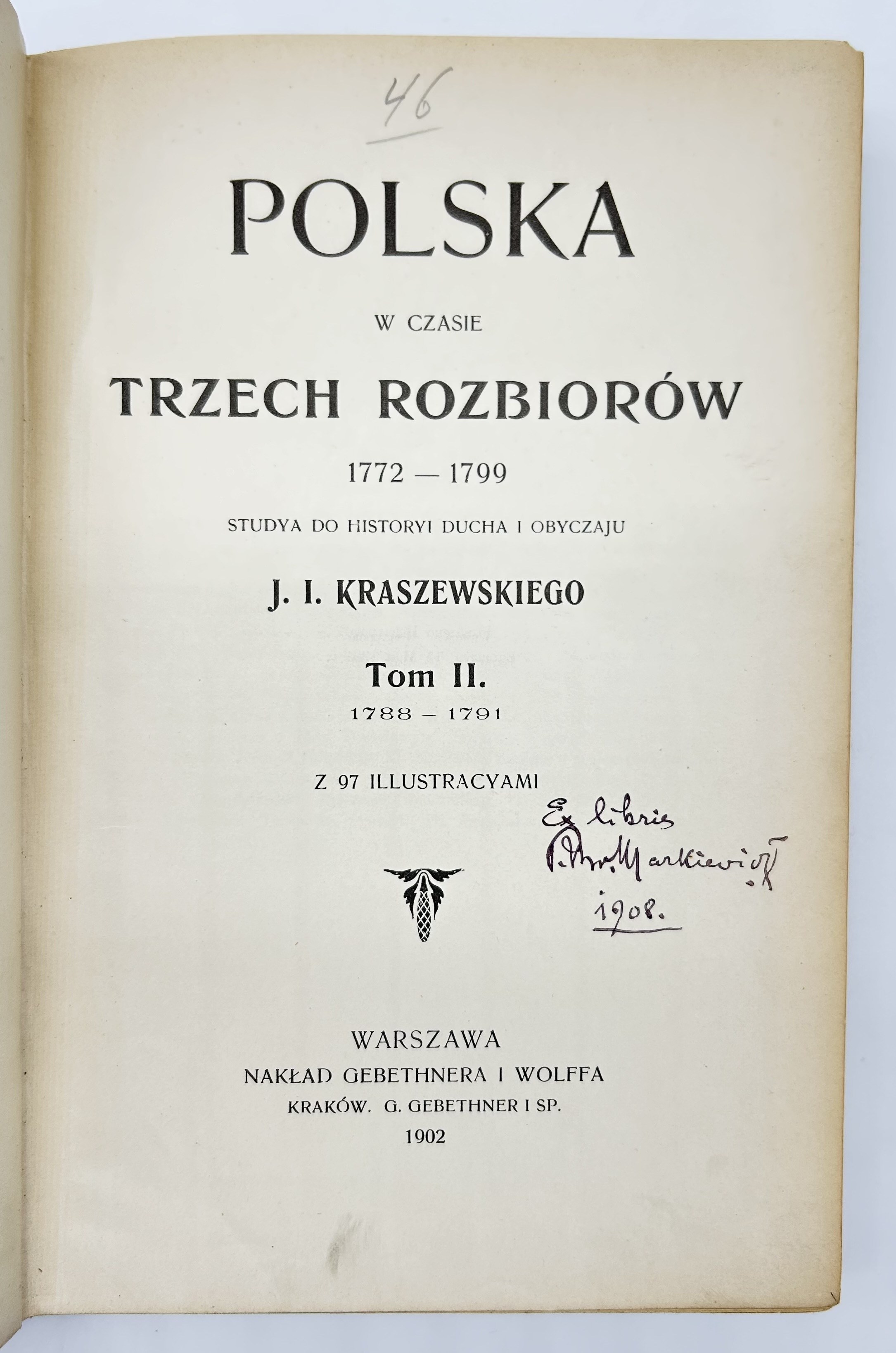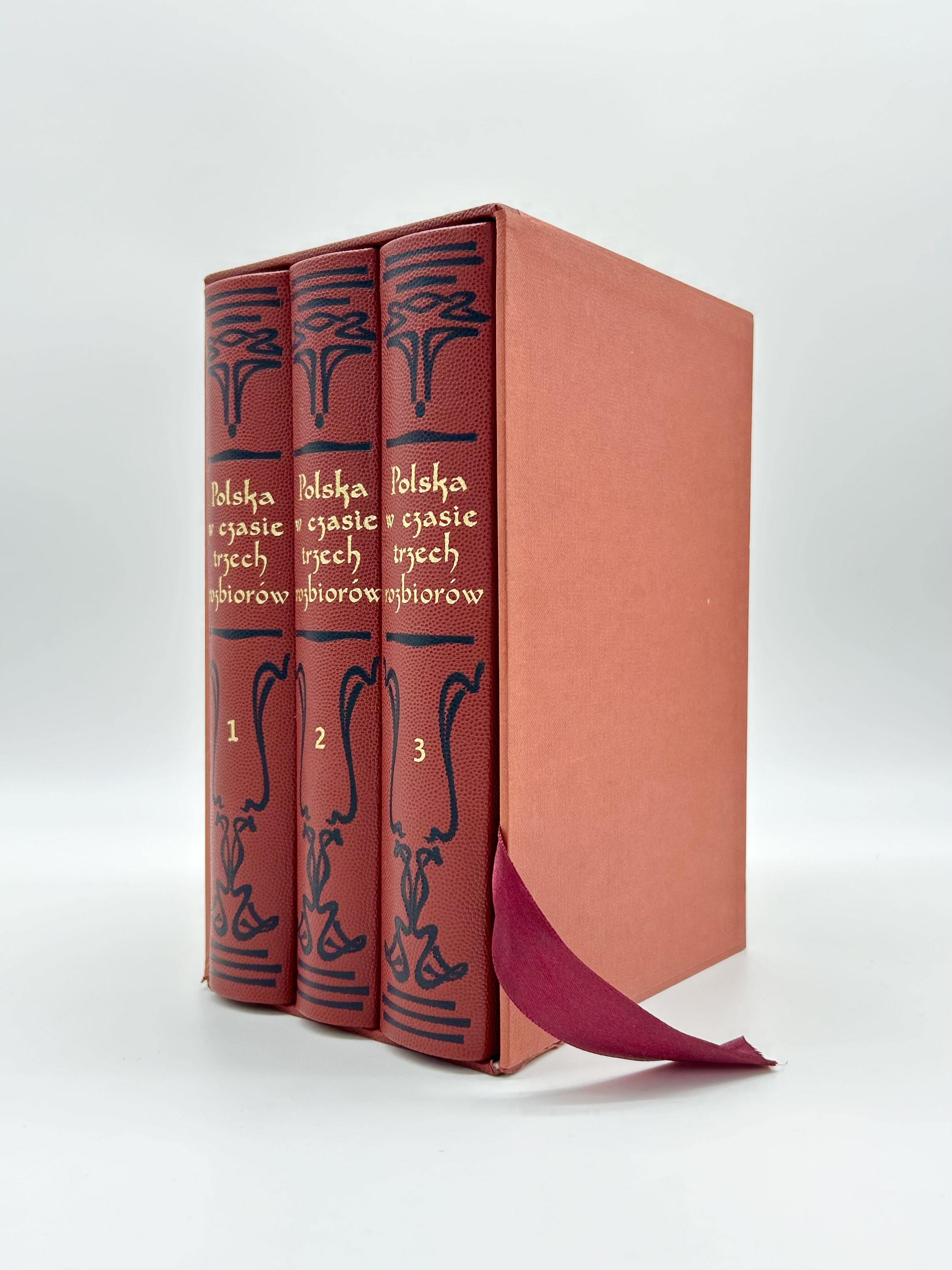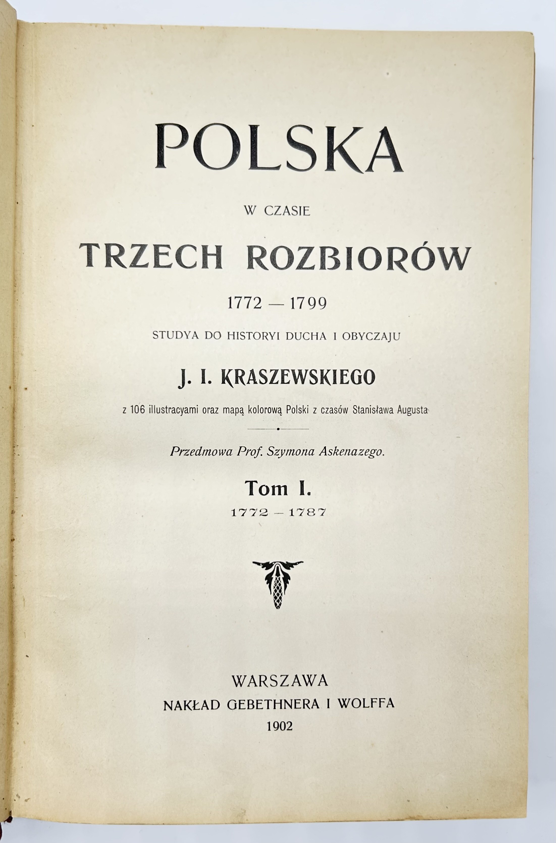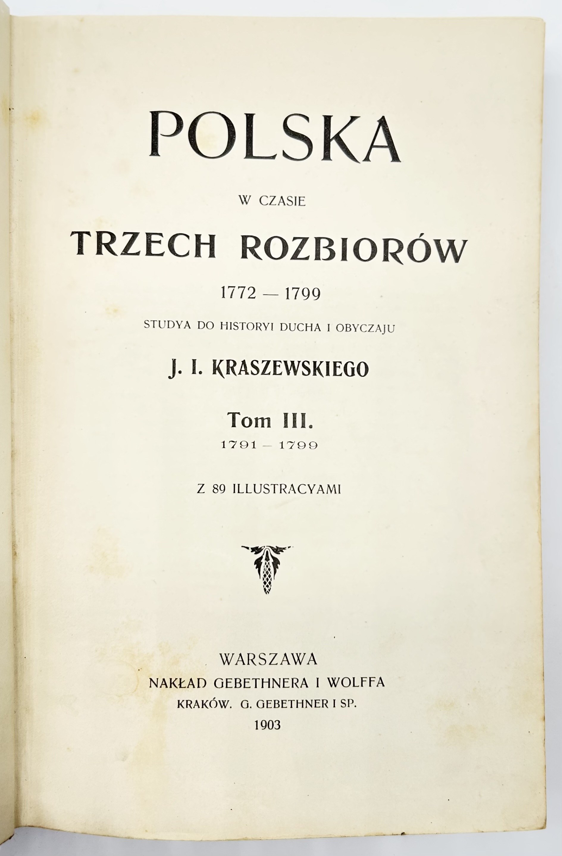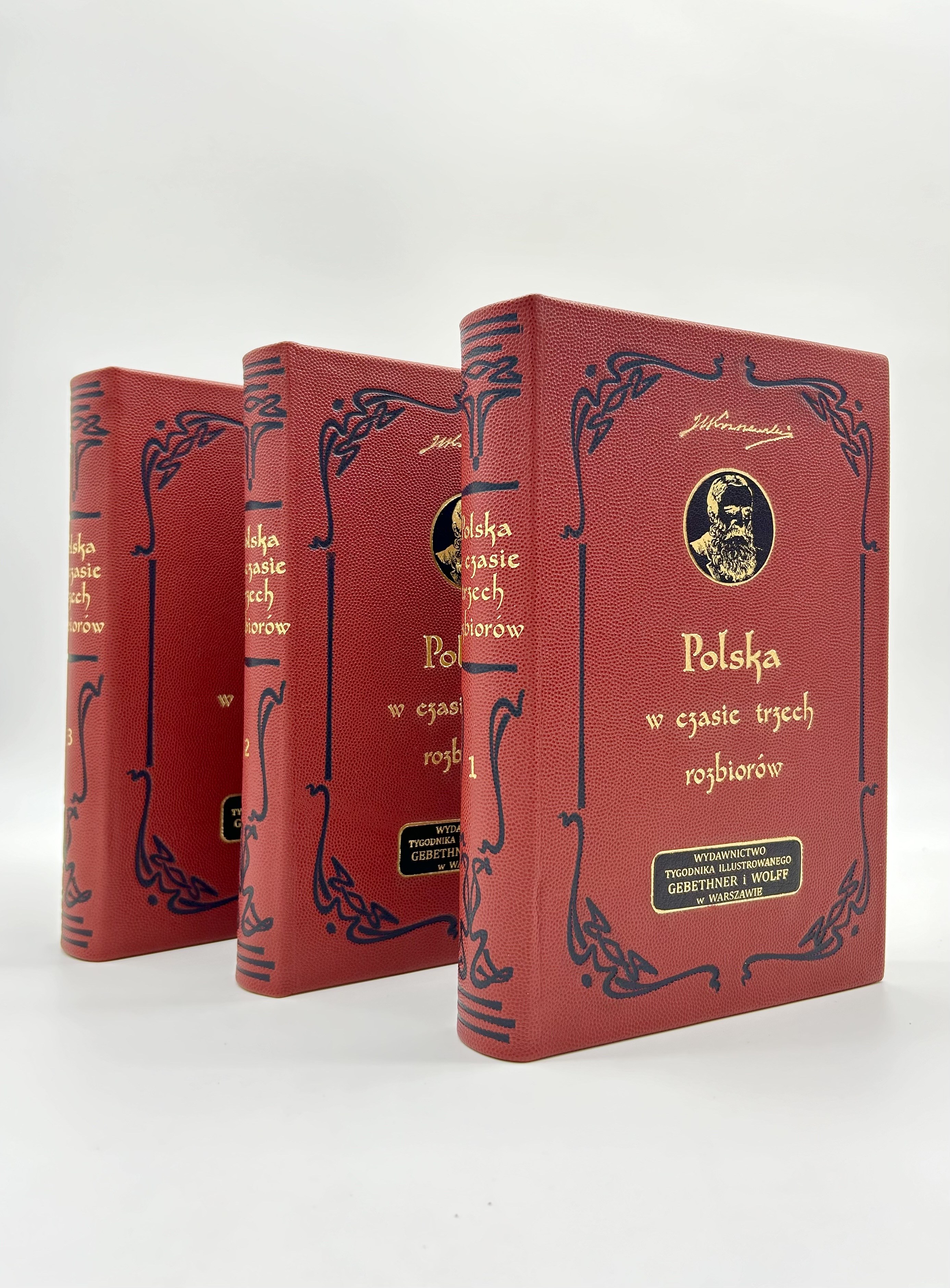 Kraszewski Józef Ignacy/ Polska w czasie trzech rozbiorów 1772-1799 : studya do historyi ducha i obyczaju/ Warszawa 1902-1903/ Wydawnictwo Tygodnika Ilustrowanego Gebethner i Wolff/ oprawa introligatorska w skórę (sygnowana MillaArte)/ s. [4], XVI, 424, [1];[4], 414, [1];[4], 563, [1]/ czarno-białe ilustracje w tekście, rozkładana mapa w tomie pierwszym/ stan bardzo dobry, niewielkie ubytki rogów między s.19-67 w tomie pierwszym.