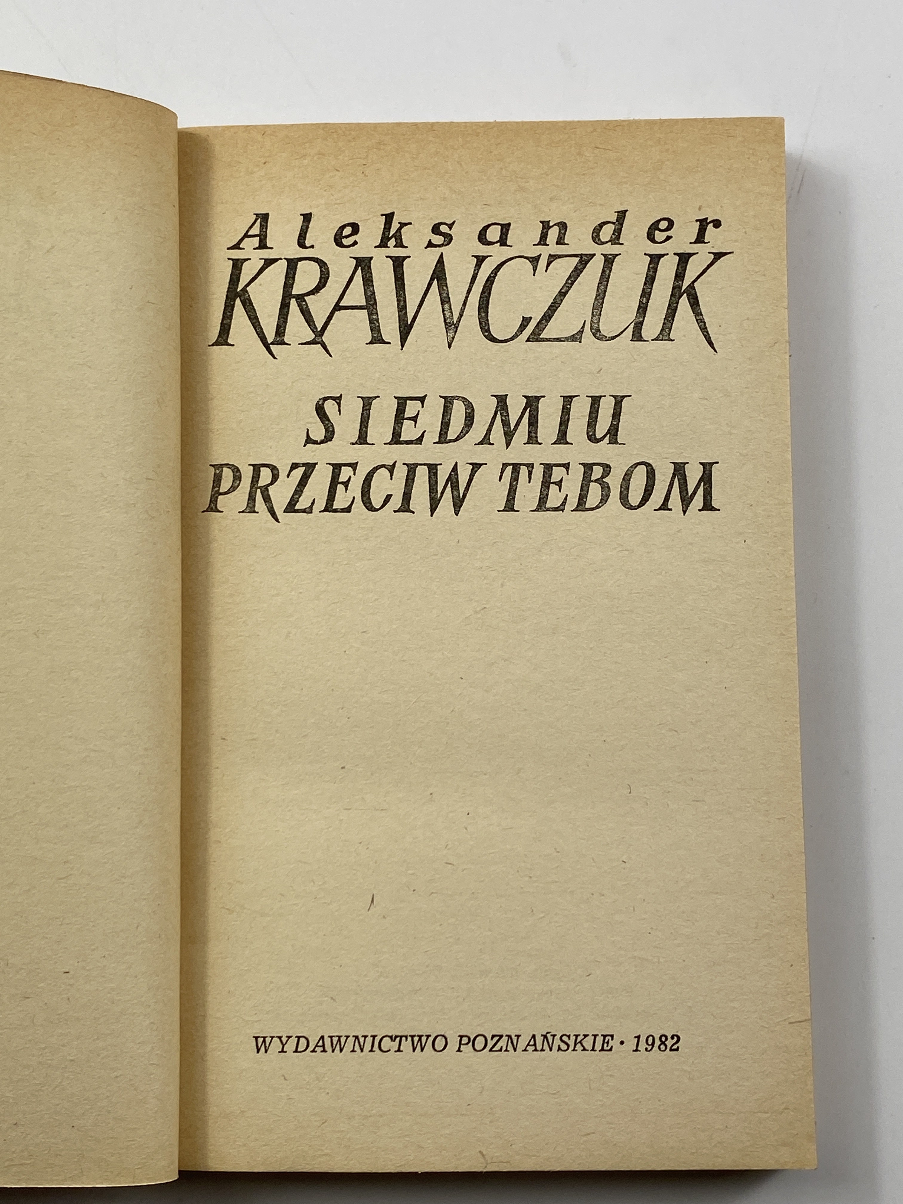 Krawczuk Aleksander, Siedmiu przeciw Tebom, Poznań: Wydaw. Poznańskie, 1982, s. 239, [5], wymiary 12,5 x 19,5 cm. Okładka broszurowa z oryginalną obwolutą. Niewielkie otarcia obwoluty.