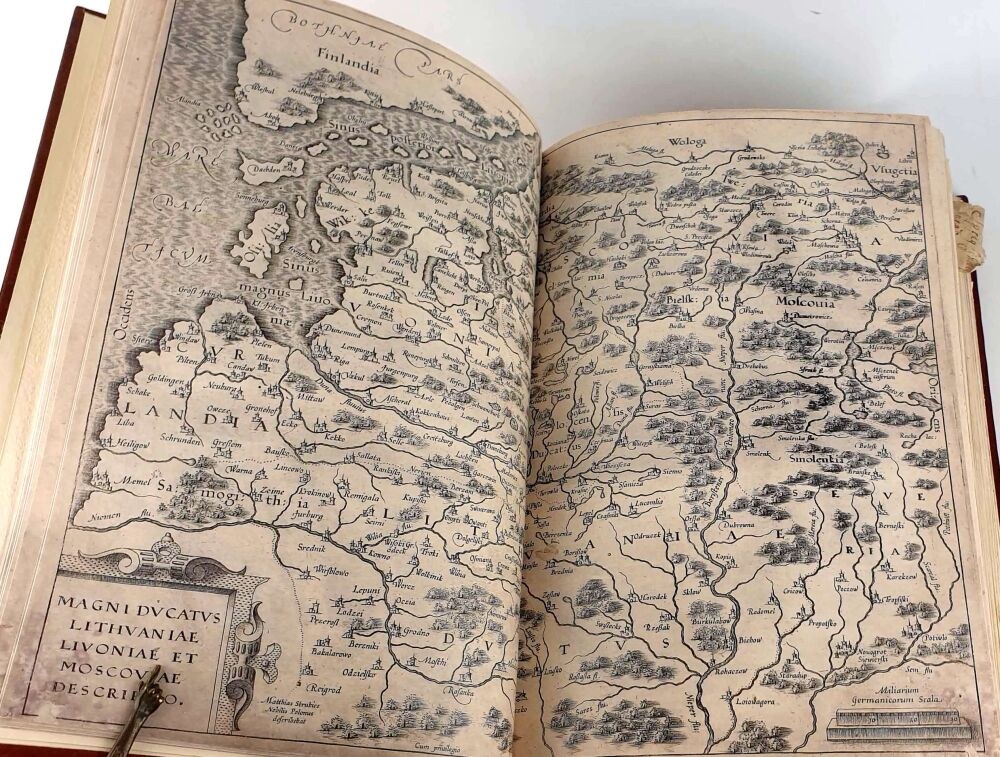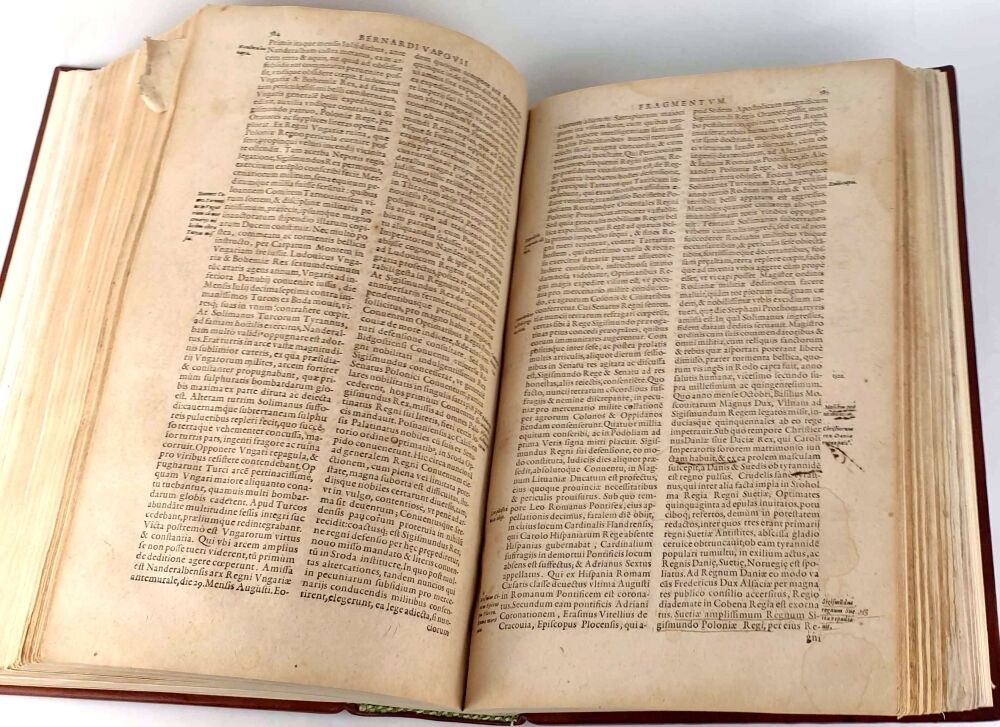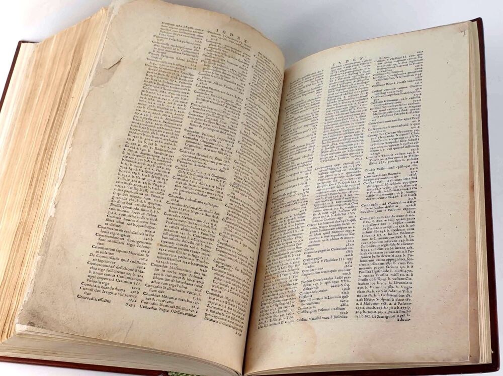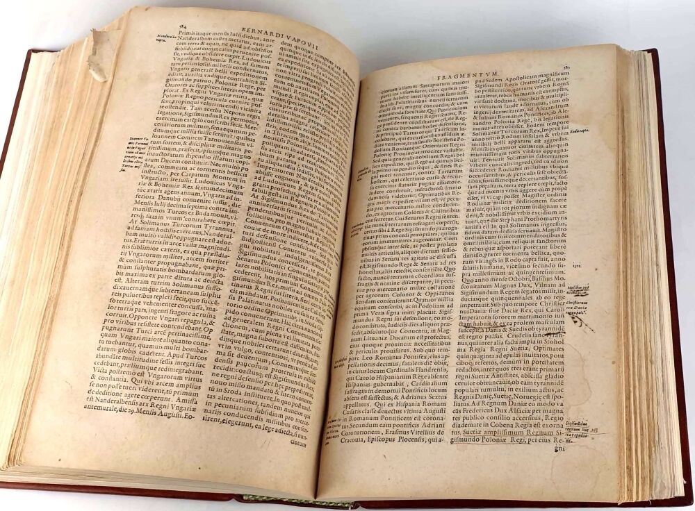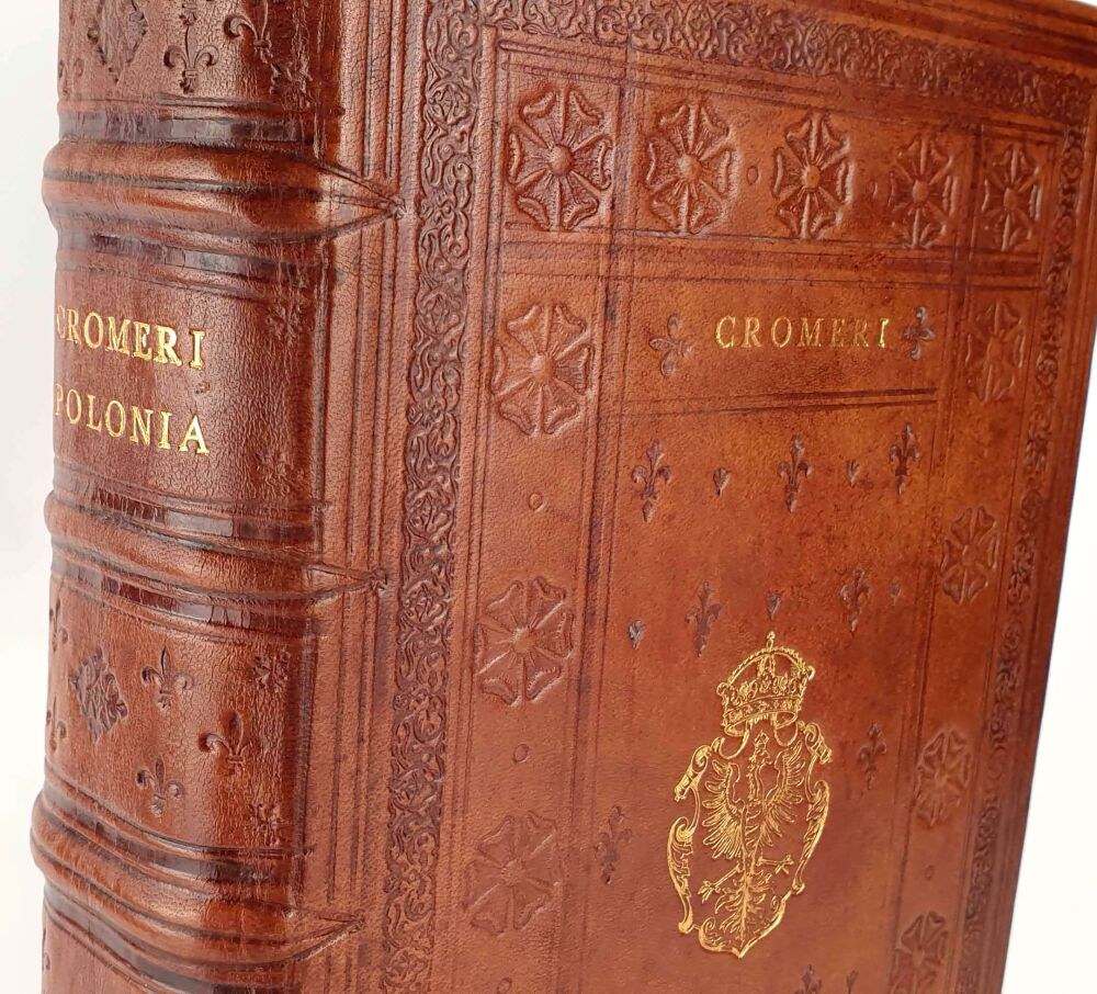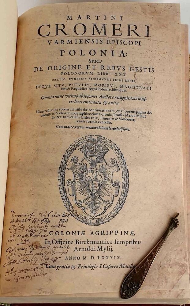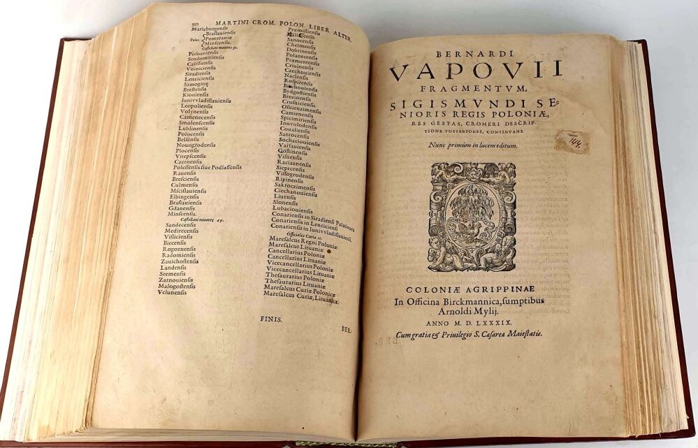 Coloniae Agrippinae [Kolonia] 1589. In Officina Birkmannica, sumptibus Arnoldi Mylij, folio, k. [10], s. 846, k. [27], mapy 2 (mapa Polski Wacława Grodeckiego oraz mapa Litwy Macieja Strubicza, winietki, inicjały (drzeworyty)
