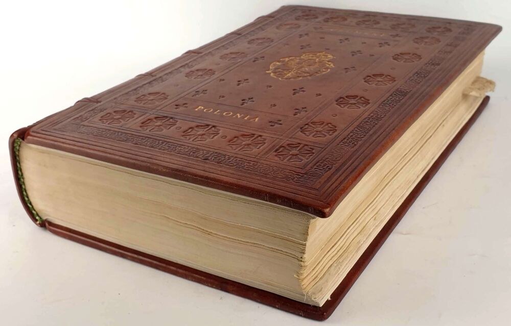 TWARDA OPRAWA WSPÓŁCZESNA PEŁNA SKÓRA NA DESCE Z TŁOCZENIAMI I ZŁOCENIAMI STYLIZOWANA NA EPOKĘ, RĘCZNIE SZYTA KAPITAŁKA