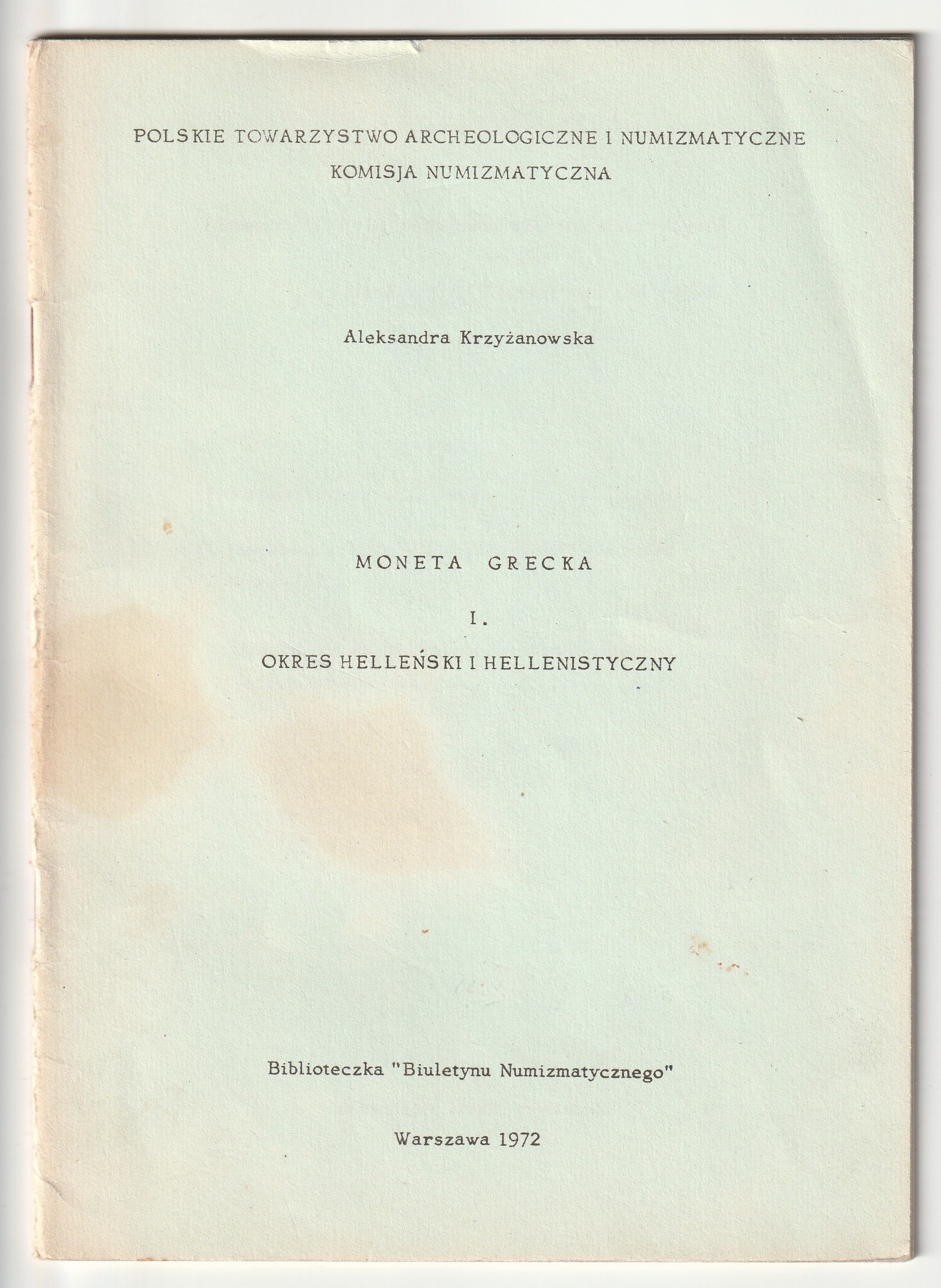 KRZYŻANOWSKA Aleksandra, Moneta grecka, I. Okres helleński i hellenistyczny, II Emisje okresu Cesarstwa Rzymskiego, wyd. PTAiN, Warszawa 1972 i 1982, dwa zeszyty, cz. I: str. 26 str+ 6 nn z 36 rys. cz.-b., cz. II: str. 34 (na str. 31-34: 30 rys. cz.-b.) oprawa miękka w cz. I pożółkła, st. bdb.; wym. ok. 145x200 i 140x200 mm; razem 2 sztuki.