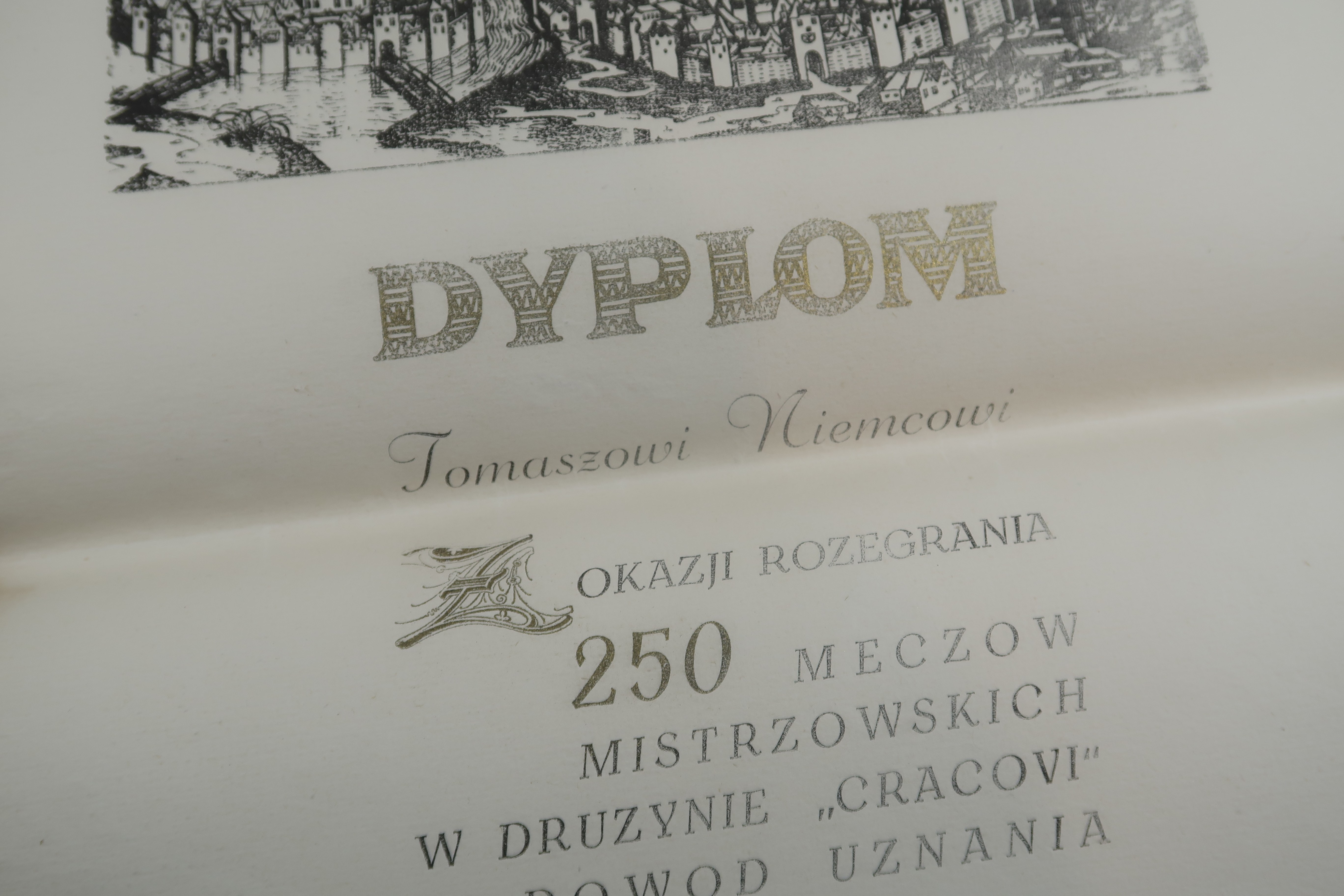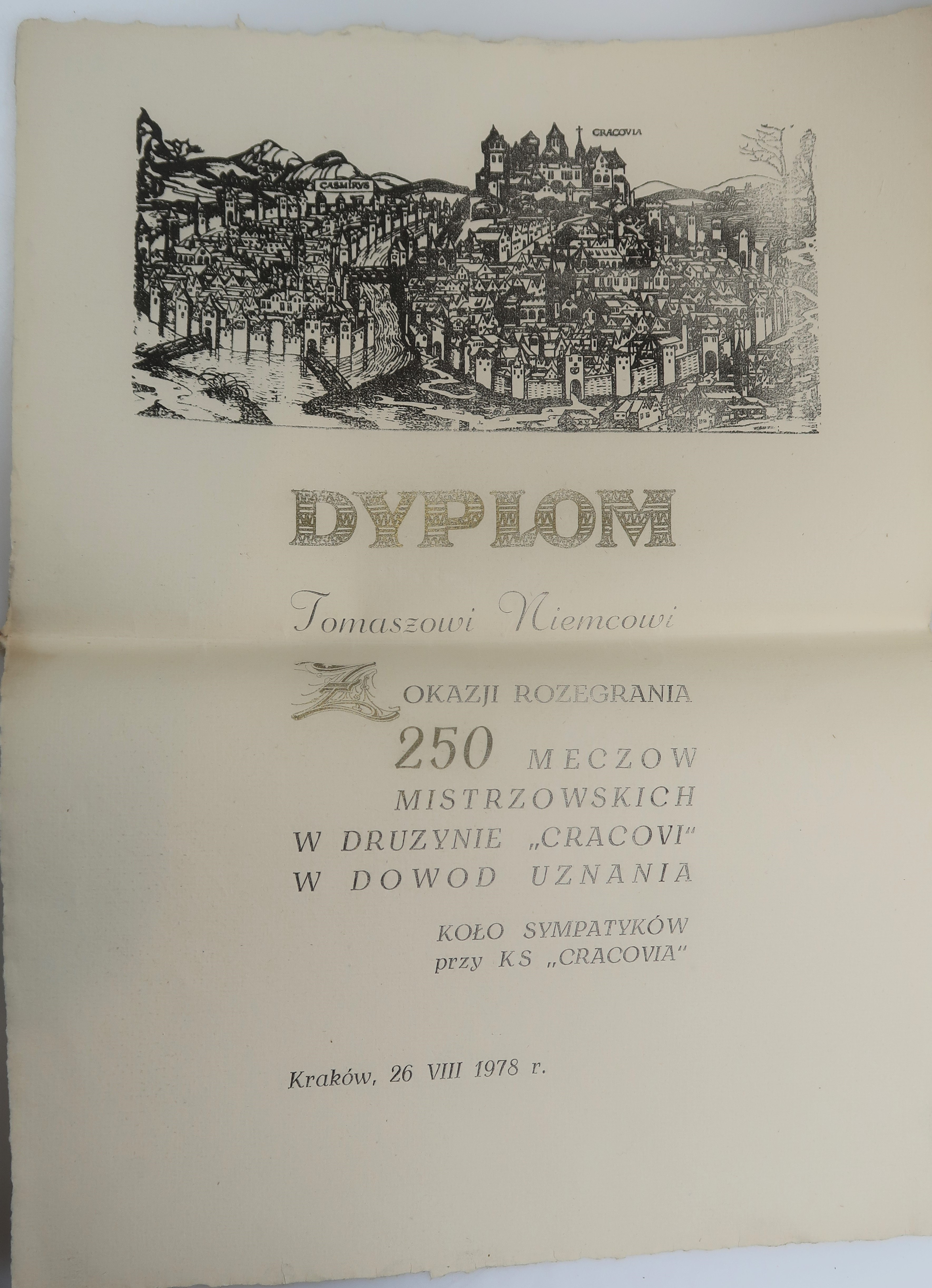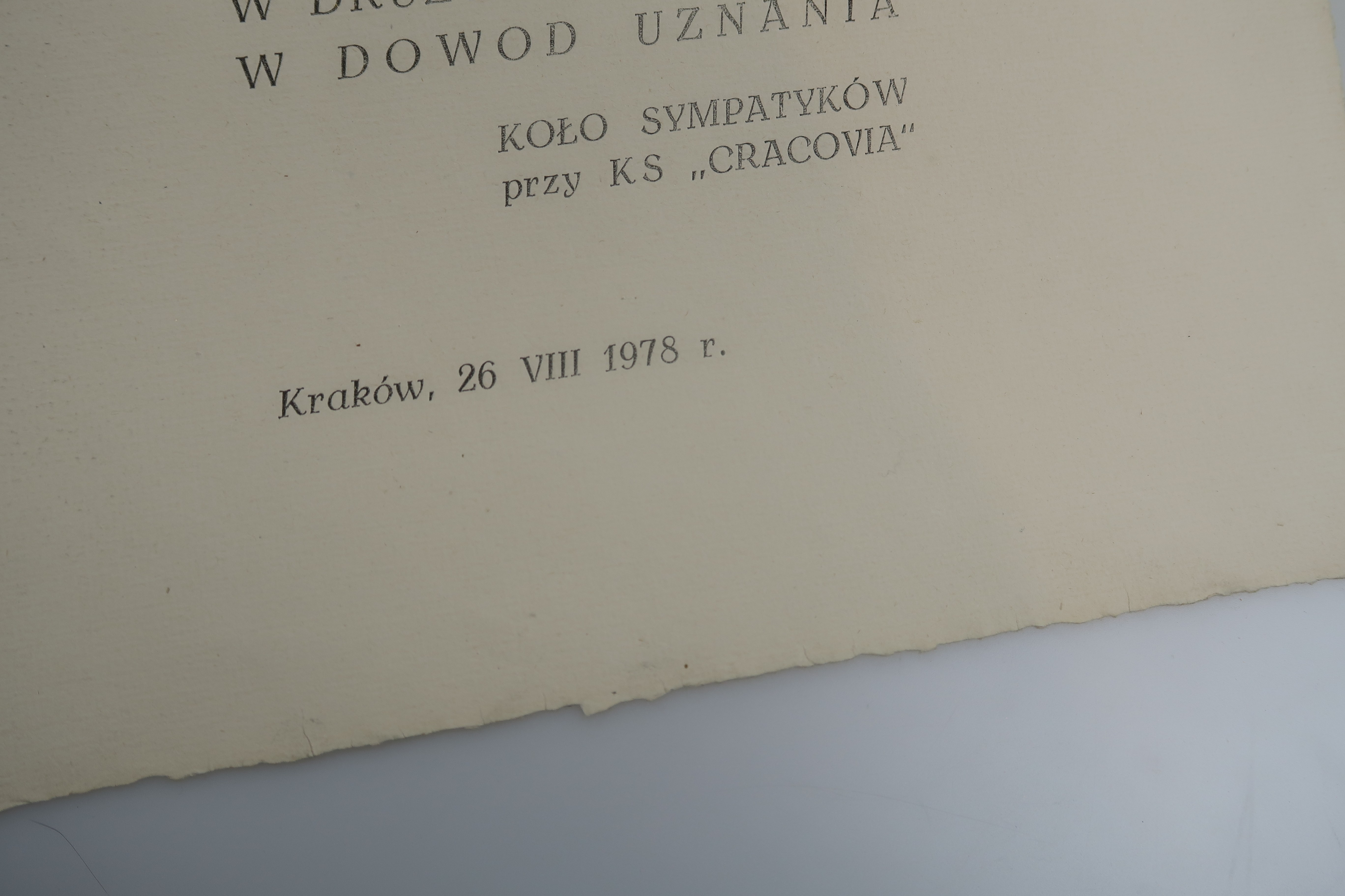 w dowód uznania KOŁO SYMPATYKÓW przy KS "Cracovia", Kraków, 26 VIII 1978 r., wym. 30 x 40, papier czerpany.