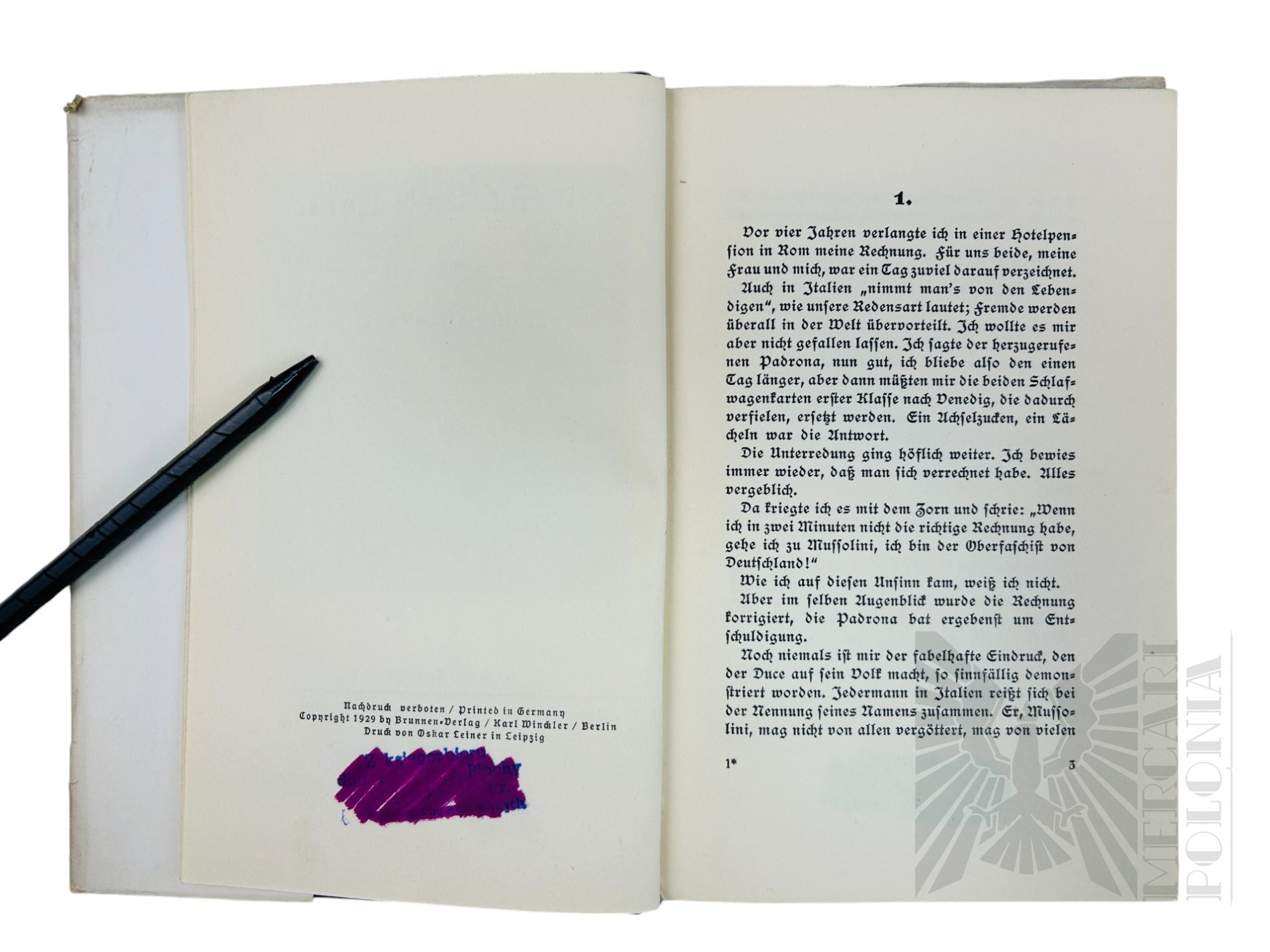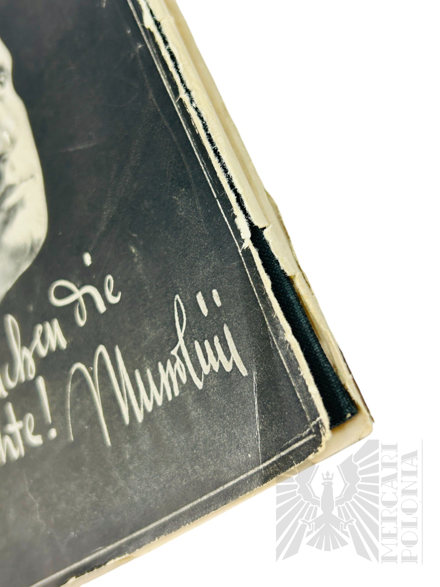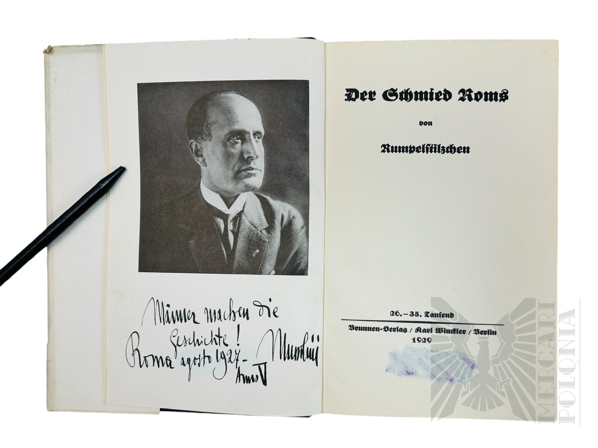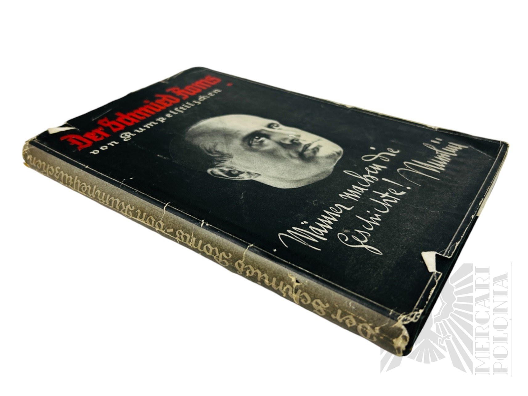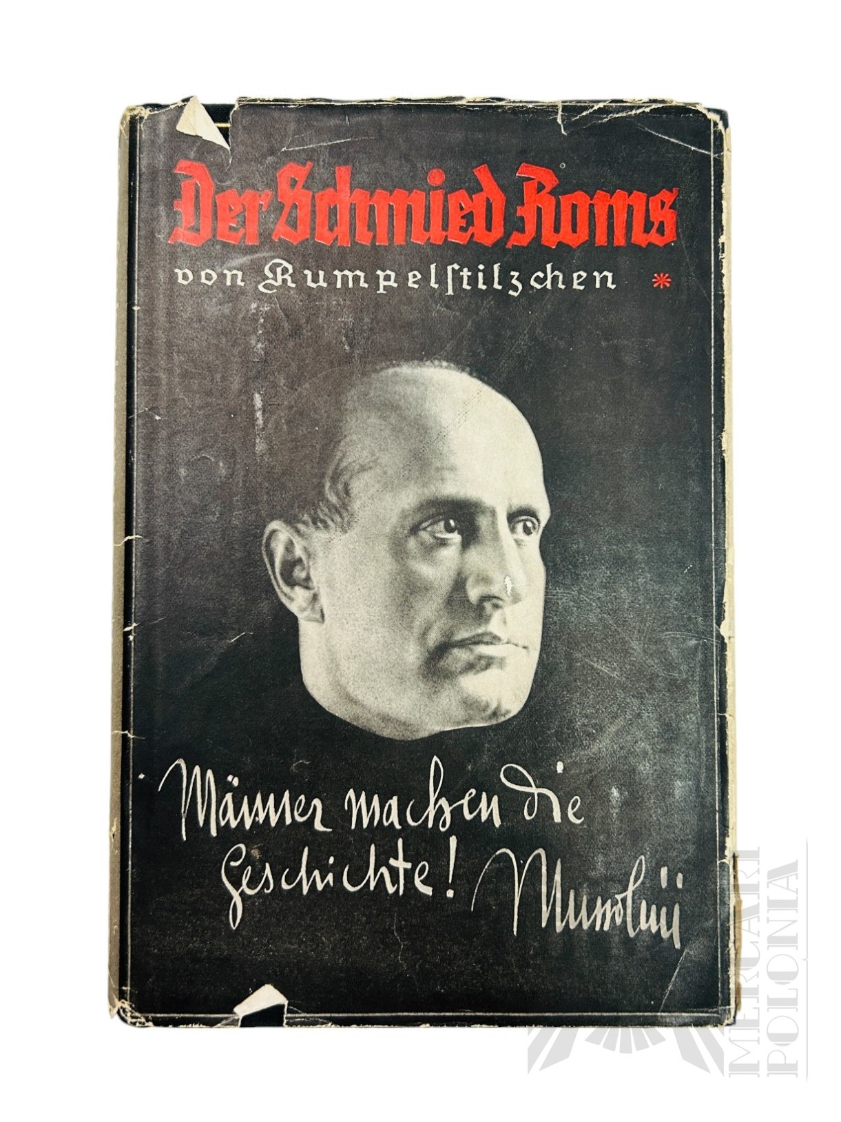 Książka z obwoluta z wizerunkiem Benita Mussoliniego.