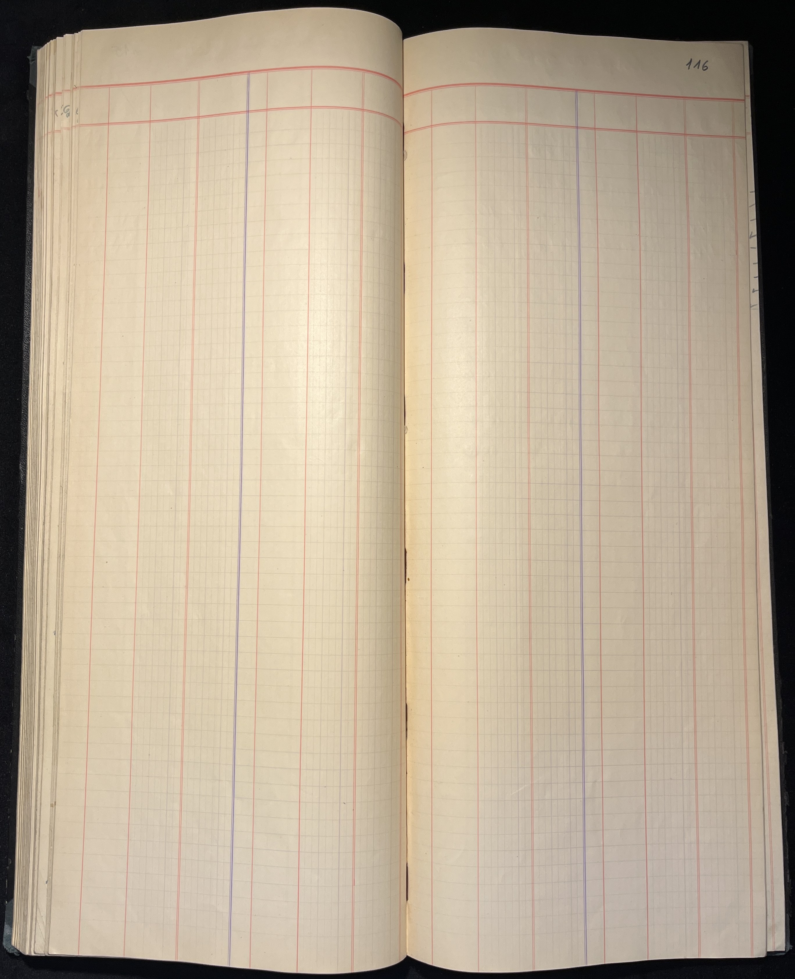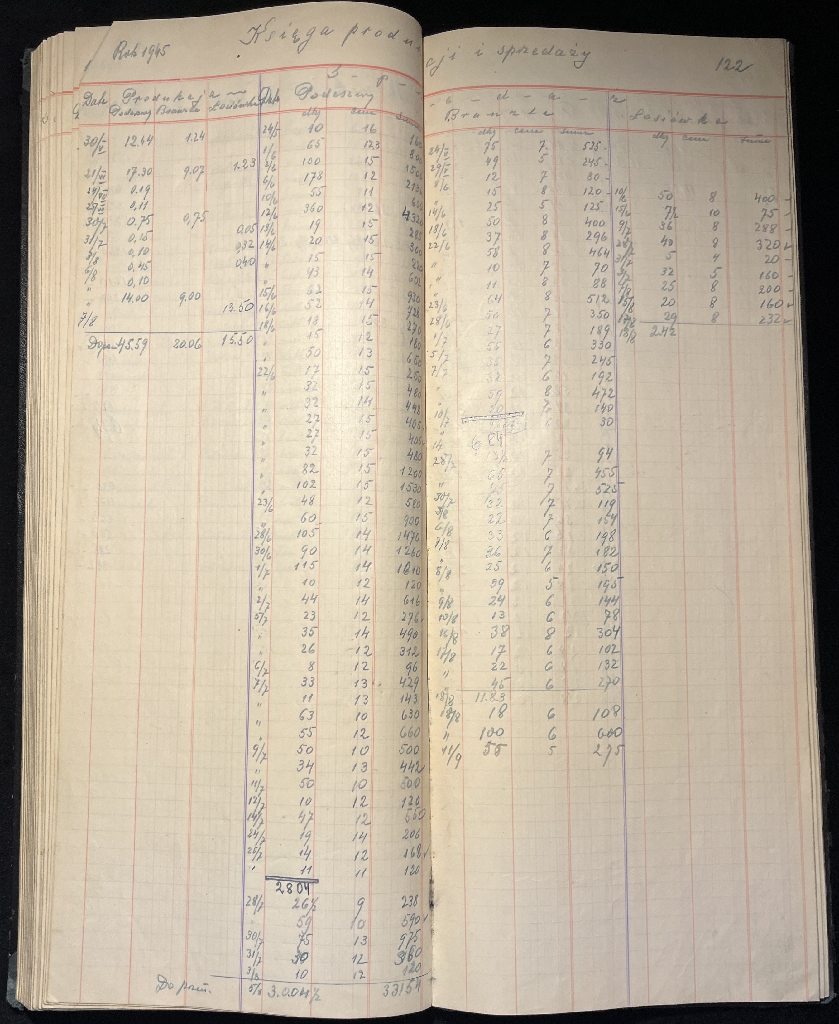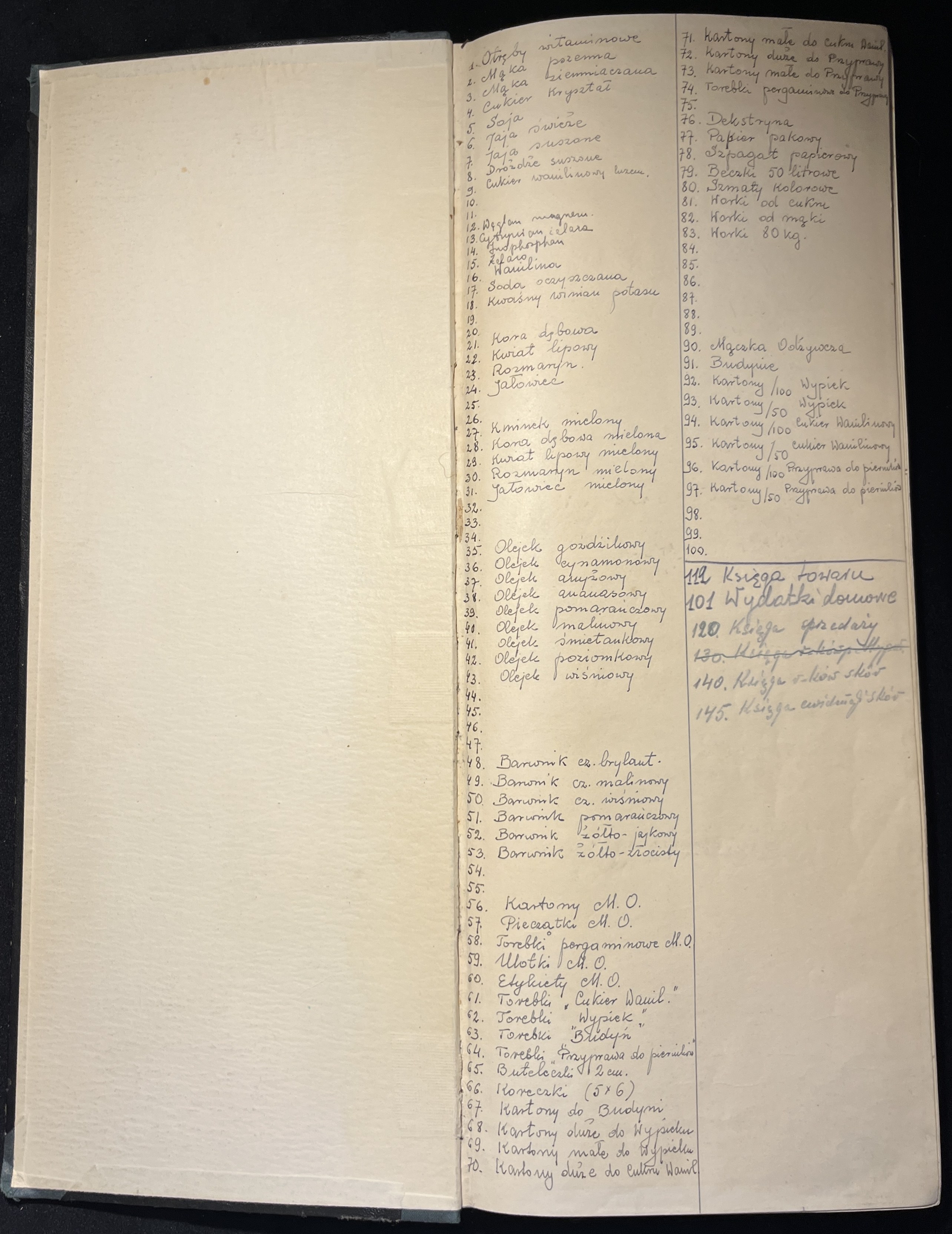 Odręcznie napisana księga przychodu i rozchodu z listą towarów.