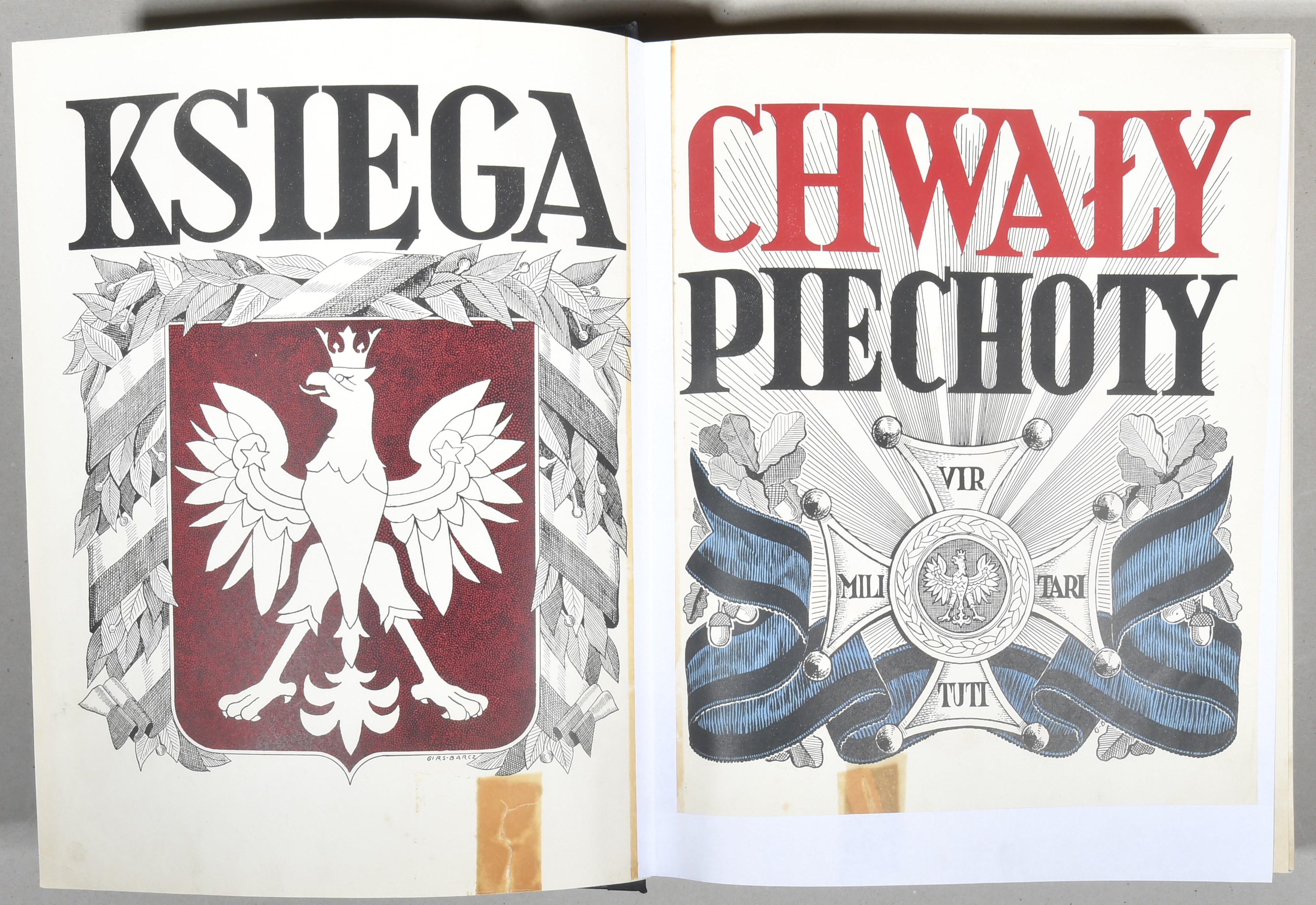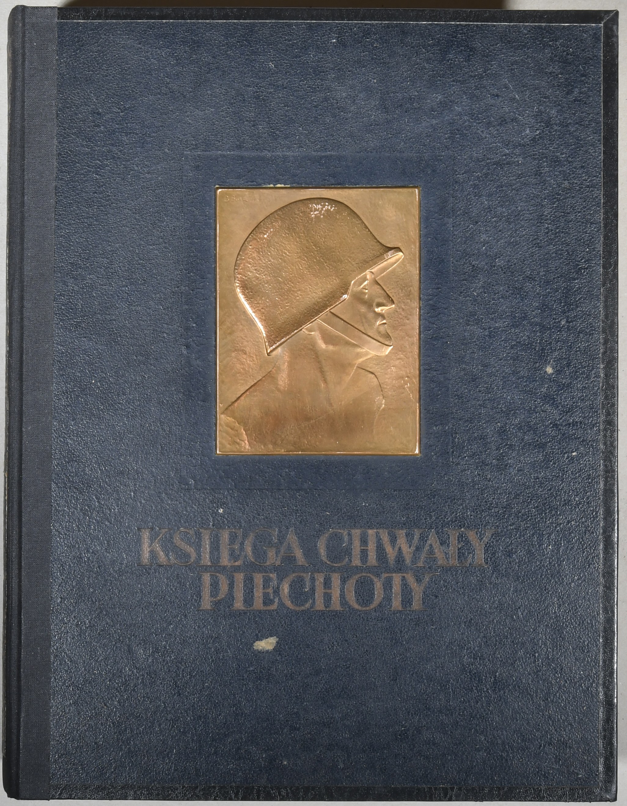 Druk. Zakł. Wyd. M. Arct S. A. Folio, s. XI, 462, ilustr.: rysunki, fotografie, szkice, portrety, 20 kolor. tablic, inicjały. Metryki chwały pułków piechoty. Oprac. kpt. S. Jellenta, kpt. w st. sp. Z. Kowalewski, kpt. M. Różycki, pod kier. ppłk. St. Rutkowskiego, s. nlb. 124, opr. oryg. z plakietą żołnierza, naprawiana: współcześnie oprawiony płótnem grzbiet z naklejonym przyciętym oryg., zachowane oryg. części wyklejek naklejone na współcz., 2 pierwsze karty podklejone, poza tym stan dobry. Plakietka z popiersiem żołnierza proj. B. Barcz, opr. Zakł. Introl. B. Zjawińskiego w Warszawie. Proj. oprawy i układ graficzny dzieła A. Girs i B. Barcz. Tablice kolorowe: Br. Gembarzewski, St. Haykowski, A. Trzeszczkowski. Księgę zamyka Lista kawalerów orderu wojennego "Virtuti Militari". Księga pamiątkowa ukazująca chwałę oręża polskiego z bogatą, imponującą ikonografią.
