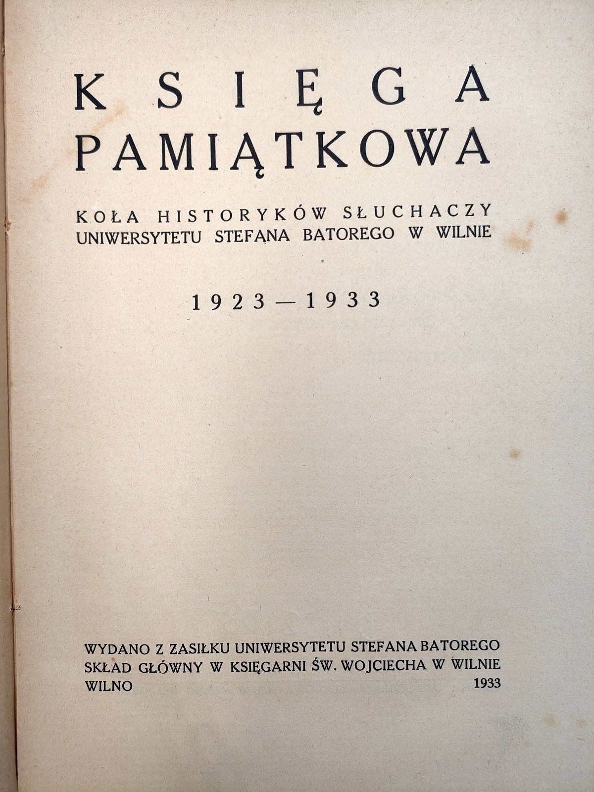 Księga Pamiątkowa Koła Historyków i Słuchaczy Uniwersytetu Stefana Batorego w Wilnie 1923 - 1933, Wilno 1933 [ Alma Mater Vilensis]