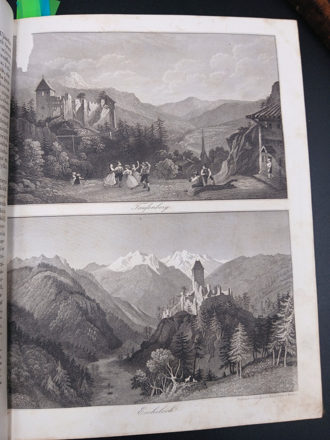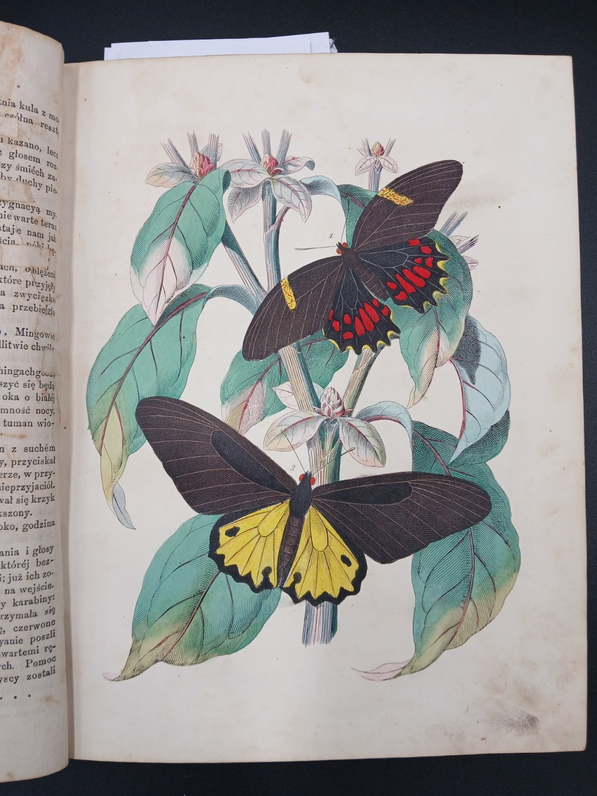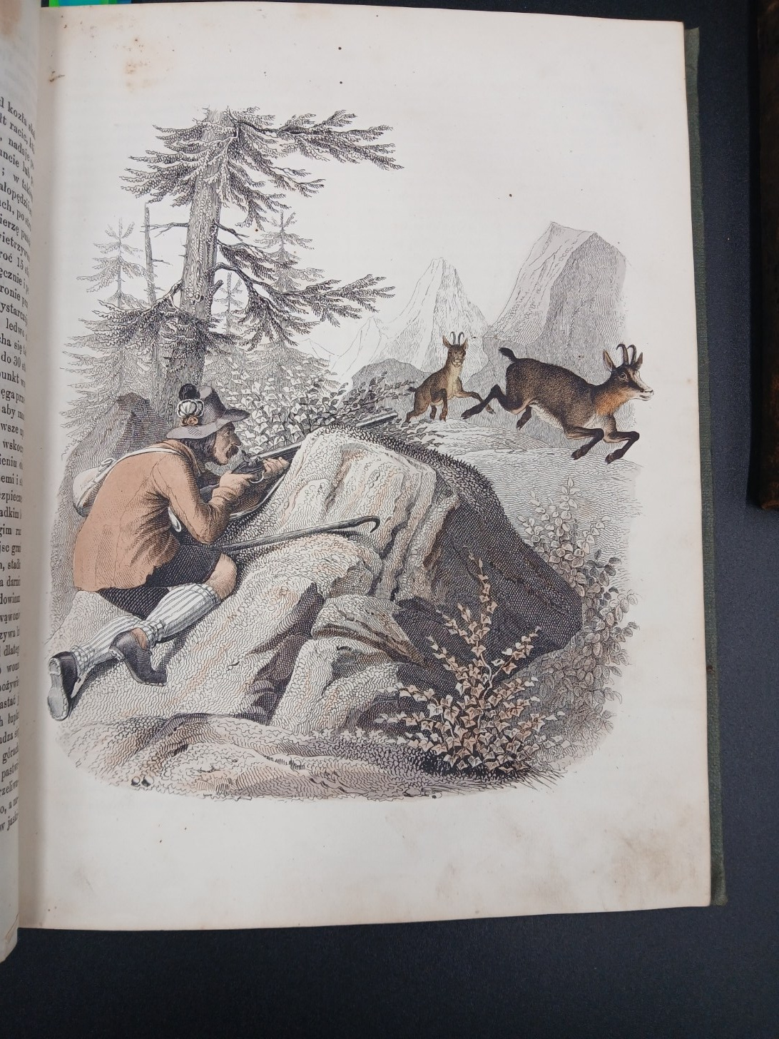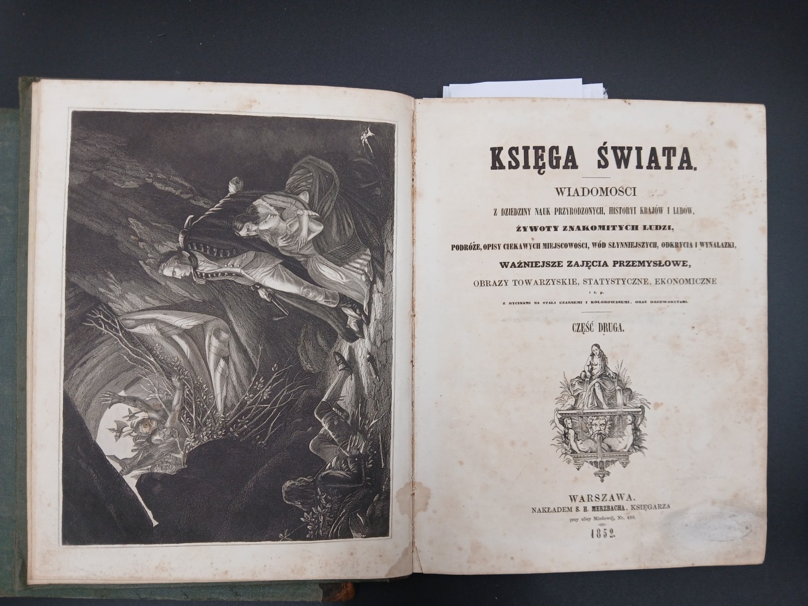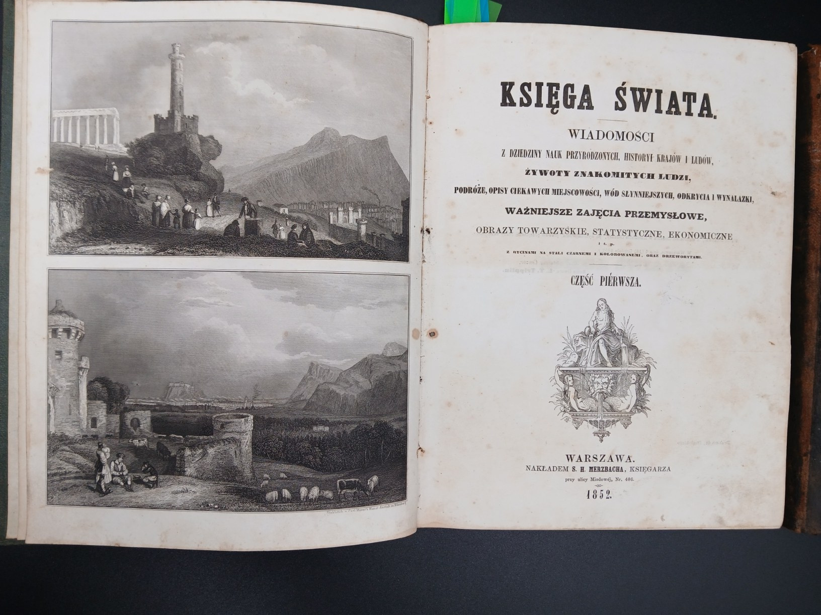 KSIĘGA świata. Wiadomości z dziedziny nauk przyrodzonych, historyi krajów i ludów, żywoty znakomitych ludzi, podróże, opisy ciekawych miejscowości, wód słynniejszych, odkrycia i wynalazki, ważniejsze zajęcia przemysłowe, obrazy towarzyskie, statystyczne, ekonomiczne, i t. p. Z rycinami na stali czarnemi i kolorowanemi, oraz drzeworytami. Warszawa 1852. Nakładem S. H. Merzbacha część pierwsza i druga.