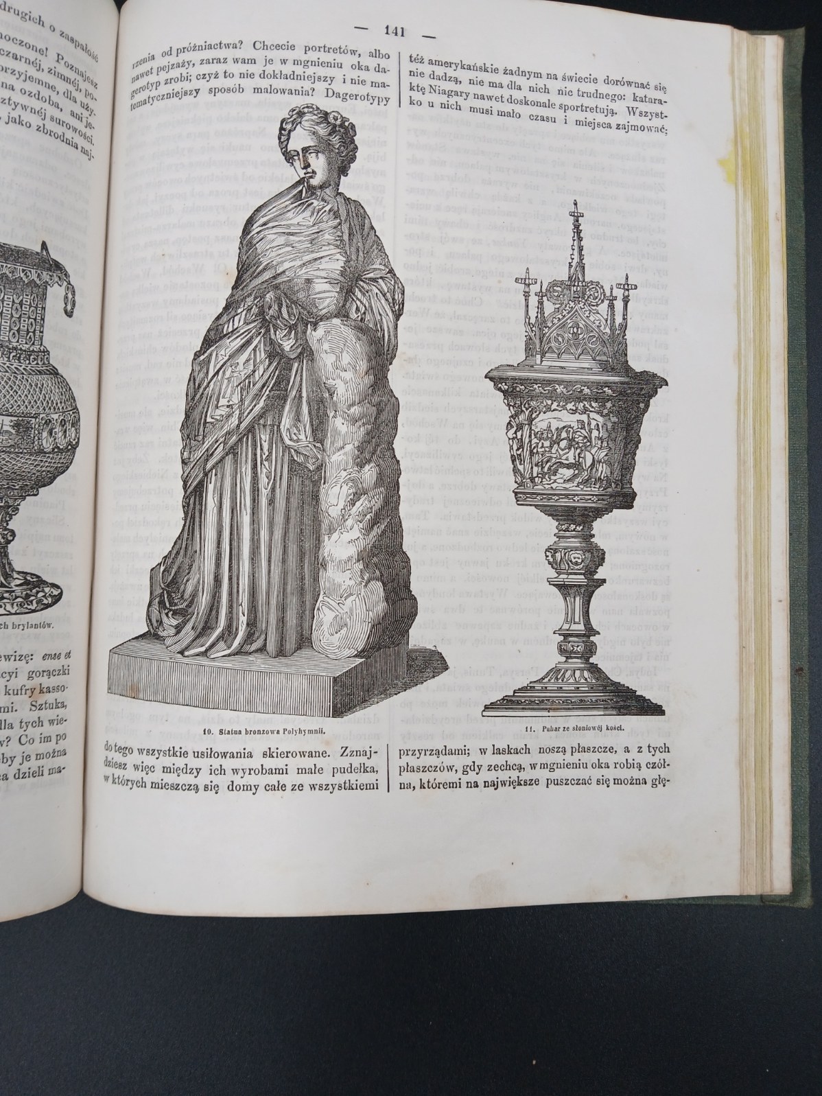 SPIS RZECZY (wybór) : Szkocya, Czerniaków, Tyrol, Wyspa Borneo i jej mieszkańcy, Tydzień spędzony na Wyspach Hebrydzkich (cz. 2), Paryż, Goździk korzenny i drzewo muszkatowe, Irlandya, Koza skalnica, Linneusz, Sokoły i ich jaja, Kilka słów o telegrafach, Obrządki religijne w Hindostanie, O magnetyzmie zwierzęcym i jasnowidzeniu, Wenecya, Wielka wystawa całego świata w Londynie, Szlachetne metale, Kopacze złota na brzegach San Sakramento, Gatunki kruka czyli wrony, Ogniotrwałość ciała ludzkiego, Warotryski samorodne w Islandyi, Hyppopotam, Podróż w pustyni Sahara, Śmierć krokodylom, Połów wielorybów, Humań, Podróż fantastyczna balonem, Washington, Łoś, Trąby wodne, Japonia; Księżyc, jego powierzchnia, mieszkańcy i wpływ na ziemskie stosunki, Szafran, Wycieczki naukowe po Paryżu, Grzechotnik okropny i drózd żartowniś, Motyle . Poza tablicami drzeworyty sztorcowe w tekście.