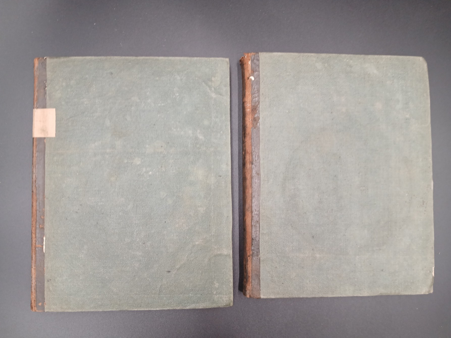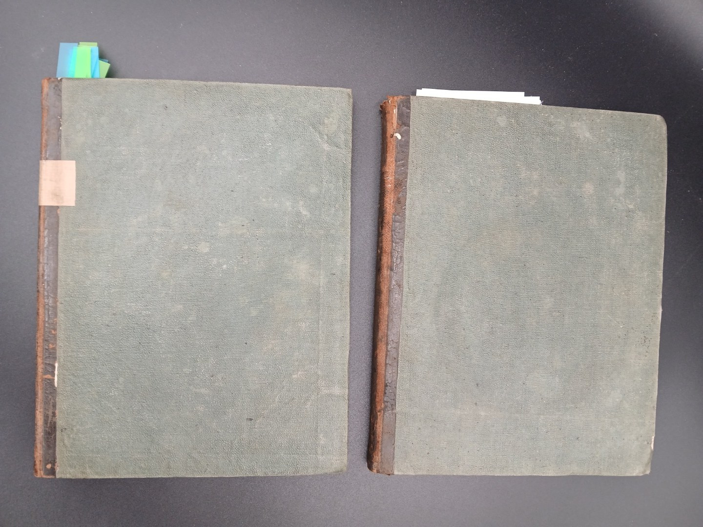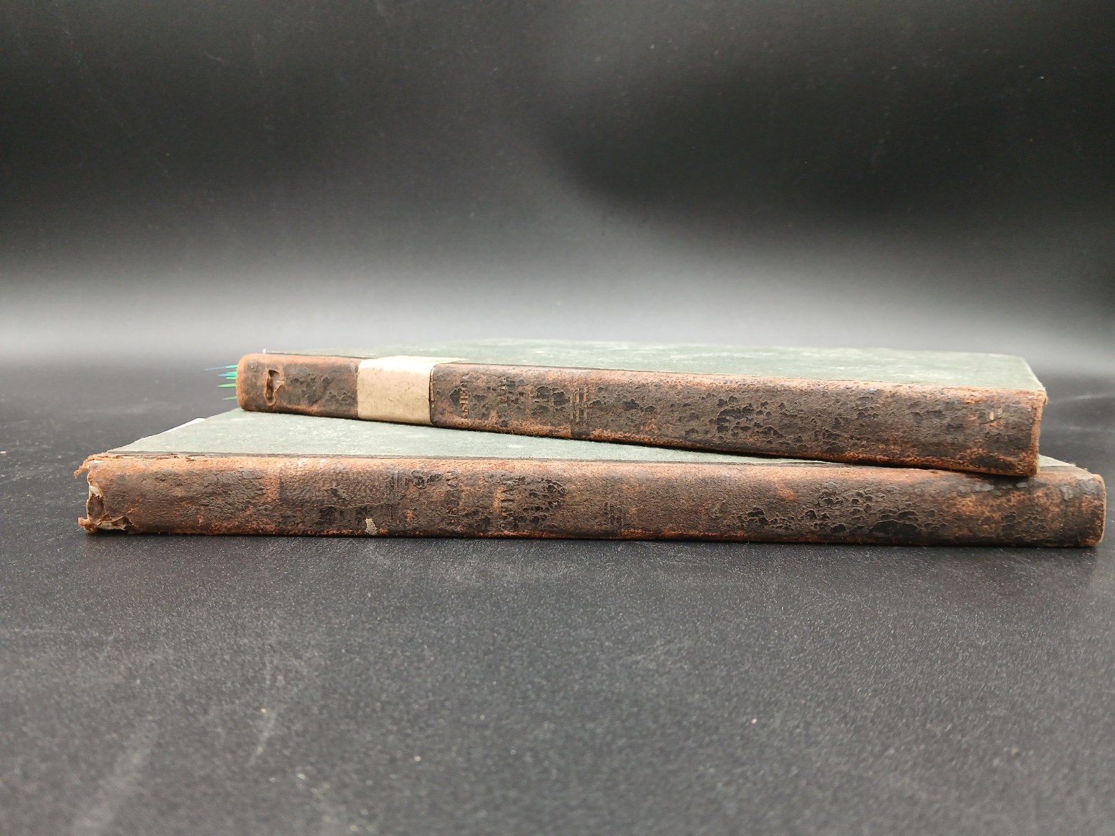 jednolita oprawa obu tomów, półskórki z epoki, zażółcenia i zaplamienia kart, w części 2 ślady po zalaniu na ostatnich stronach, przedarcie karty 401-402 na długości 9 cm, ślady po starych pieczęciach własnościowych, nadpęknięcia grzbietów, poza tym stan dobry.