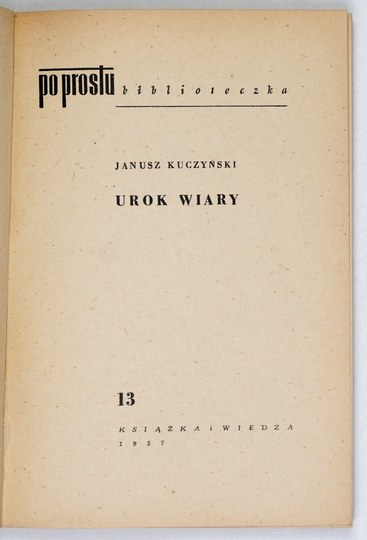 KUCZYŃSKI Janusz - Urok wiary. Warszawa 1957. Książka i Wiedza. 16d, s. 115, [1]. brosz. Biblioteczka "Po Prostu", nr 13.