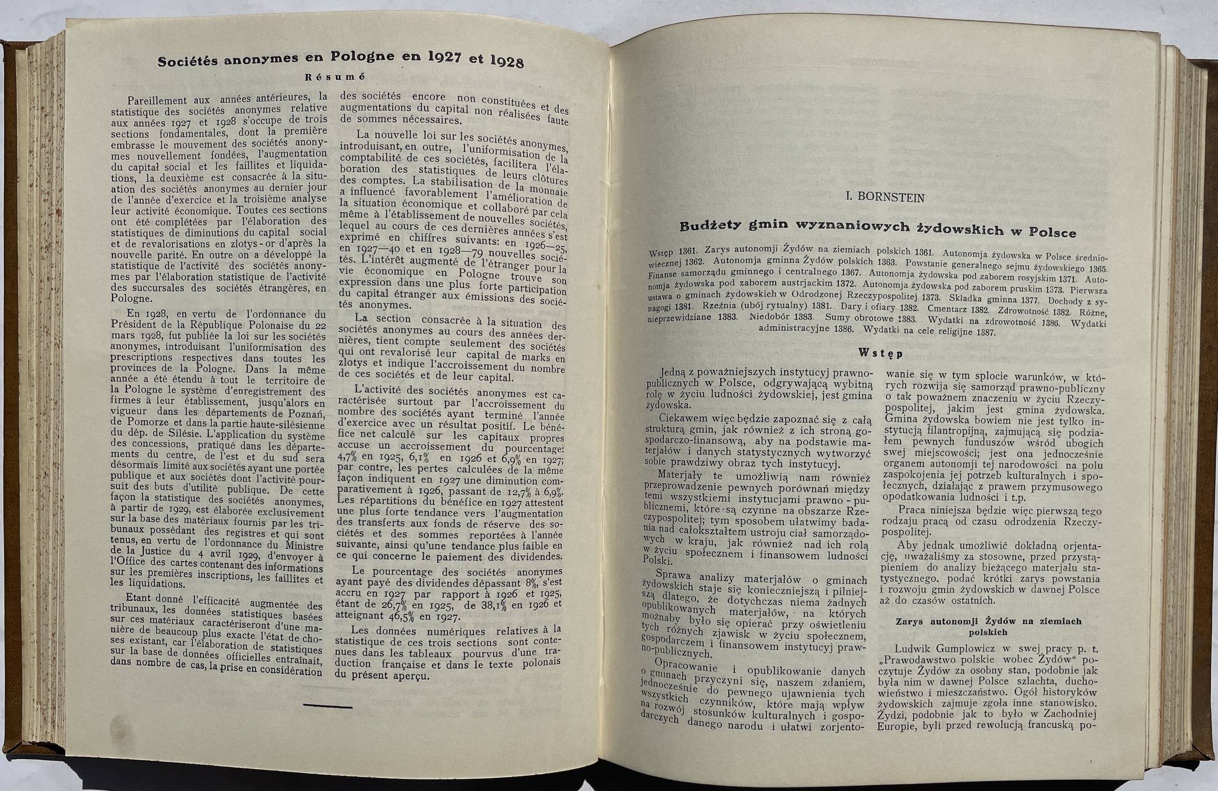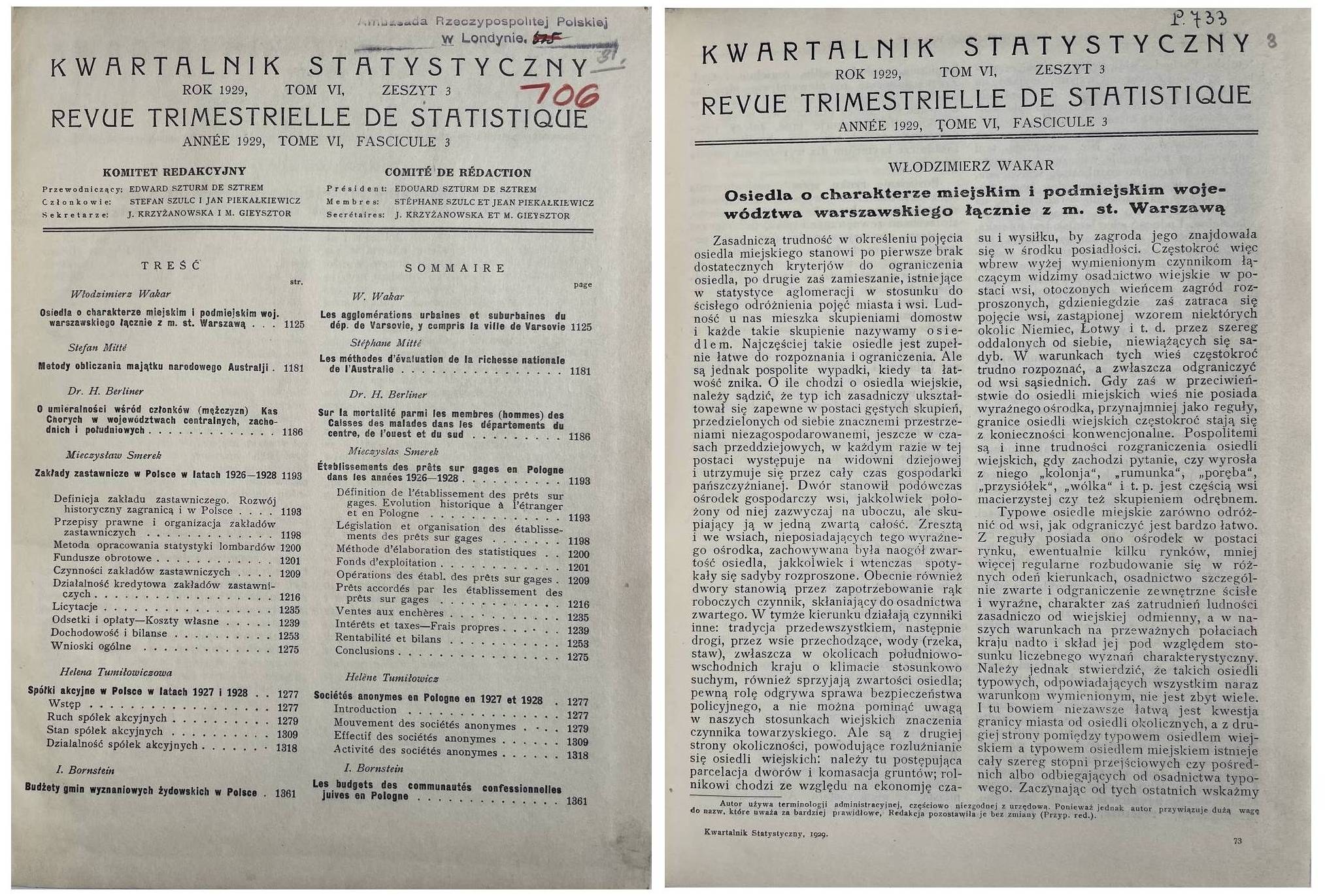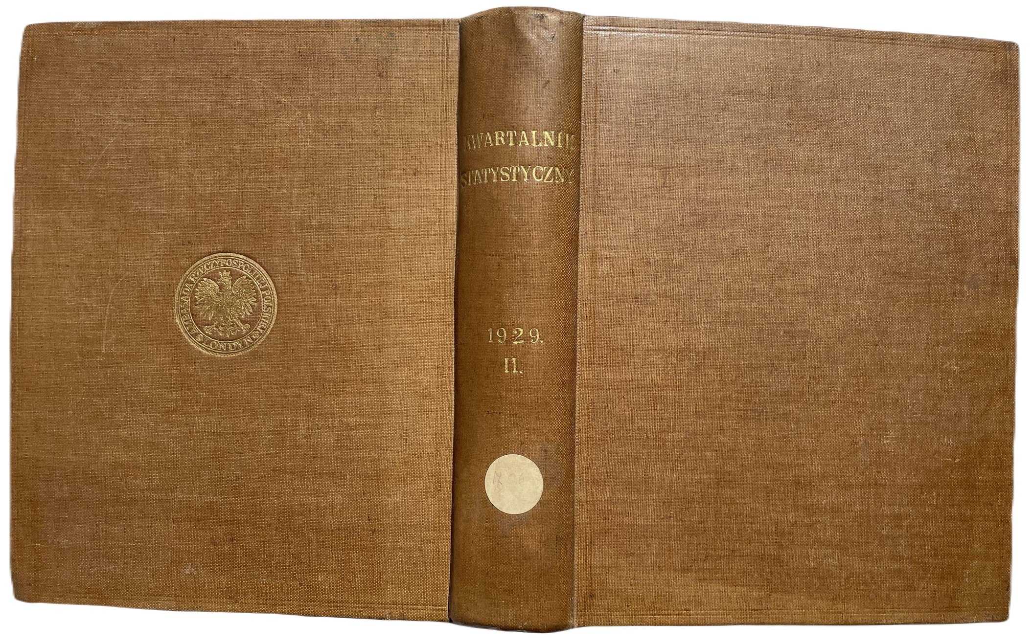 Kwartalnik statystyczny. Rok 1929, tom VI zeszyt 3. Format 27 cm, str. [1], 1126-1713. Oprawa z epoki pł. złoc. z wytł. piecz. ambasady pol. w Londynie, stan b. dobry.