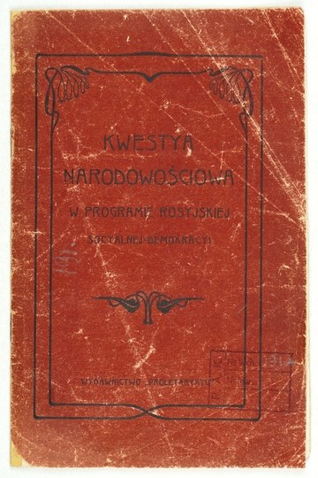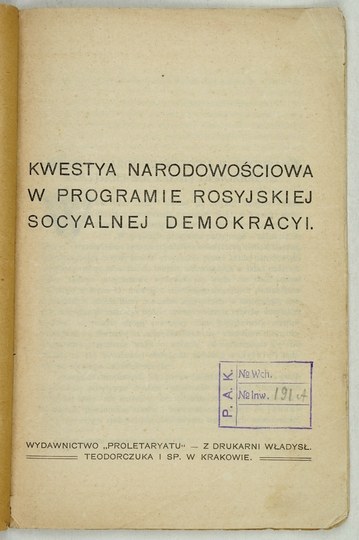 KWESTYA narodowościowa w programie rosyjskiej socyalnej demokracji. Kraków [ok. 1903]. Wyd. "Proletaryatu", Druk. W. Teodorczuka i Sp. 16d, s. 20. brosz.