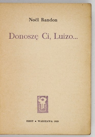 [KWIATKOWSKI Tadeusz]. Nöel Randon [pseud.] - Donoszę Ci, Luizo... Warszawa 1959. Iskry. 16d, s. 311, [1]. brosz. Klub Srebrnego Klucza.