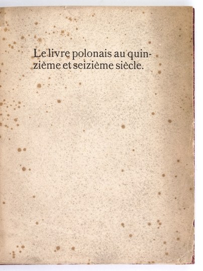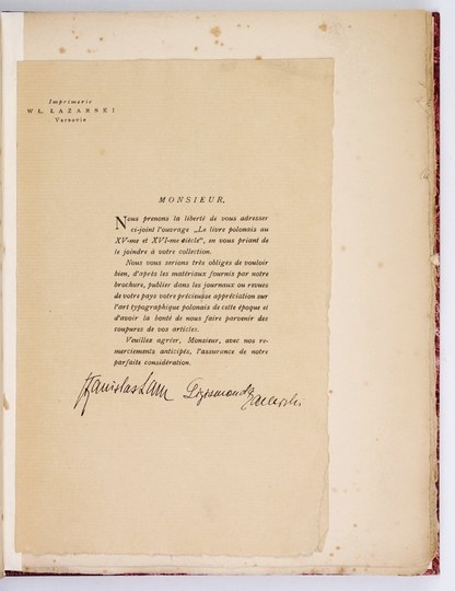 Okł. brosz. zakurzona i zaplamiona, miejscowe zabrązowienia papieru, poza tym stan bardzo dobry. Egz. obcięty tylko od góry. Wydano 400 egz. dla uczestników Międzynarodowego Kongresu Bibliotekarzy i Bibliofilów w Paryżu w 1923, podpisanych przez autora i Zygmunta Zalewskiego. Piękny i bardzo staranny druk na papierze mirkowskim Hollande, ozdobiony reprodukcjami, także dwubarwnymi, kart tytułowych, drzeworytów, inicjałów, kolofonów itp. polskich książek XV-XVI w. Praca miała za zadanie zaznajomienie międzynarodowej publiczności z osiągnięciami staropolskiej typografii. Do egzemplarza dołączono wizytówkę Stanisława Piotra Koczorowskiego (Tow. Bibliofilów Pol. w Warszawie i prac. Bibliot. Polskiej w Paryżu) z jego odręczną notatką dedykującą ten egz. (nr 8) Alfredowi Pereirze, francuskiemu historykowi i bibliografowi. Egzemplarz posiada także wklejony drukowany list przewodni z odręcznym podpisem Stanisława Lama i Zygmunta Zalewskiego, prospekt wydawniczy pracy "Recueil de gravures populaires sur bois polonaises" i książki S. Lama "Le beau livre".