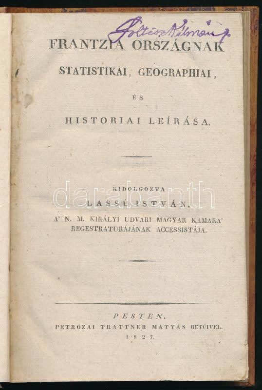 Lassú István: Frantzia országnak statistikai, geographiai, és históriai leirása.. 1. kiadás! Pest, 1827...