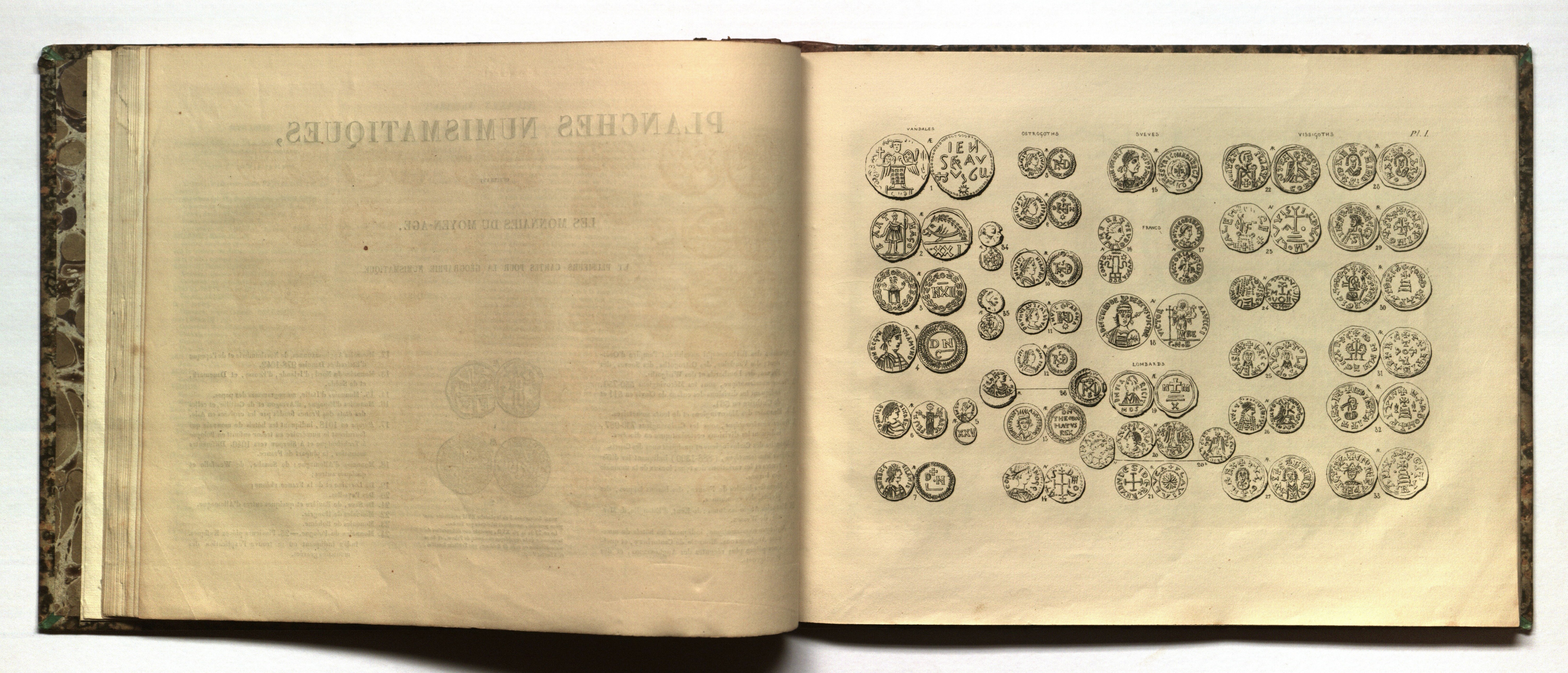 LELEWEL Joachim. Numismatique du moyen-âge depuis sa naissance jusqu'a l'apparition du gros d’argent, considerée sous le rapport du type, accompagnée d’ un Atlas, composé de tables chronologiques, de cartes géographiques et de figures de monnaies gravées en cuivre, par Ouvrage public par Joseph Straszewicz, Paris 1835. I wydanie ze spisem subskrybentów. 3 współoprawne tomy (komplet) rozprawy naukowej o formacie 8o: t. I str. XXIII i 229, t. II str. 126, t. III str. 331; ponadto atlas z wizerunkami monet w formacie 4o: str. 44 i 24 tablice. Bardzo atrakcyjna oprawa, ćwierćskórek z epoki i marmoryzowany papier; nieznaczny ubytek skóry na grzbiecie tomów współoprawnych, poza tym stan niemal gabinetowy; WYJĄTKOWA RZADKOŚĆ z racji kompletności wydawnictwa – wszystkie trzy tomy rozprawy oraz atlas będący jego integralną częścią. W zasadzie jest to podręcznik do numizmatyki europejskiej wieków średnich. Zdumiewa stan wiedzy Lelewela i metody badawcze jakie stosował, m. in. porównywanie portretów na monetach. Pozwalało mu to na ich bardzo dobrą identyfikację. W t. II o polskich monetach: str. 65-116, w atlasie na tablicy XXIV.