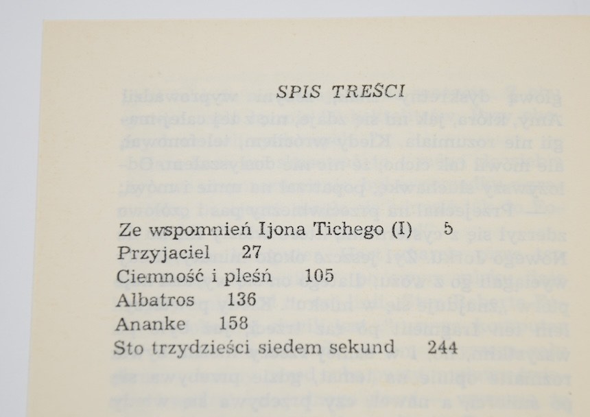 Zbiór zawiera sześć opowiadań autorstwa Stanisława Lema: Ze wspomnień Ijona Tichego, Przyjaciel, Ciemność i pleśń, Albatros, Ananke, Sto trzydzieści siedem sekund.