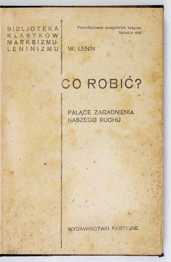 LENIN W[łodzimierz] - Co robić? Palące zagadnienia naszego ruchu. Moskwa 1933. Wyd. Partyjne. 8, s. 165, [3]. opr. ppł. z epoki z zach. okł. brosz. Bibljot. Klasyków Marksizmu-Leninizmu.