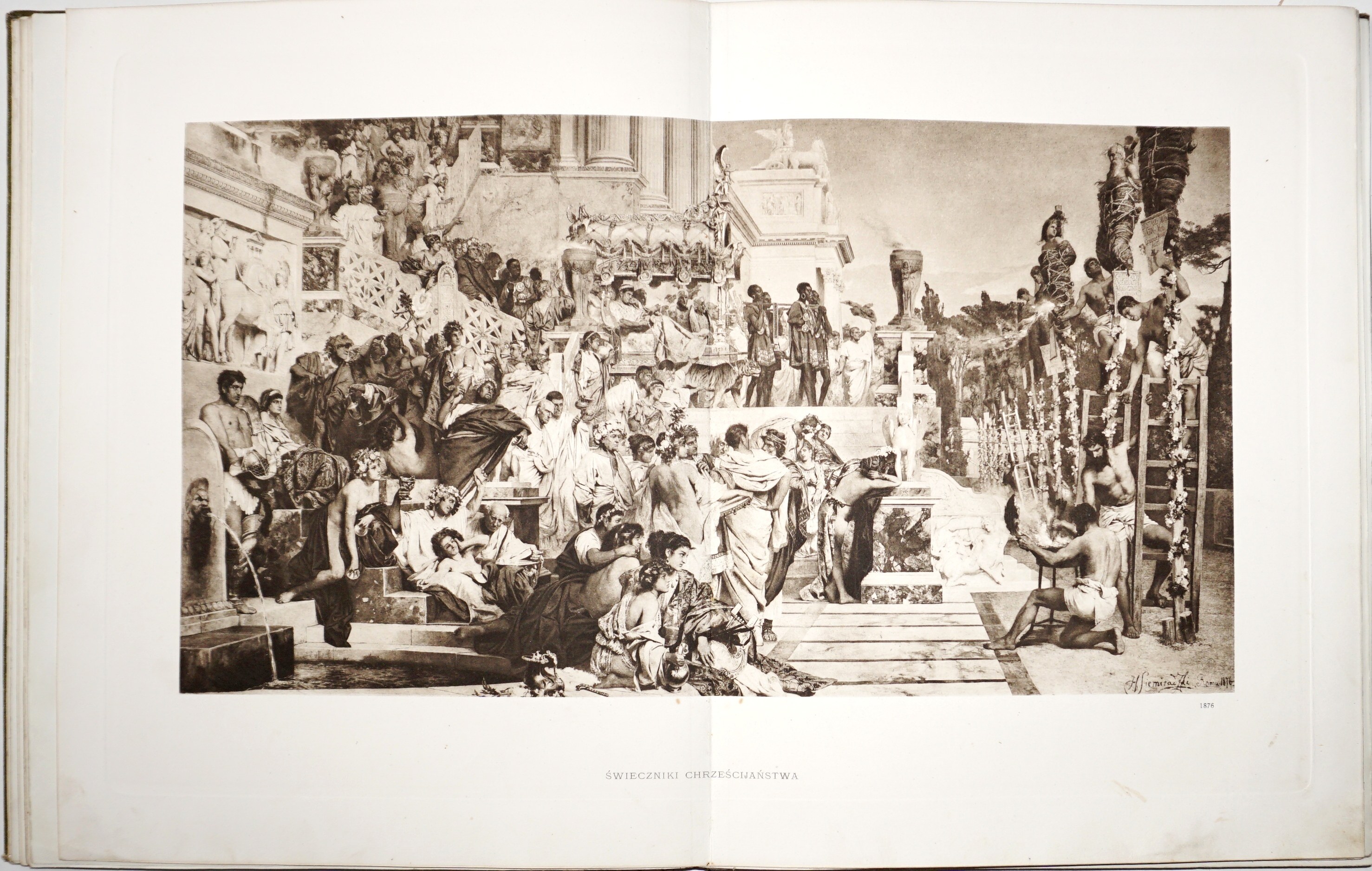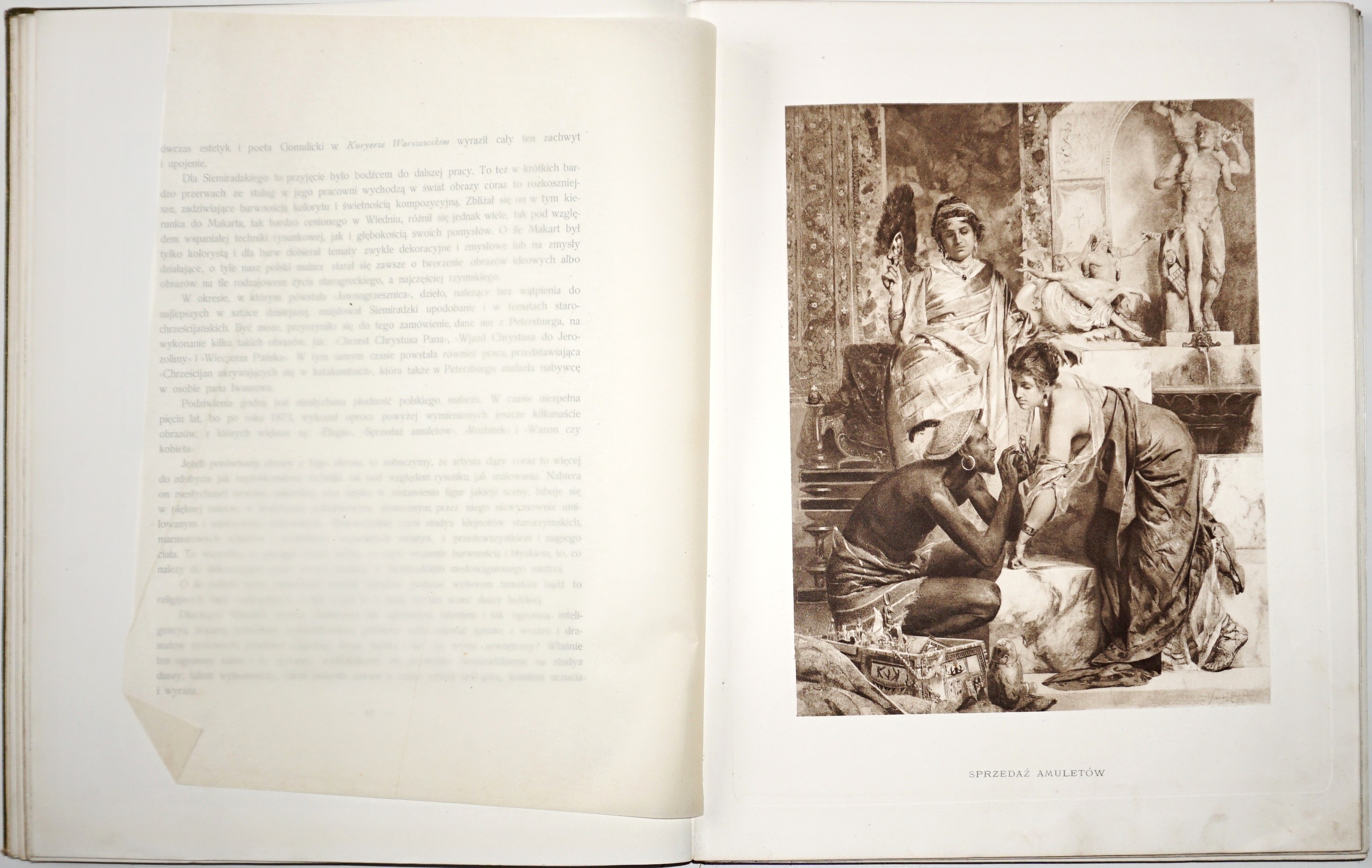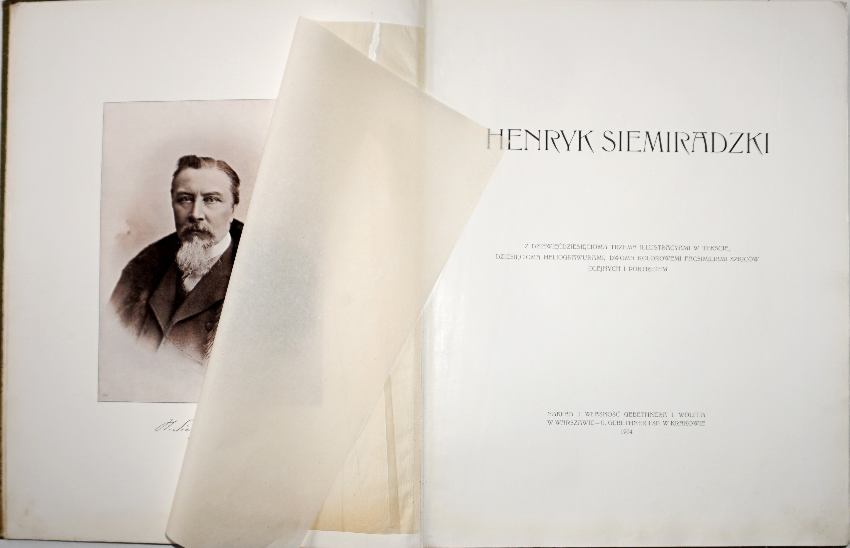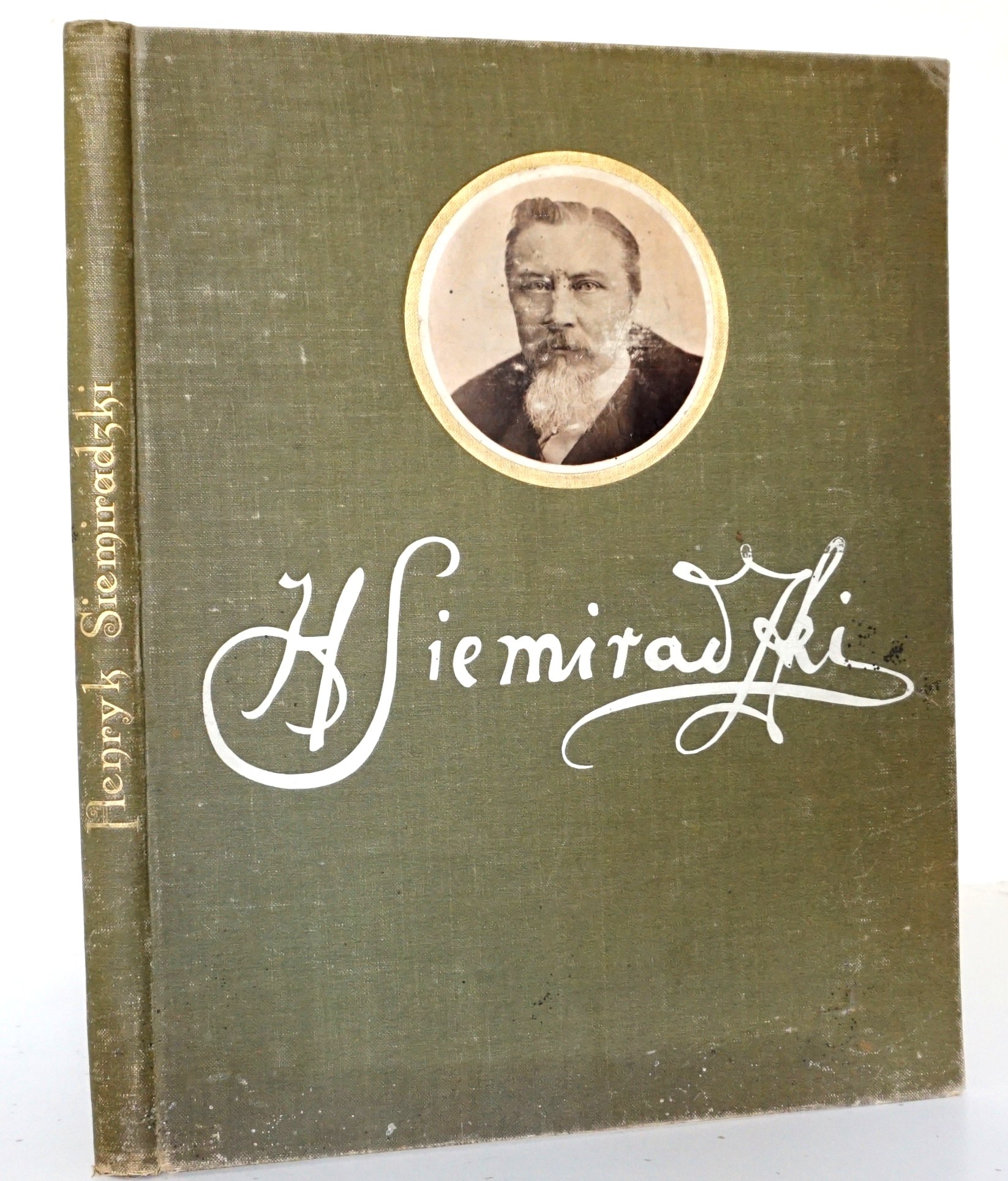 [4], 125, [3] s., [16] k. tabl. : il. (w tym kolor.) ; płótno wydawnicze z tłoczeniami i złoceniami na grzbiecie, na licu tłoczenia, w wytłoczonym złoto okręgu portret Siemiradzkiego, 35 cm, złocone obcięcia kart, stan dobry, niewielkie przybrudzenia i naddarcia niektórych bibułek poprzedzających tablice z ilustracjami w tym dwustronicowe;