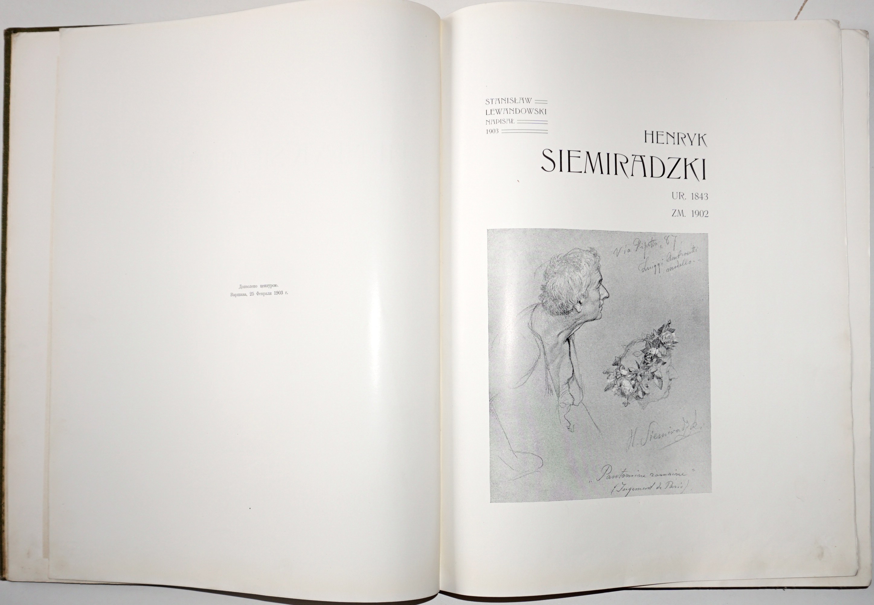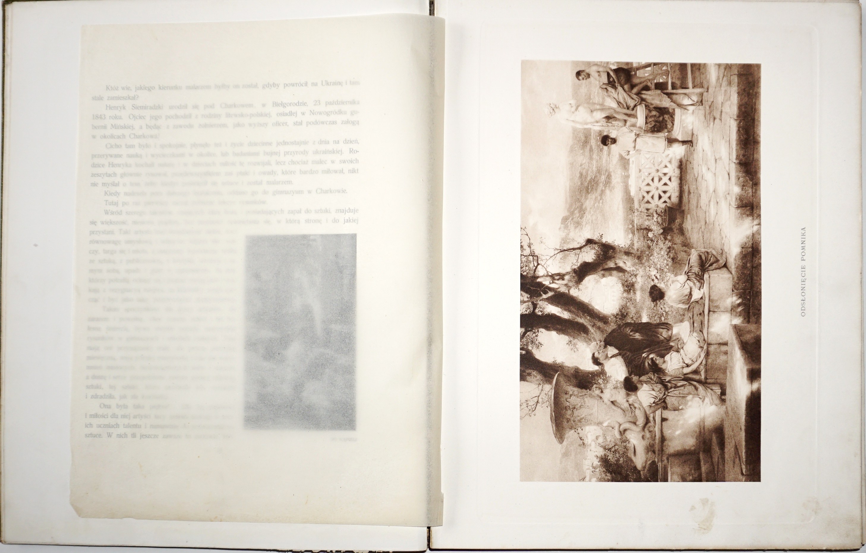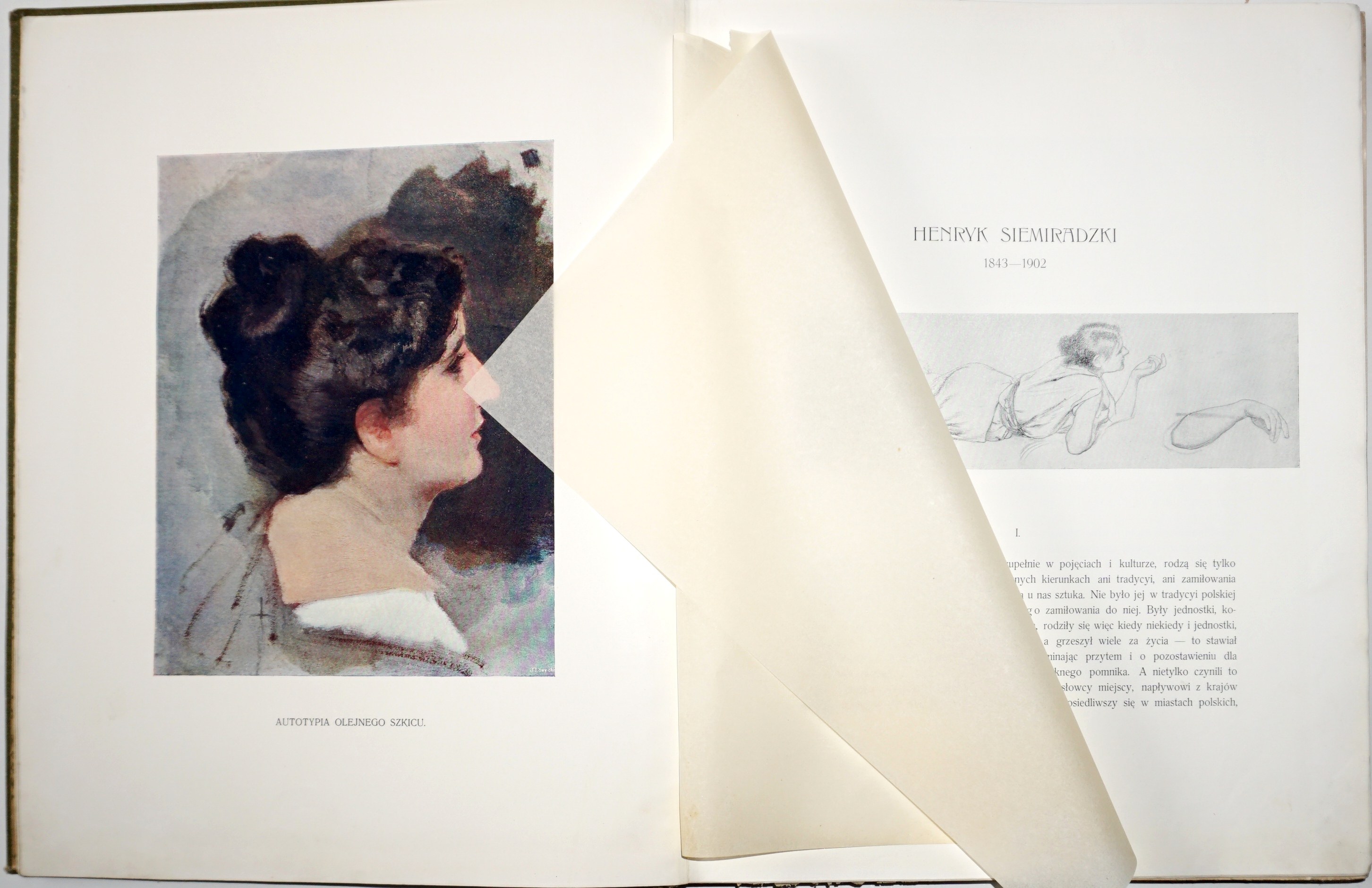 [4], 125, [3] s., [16] k. tabl. : il. (w tym kolor.) ; płótno wydawnicze z tłoczeniami i złoceniami na grzbiecie, na licu tłoczenia, w wytłoczonym złoto okręgu portret Siemiradzkiego, 35 cm, złocone obcięcia kart, stan dobry, niewielkie przybrudzenia i naddarcia niektórych bibułek poprzedzających tablice z ilustracjami w tym dwustronicowe;