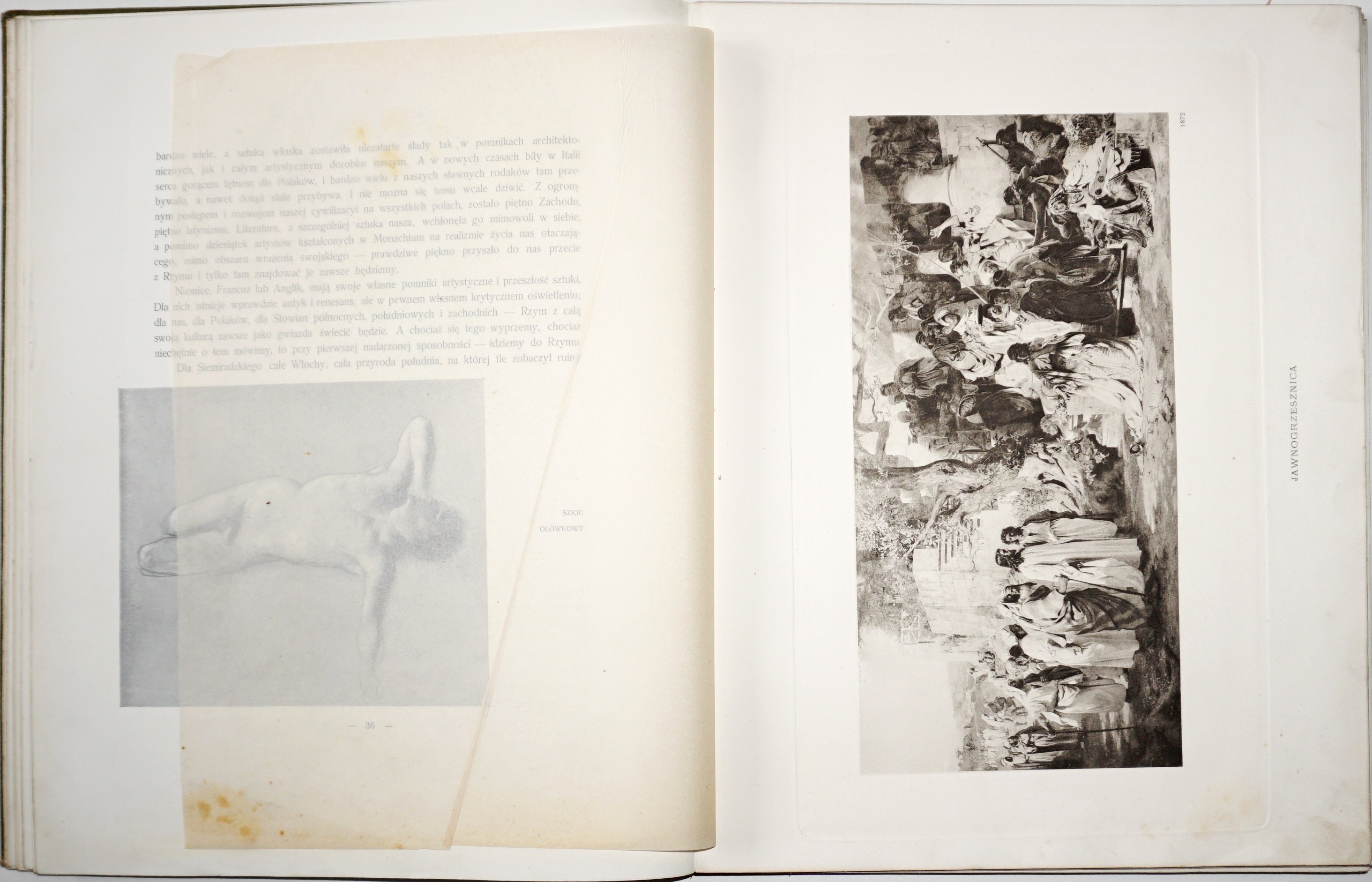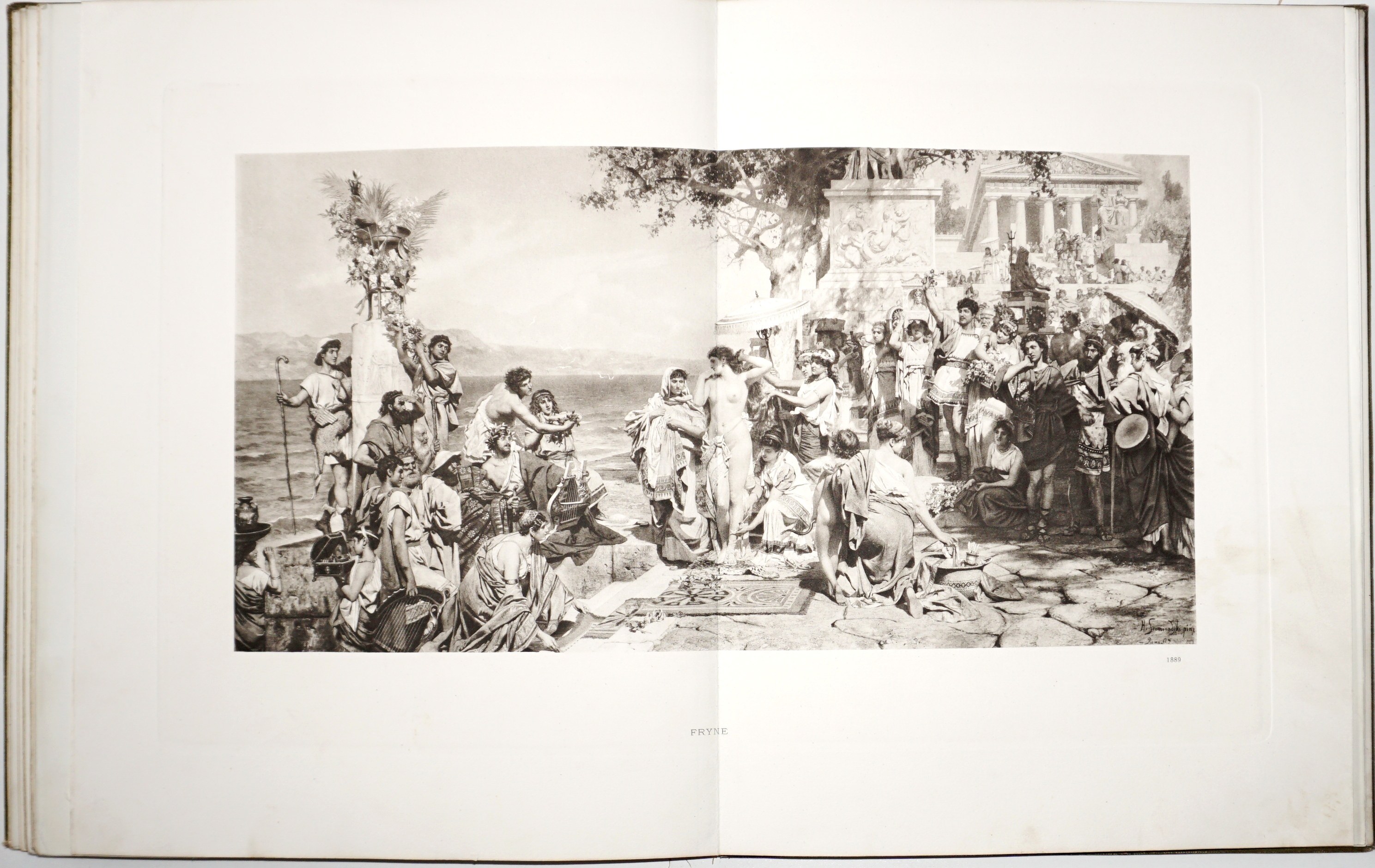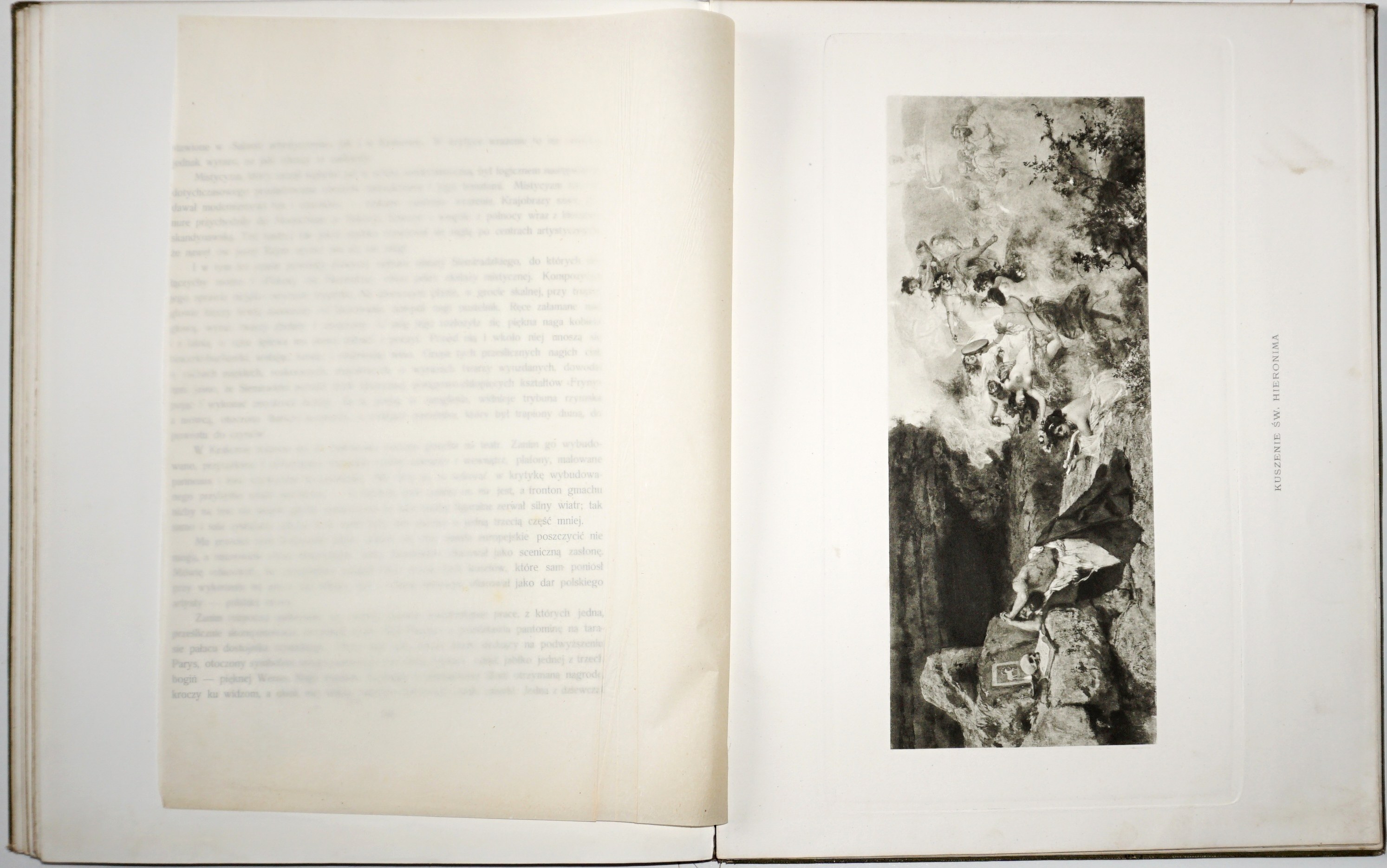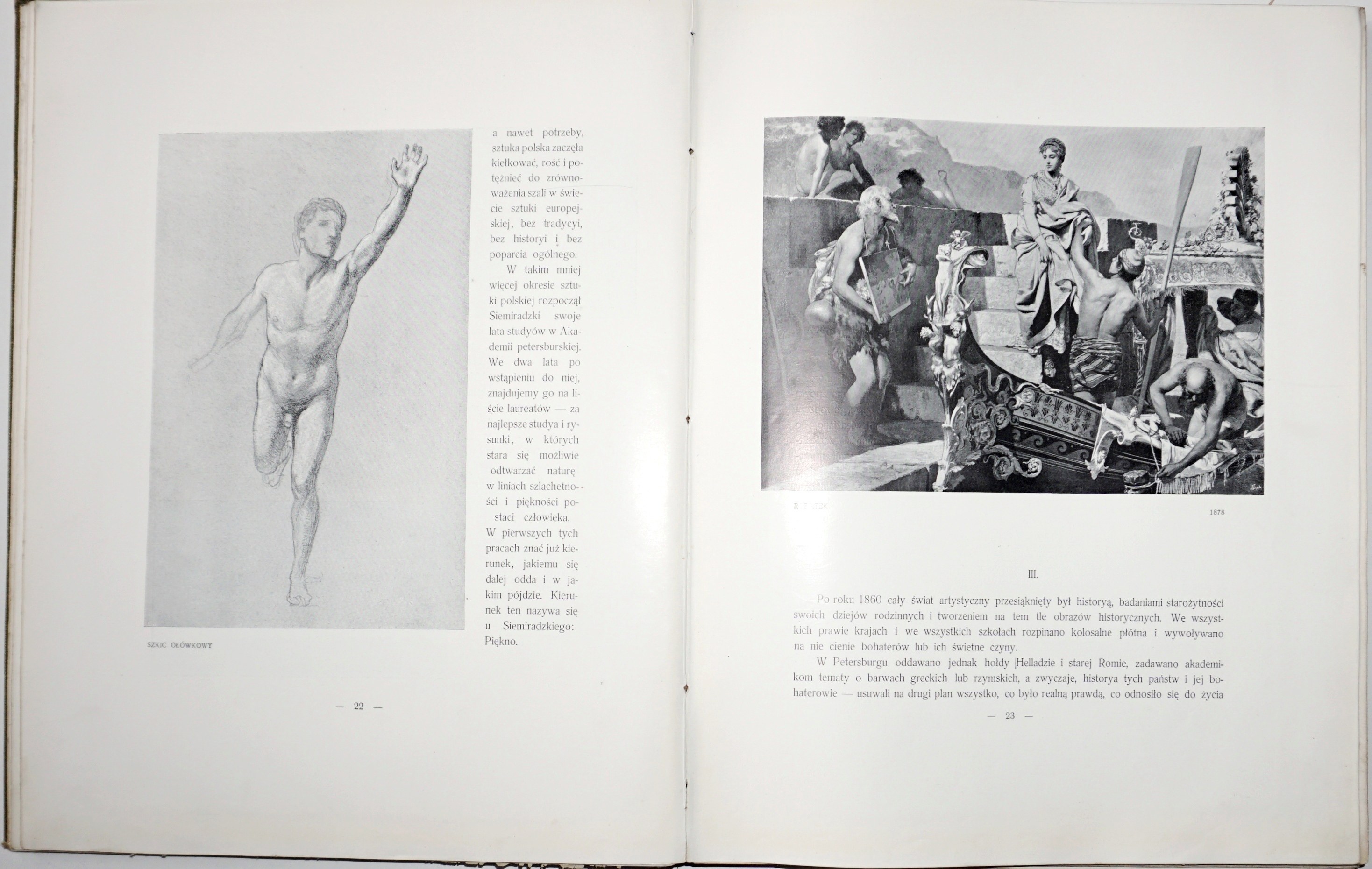[4], 125, [3] s., [16] k. tabl. : il. (w tym kolor.) ; płótno wydawnicze z tłoczeniami i złoceniami na grzbiecie, na licu tłoczenia, w wytłoczonym złoto okręgu portret Siemiradzkiego, 35 cm, złocone obcięcia kart, stan dobry, niewielkie przybrudzenia i naddarcia niektórych bibułek poprzedzających tablice z ilustracjami w tym dwustronicowe;