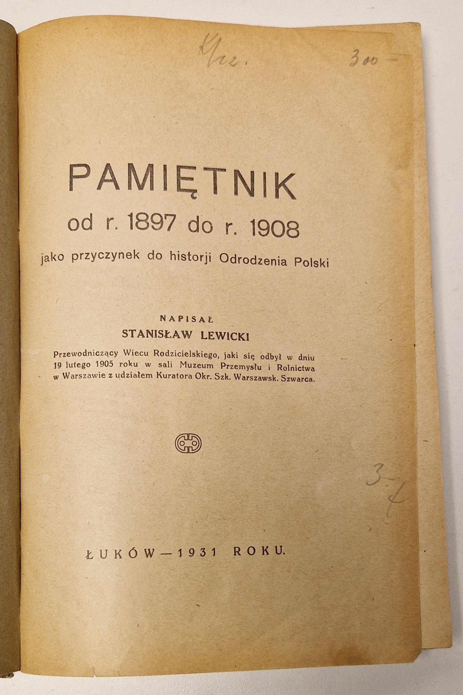 Pamiętnik od r. 1897 do r. 1908 jako przyczynek od historji Odrodzenia Polsk., Drukarnia Wydziału Powiatowego, Łuków, 1931. Stron 136.