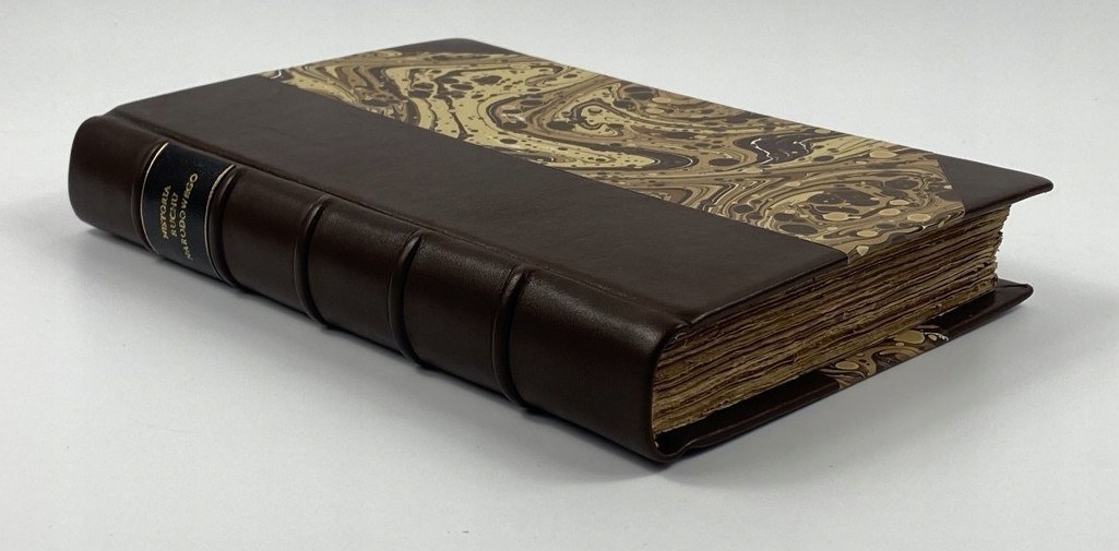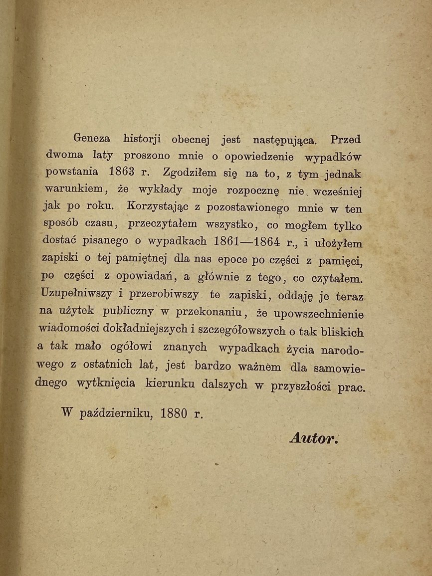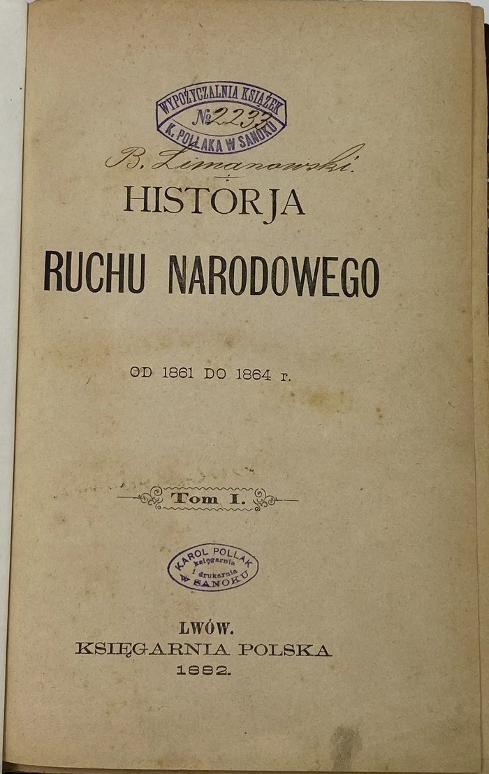 Limanowski Bolesław, Historia ruchu narodowego od 1861 do 1864 r. T. 1-2 [współoprawne], Księgarnia Polska, Lwów 1882, s. 183, [1]; 266, [1], wymiary 15 x 25 cm. Pieczęć Księgarni Karola Pollaka w Sanoku. Napisane odręcznie nazwisko autora na stronach tyt. Elegancki półskórek wykonany ręcznie w pracowni Suszek Books.