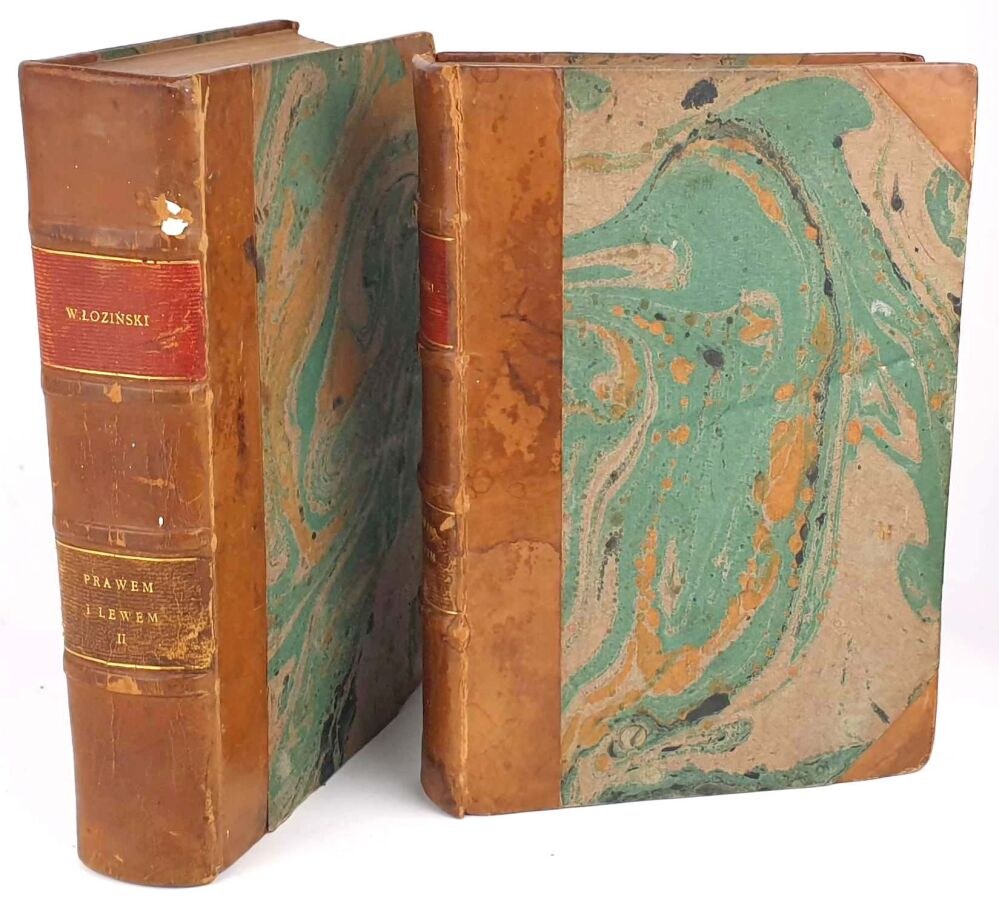 TWARDA OPRAWA PÓŁSKÓREK Z EPOKI. GRZBIETY Z WYPUKŁYMI ZWIĘZAMI, TŁOCZENIAMI, SZYLDZIKAMI I ZŁOCENIAMIA. KARTON ORAZ WYKLEJKI MARMORYZOWANE. GÓRNE OBCIĘCIA BARWIONE.
