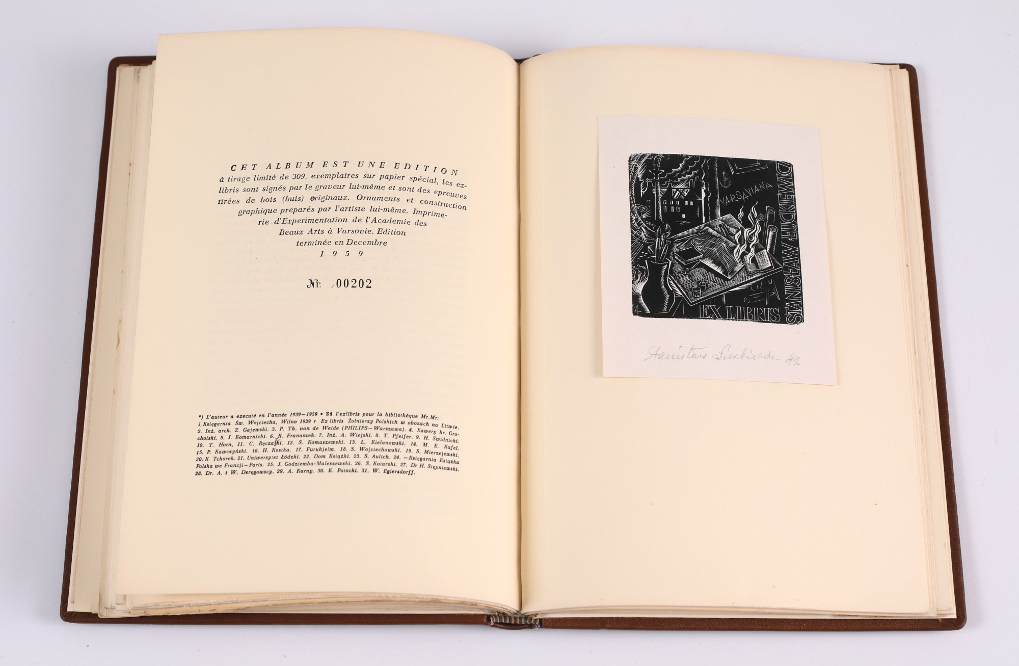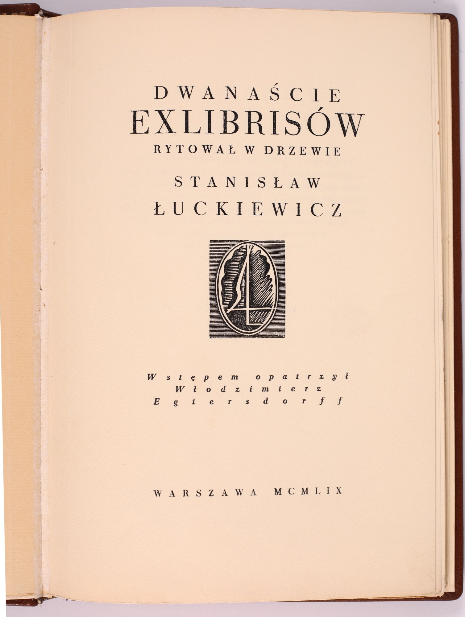 Łuckiewicz Stanisław. Les douze exlibris gravés par... Introduction de Włodzimierz Egiersdorff . Varsovie (Warszawa) MCMLIX (1959), s. [6], [12] – z wklejonymi ekslibrisami, wykonanymi w technice drzeworytu. Każdy exlibris sygnowany ołówkiem. Wys. 27 cm. Oprawa współczesna: skóra, grzbiet podzielony na 9 pól ze złoconymi napisami. Zach. wyd. okł. brosz. Ekslibris Szymańskich na k. przedtyt.