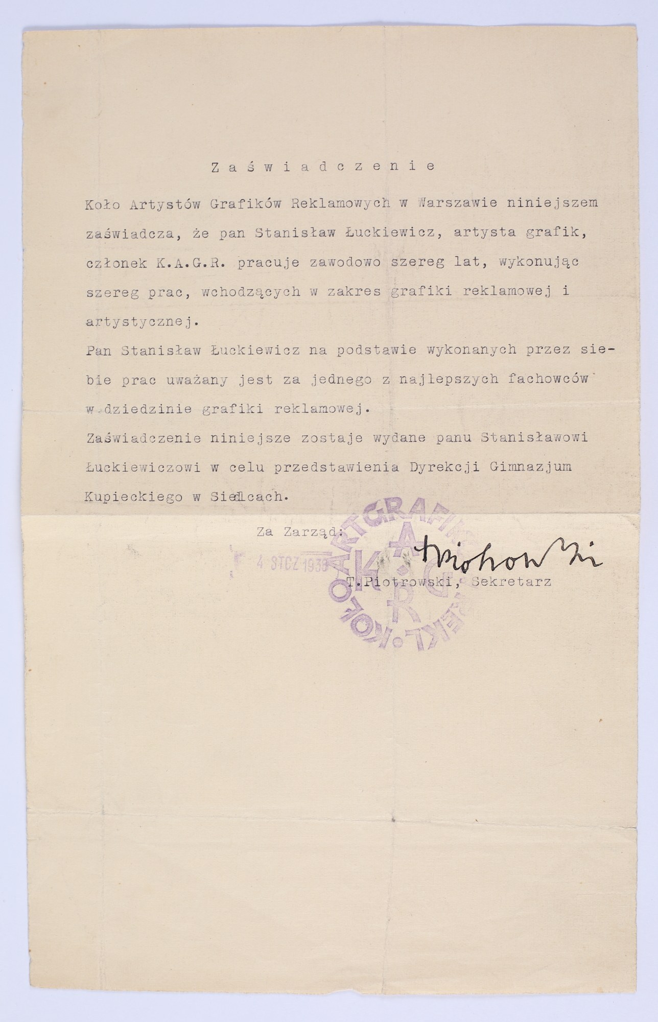 Dołączono luzem zaświadczenie Koła Artystów Grafików Reklamowych (KAGR) w Warszawie poświadczające doświadczenie zawodowe St. Łuckiewicza i określajace go mianem "jednego z najlepszych fachowców w dziedzinie grafiki reklamowej".