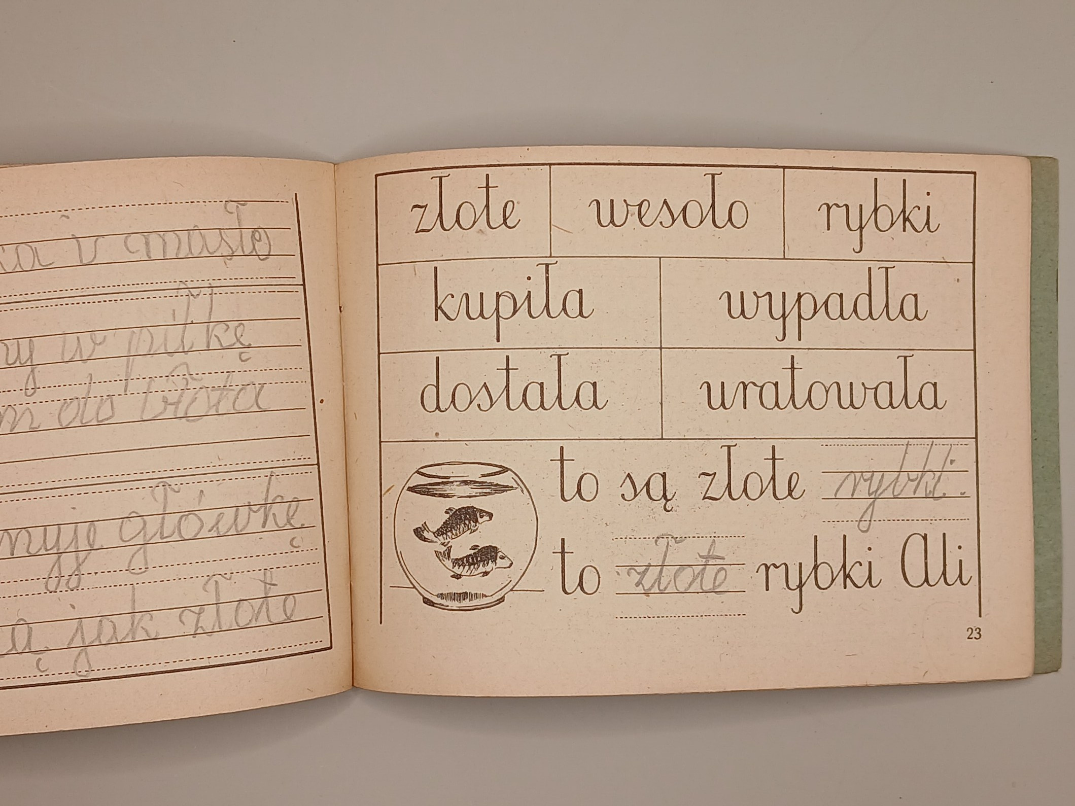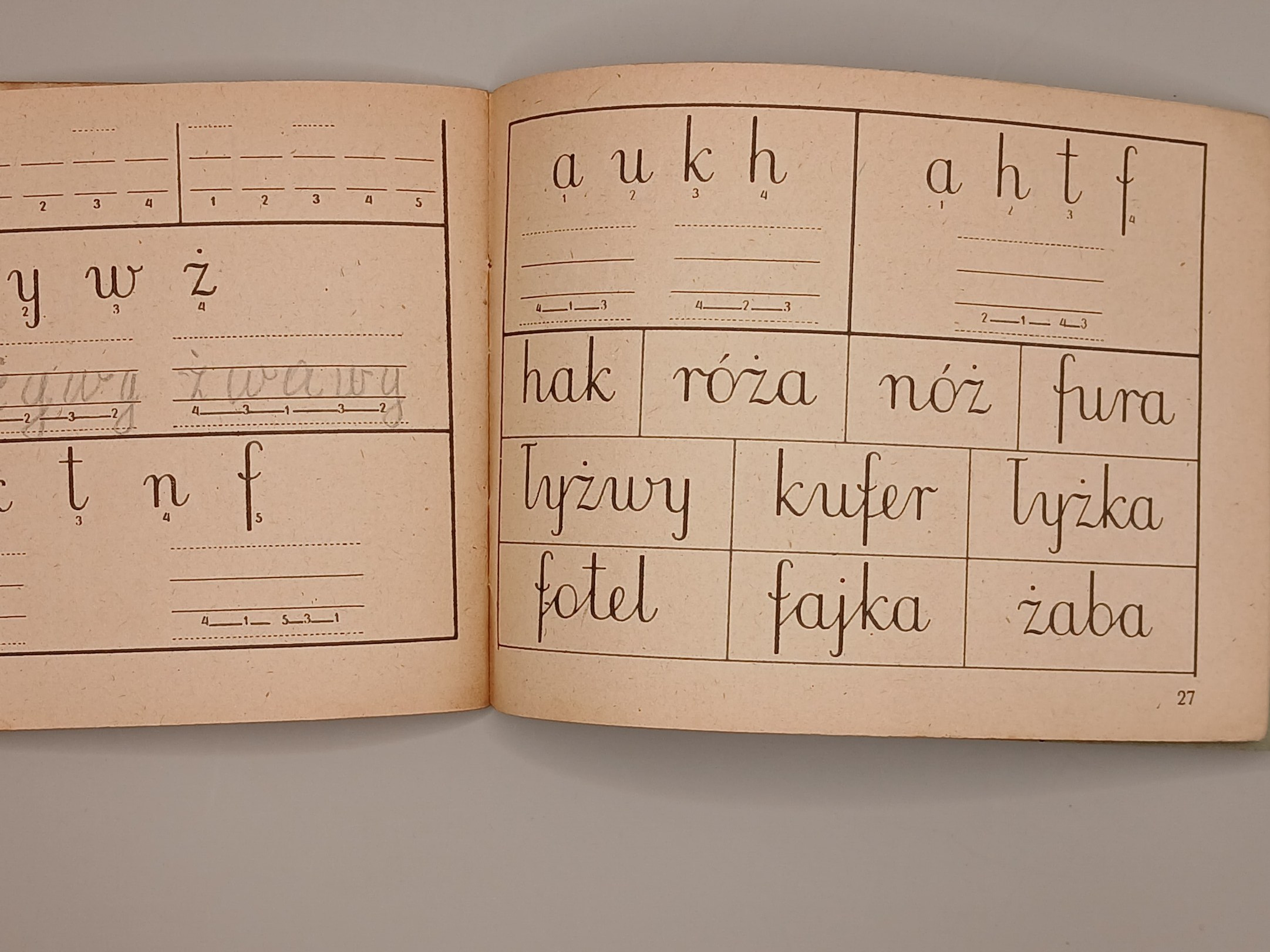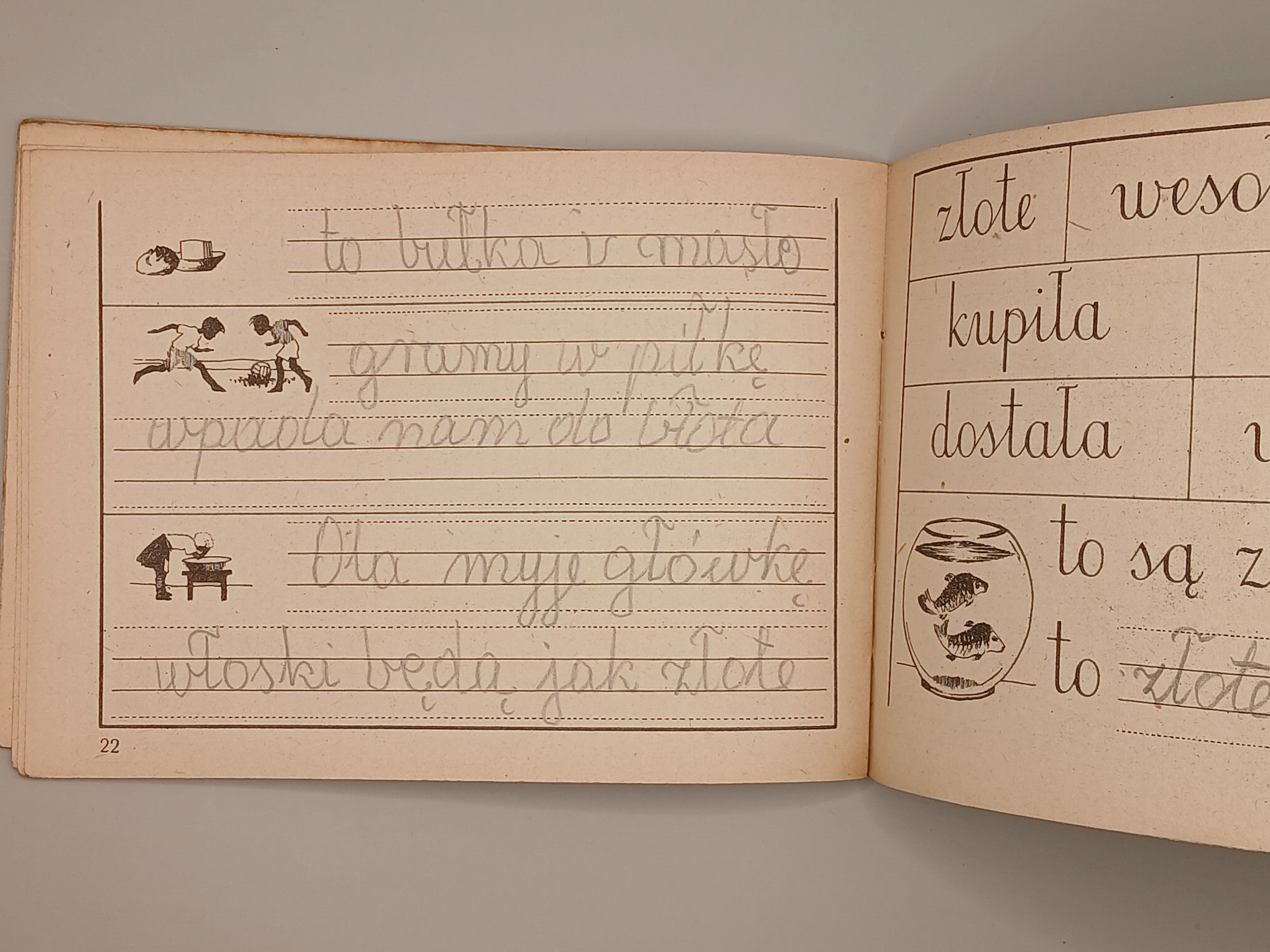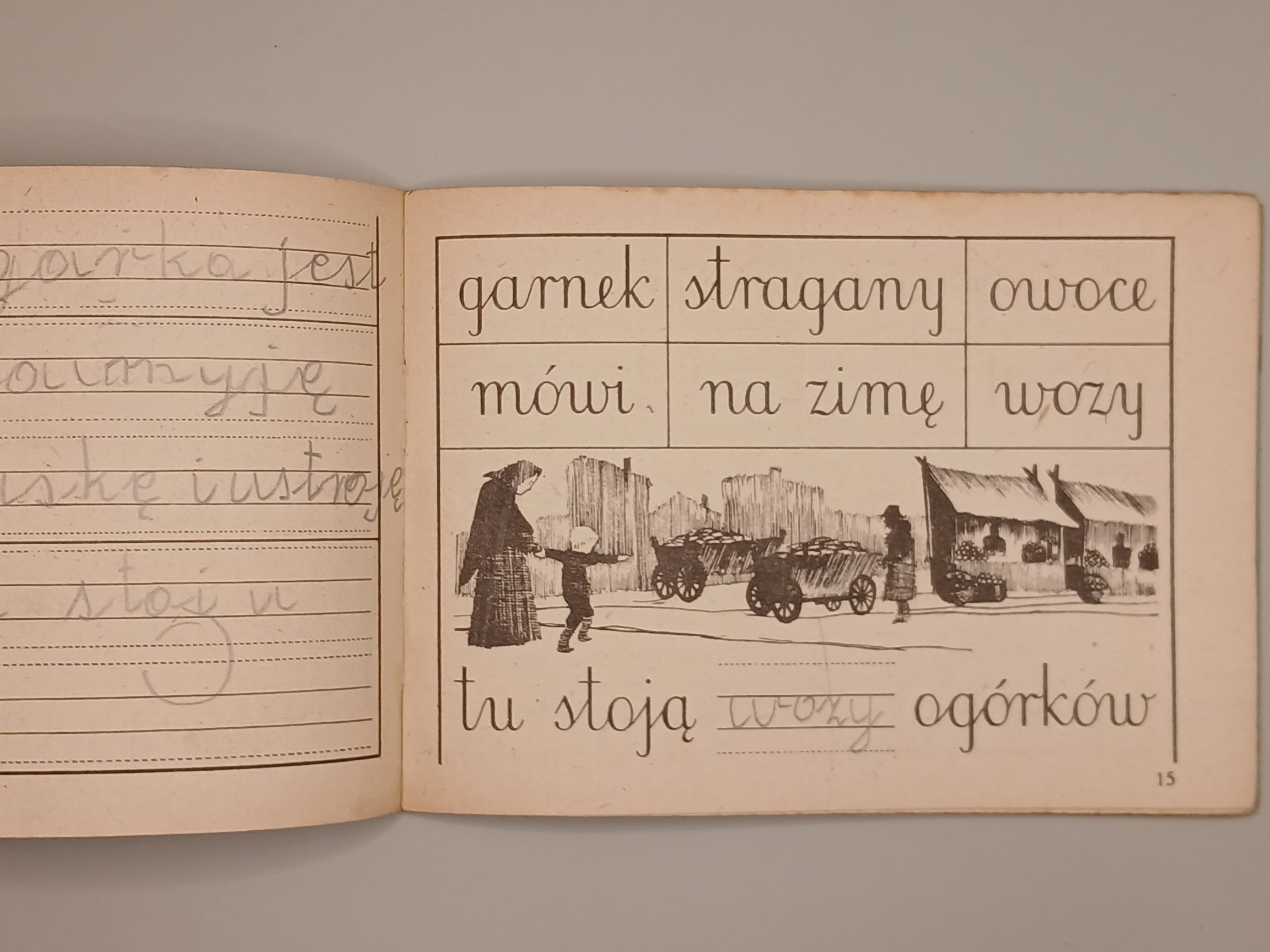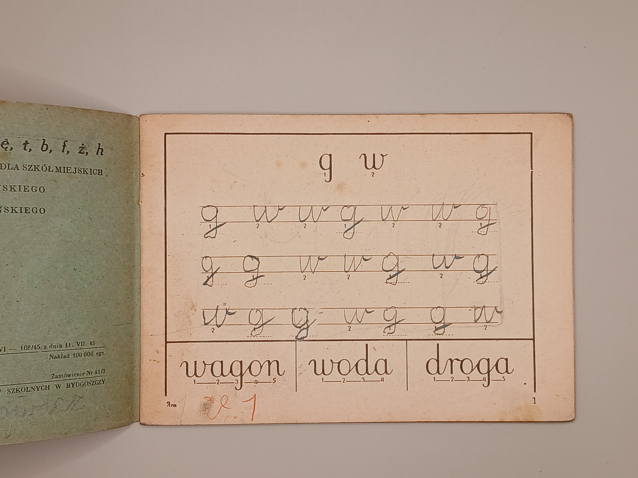 Marian Falski. ZADANIA ELEMENTARZOWE dla uczniów szkół miejskich. Zeszyt trzeci. Państwowy Zakład Wydawnictw Szkolnych 1945 r.; 16x11,5 cm; s. 32. Zeszyt w większej części wypełniony.