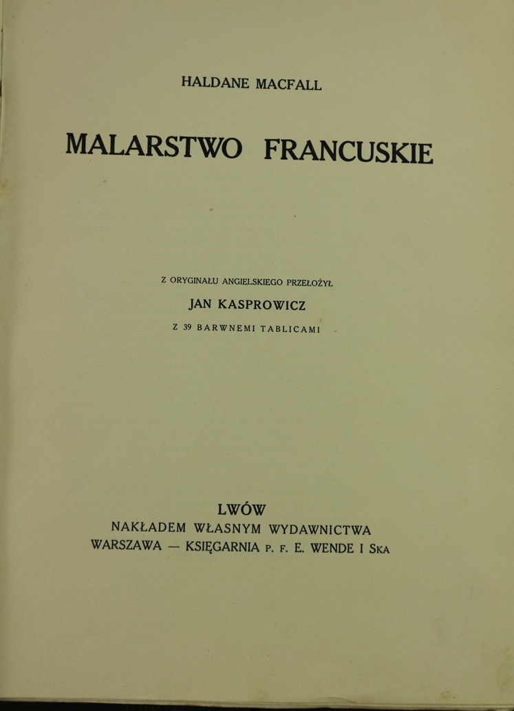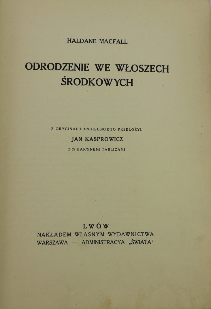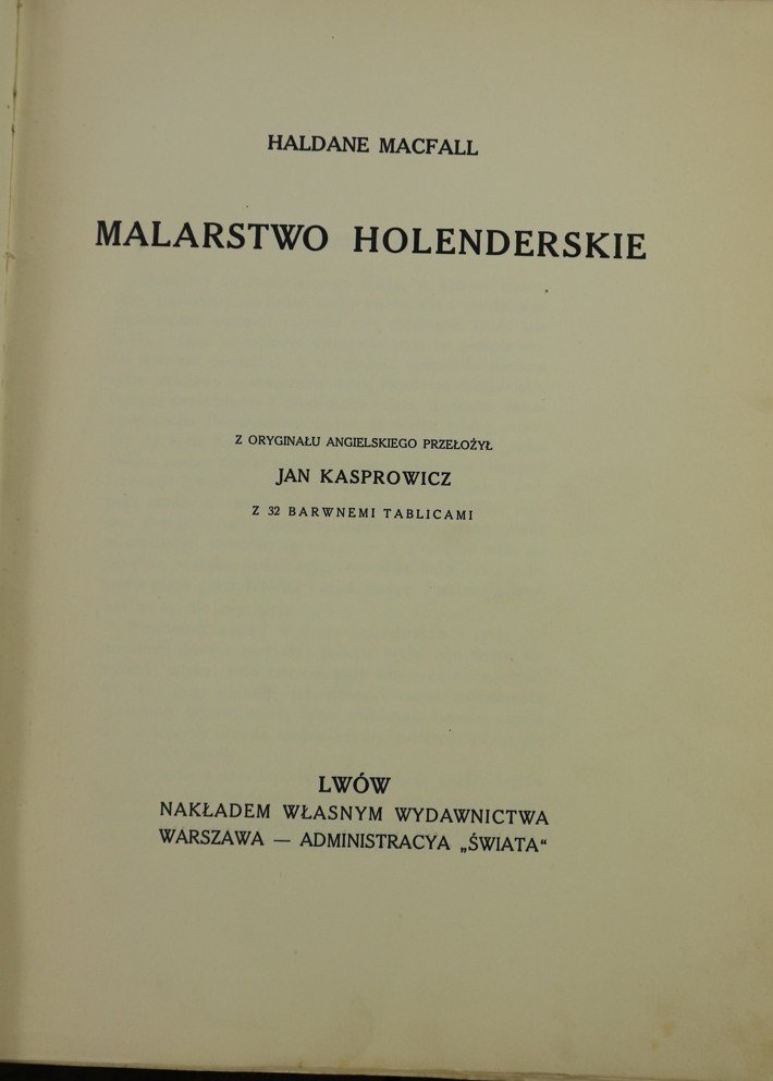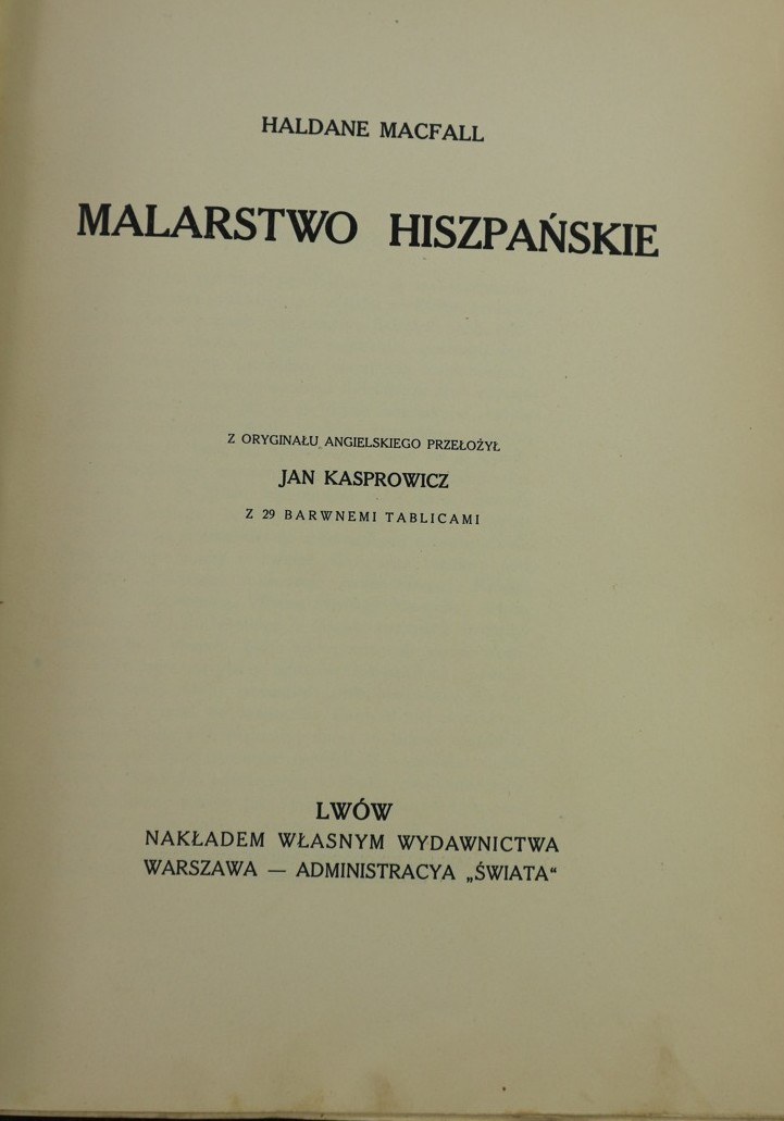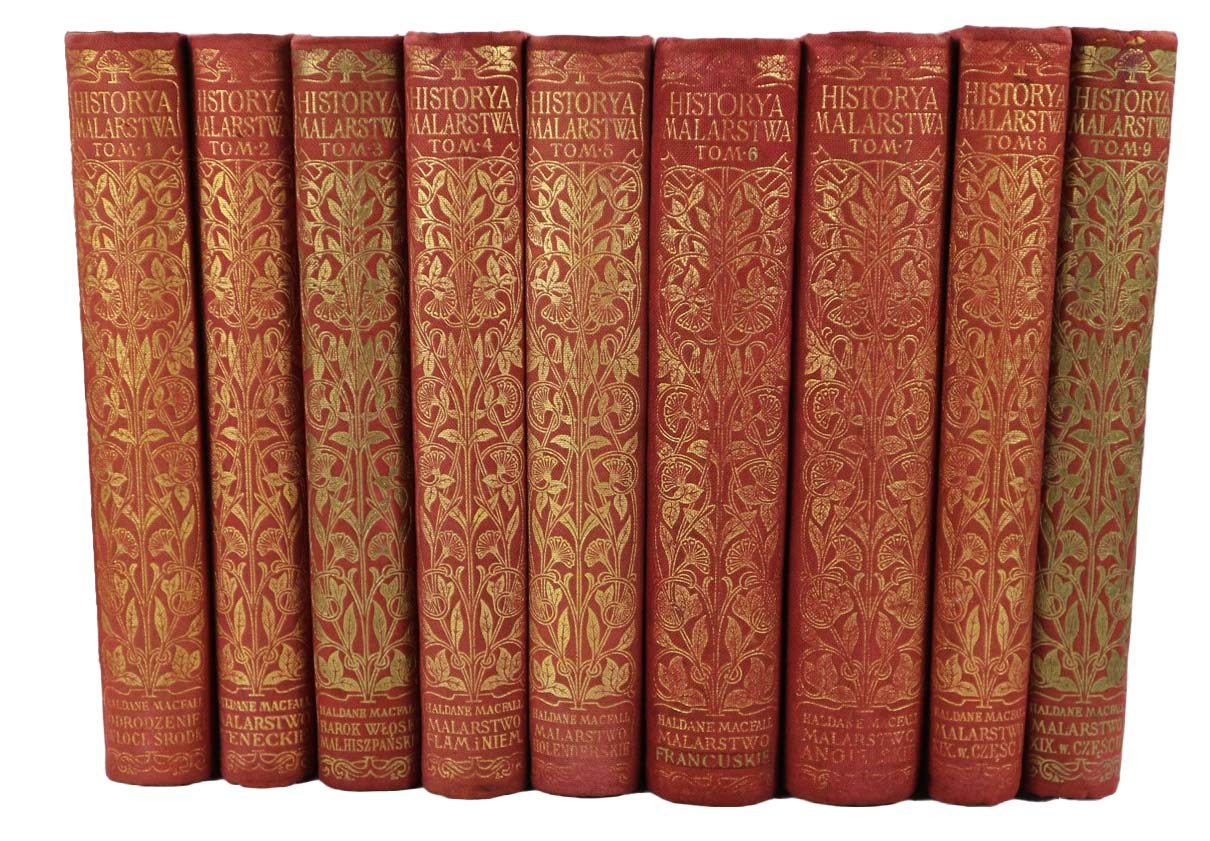 MacFall Haldane - Historia Malarstwa t. 1-9, dzieło zbiorowe z 300 barwnemi tablicami, pod redakcyą Tadeusza Piniego. Z oryginału angielskiego przełożyli: Jan Kasprowicz, Józef Ruffer, Władysław Witwicki. Nakładem własnym wydawnictwa Warszawa - Administracya "Świata" później Księgarnia St. Sadowskiego, Lwów 1912 - 1918, t. 1 - 9, komplet w oprawach wydawniczych - płóciennych ze zdobieniami na grzbiecie i licu, niewielka pieczątka własnościowa, wymiary 21 x 29 cm. Oprawa płócienna ze złoceniami, wydawnicza. Niewielkie otarcia, zabrudzenia.