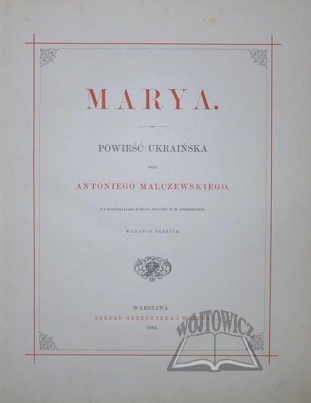 Marya. Powieść ukraińska. Z 8 fotografiami podług rysunku E. M. Andriollego. Warszawa 1883. Nakł. Gebethnera i Wolffa. Druk W. Drugulin w Lipsku.  Folio, s. 63, [1], frontispis, 4 ilustracji na osobn....