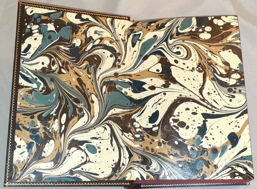TWARDA OPRAWA PEŁNA SKÓRA WSPÓŁCZESNA. OKŁADKI OKOLONE ZŁOCONĄ BORDIURĄ, GRZBIET Z WYPUKŁYMI ZWIĘZAMI, TŁOCZENIAMI Z ZŁOCENIAMI. RĘCZNIE BARWIONY W MASIE PAPIER MARMORYZOWANY NA WYKLEJKACH, WSZYSTKIE OBCIĘCIA KART BARWIONE. WNĘTRZA OKŁADEK WYKOŃCZONE MISTERNYM TŁOCZONYM ZŁOTEM SZLACZKIEM