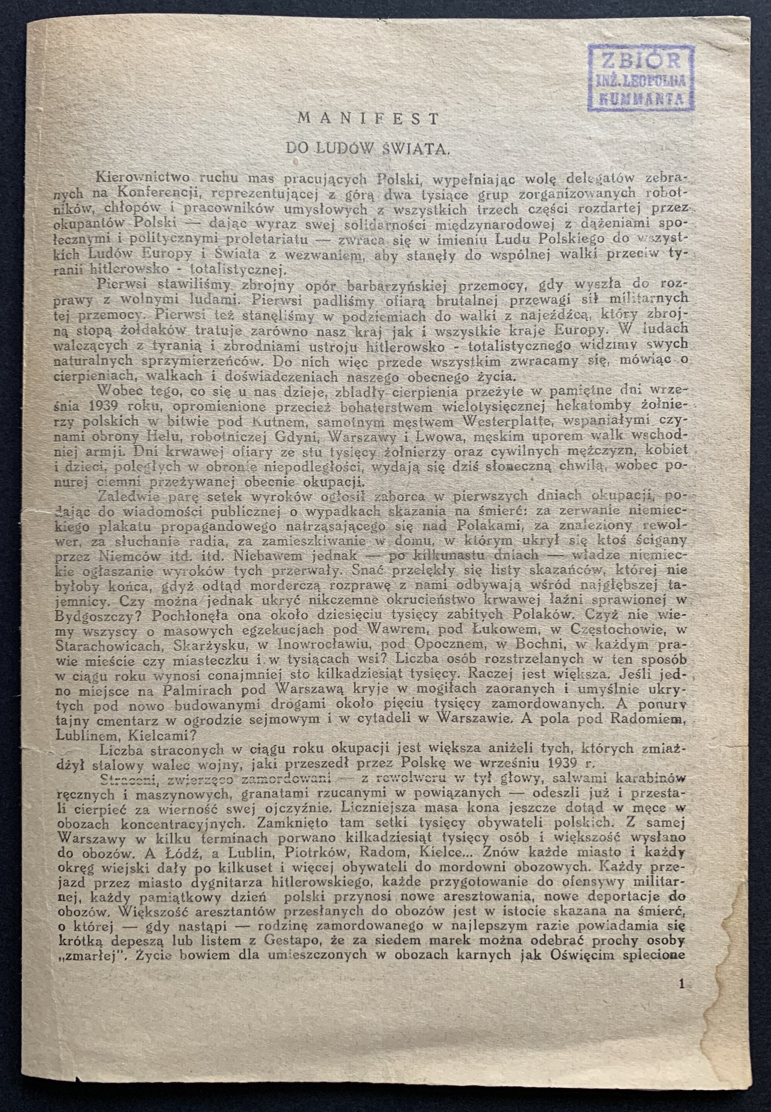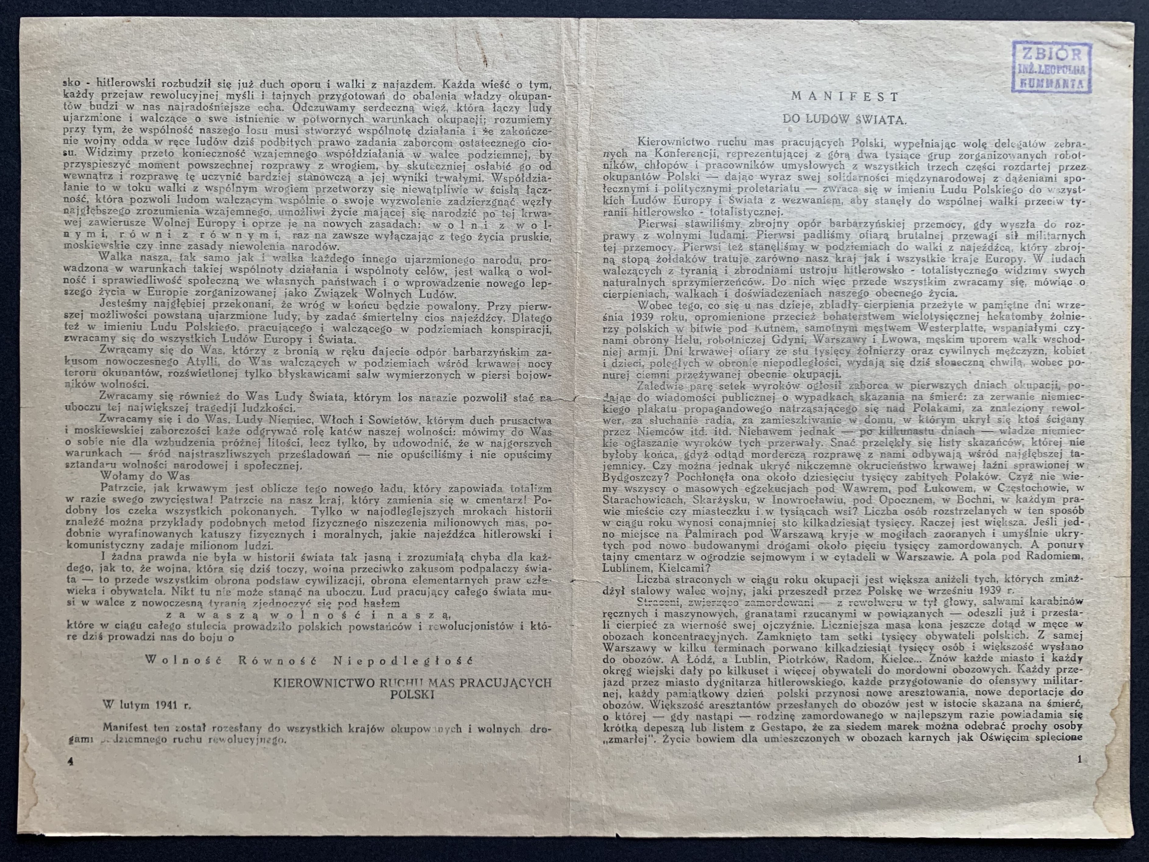 MANIFEST do ludów świata. [Kraków] luty 1941. Kierownictwo Ruchu Mas Pracujących Polski [Wolność Równość Niepodległość].