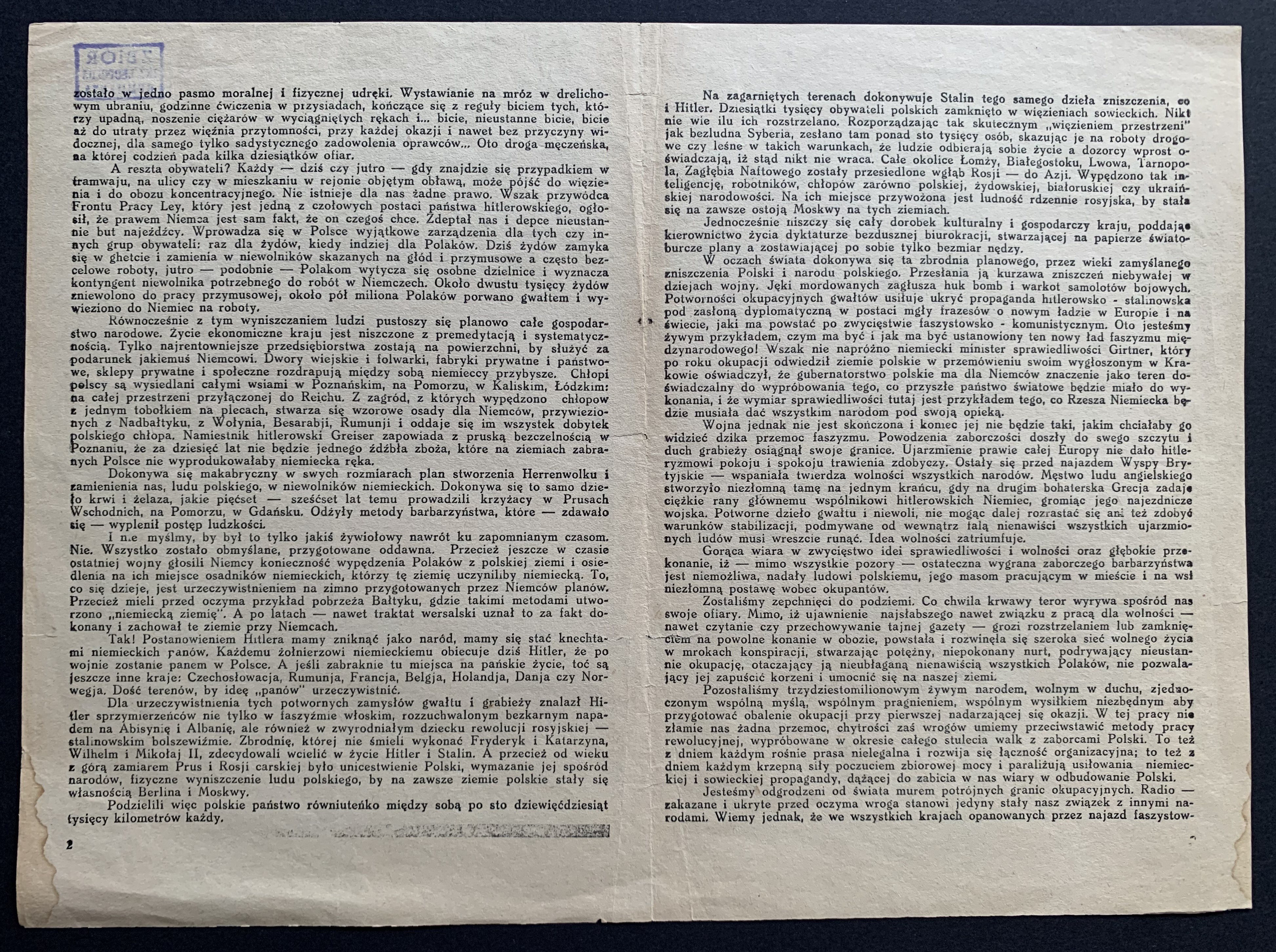 Fragment: "...Zostaliśmy zepchnięci do podziemi. Co chwila krwawy teror wyrywa spośród nas swoje ofiary. Mimo, iż ujawnienie najsłabszego nawet związku z pracą dla wolności - nawet czytanie czy przechowywanie tajnej gazety grozi rozstrzelaniem lub zamknięciem na powolne konanie w obozie, powstała i rozwinęła się szeroka sieć wolnego życia w mrokach konspiracji, stwarzając potężny, niepokonany nurt, podrywający nieustannie okupację, otaczający ją nieubłaganą nienawiścią wszystkich Polaków, nie pozwalający jej zapuścić korzeni i umocnić się na naszej ziemi. Pozostaliśmy trzydziestomilionowym żywym narodem, wolnym w duchu, zjedaoczonym wspólną myślą, wspólnym pragnieniem, wspólnym wysiłkiem niezbędnym aby przygotować obalenie okupacji przy pierwszej nadarzającej się okazji. W tej pracy nie złamie nas żadna przemoc, chytrości zaś wrogów umiemy przeciwstawić metody pracy rewolucyjnej, wypróbowane w okresie całego stulecia walk z zaborcami Polski. To też z dniem każdym rośnie prasa nielegalna i rozwija się łączność organizacyjna; to też z dniem każdym krzepną siły poczuciem zbiorowej mocy i paraliżują usiłowania niemieckiej i sowieckiej propagandy, dążącej do zabicia w nas wiary w odbudowanie Polski...".