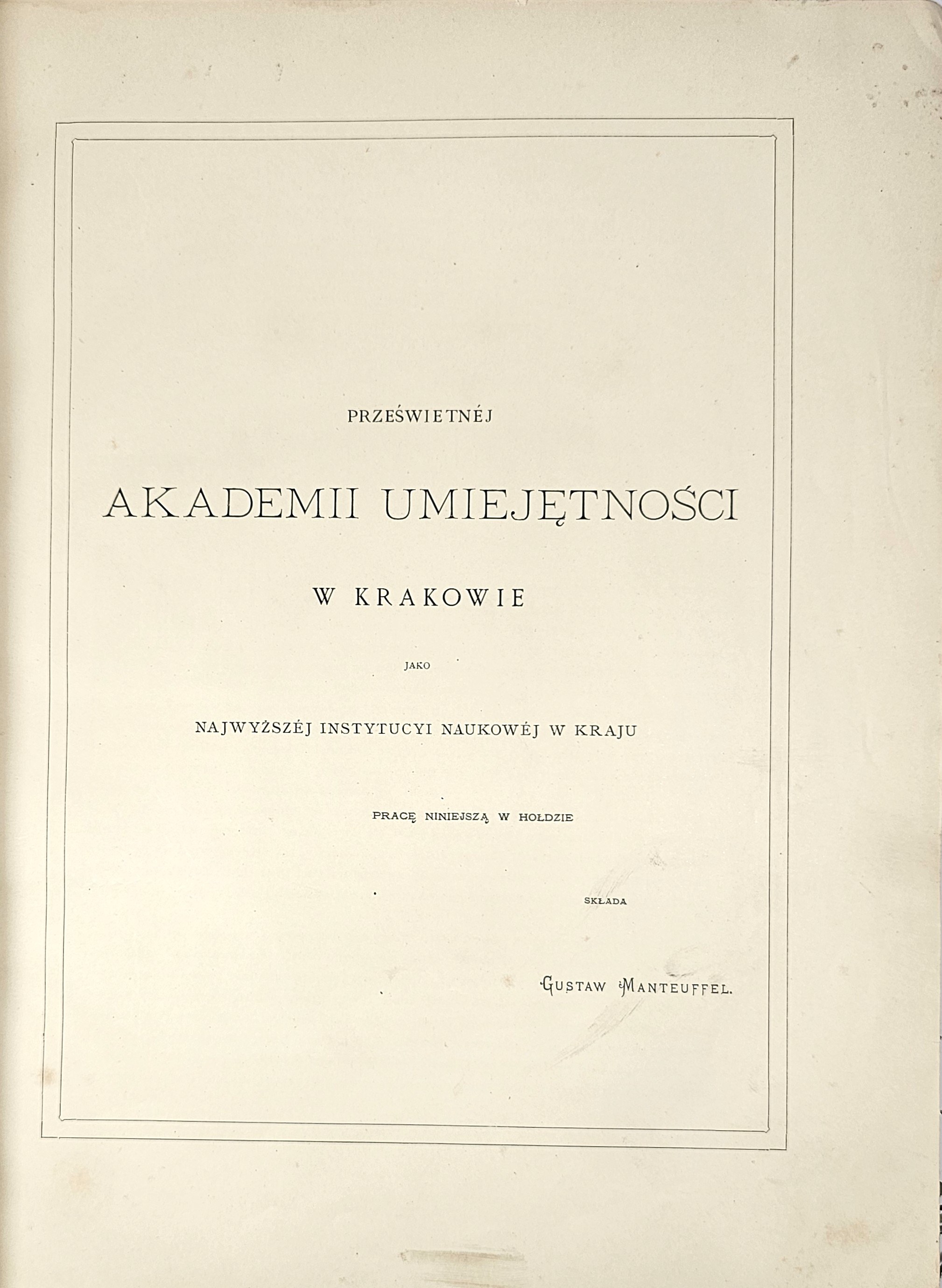 32.6 cm, s. IX, 168, [1], 21 całostr. ilustr., 3 mapy: w tym 1 rozkładana, opr. psk.: sygn. nalepką: C.W.Vogt & Sohn, Berlin, skóra ciemnozielona, karton marmoryzowany, złocone zdobienia, grzbiet sześciopolowy ze złoconymi zdobieniami i tytulaturą; wyklejki oryg., brzegi kart złocone, jedwabna zakładka. Na przedniej wyklejce exlibris Biblioteka Ordynacji Nieświeskiej z herbem Radziwiłłów, okrągła pieczęć Biblioteki Ordynacji Nieświeżskiej, na odwrocie k. tytuł. sygnet (drukarski?). Krawędzie i rogi oprawy miejscami przetarte, pierwsze karty ze śladami przewracania stron, poza tym stan dobry. Z kompletem map i ilustracji. Wydanie 1, więcej nie ukazało się. Rzadkie.