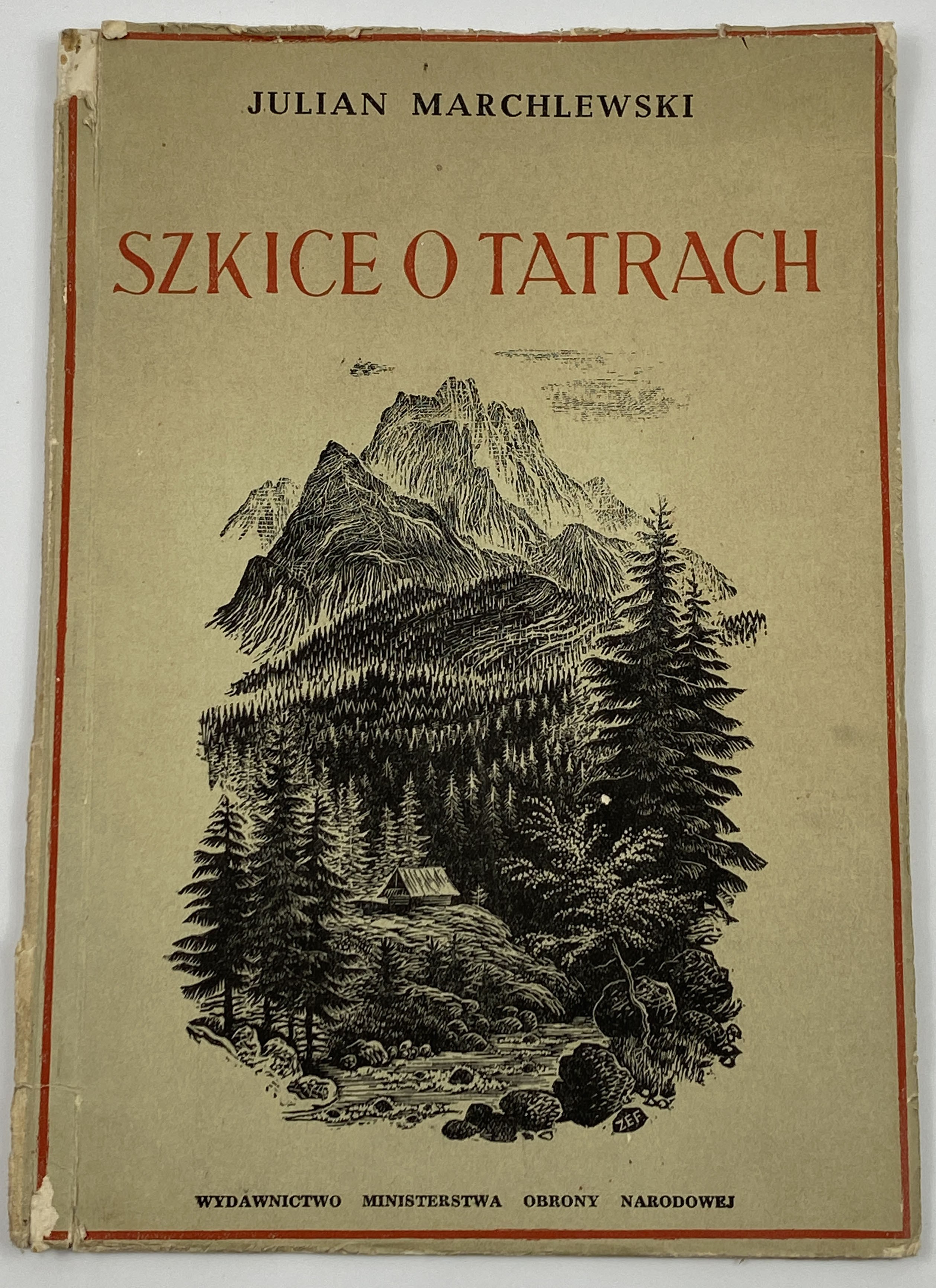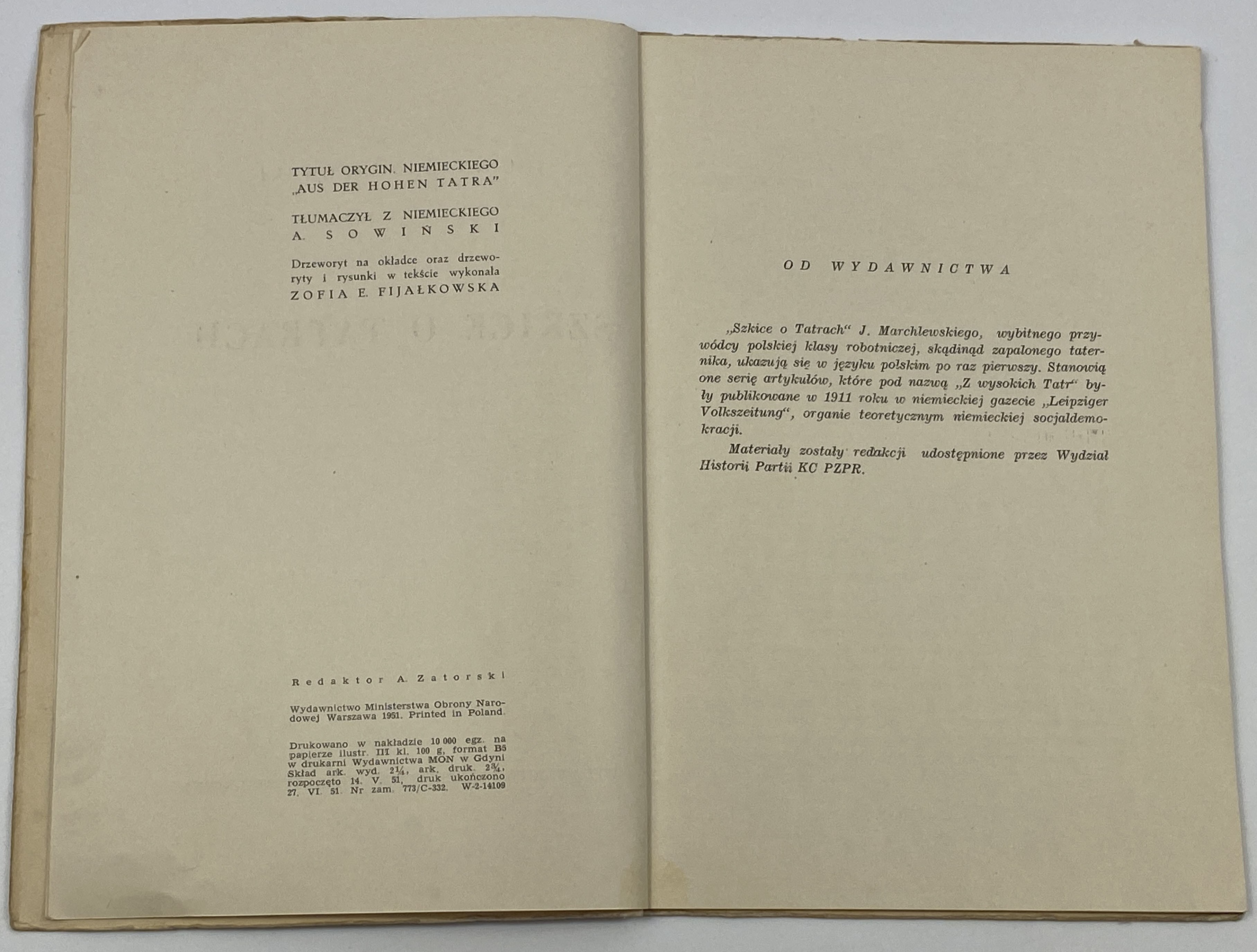 Marchlewski Julian, Szkice o Tatrach, Wydawnictwo Ministerstwa Obrony Narodowej, Warszawa 1951, s. 44 strony, 3 całostronicowe ilustracje w drzeworycie, wymiary 16,5 x 23,5 cm. Drzeworyt na okładce oraz drzeworyty i rysunki w tekście wykonała Zofia Fijałkowska. Okładka broszurowa. Podpis własnościowy na wewnętrznej stronie okładki.