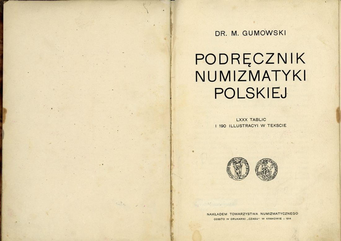 LITERATURA NUMIZMATYCZNA, Marian Gumowski - Podręcznik Numizmatyki Polskiej wydany nakładem Towarzystwa Numizmatycznego, w drukarni Czasu”, Kraków 1914, 296 stron, 80 tablic i 190 ilustracji w tekście, egzemplarz z księgozbioru dr. Bolesława Demela z własnoręcznymi notatkami właściciela, twarda oprawa w płótno z marmurkiem, na nieco uszkodzonym grzbiecie tłoczony złotymi literami napis Gumowski Numizmatyka POLSKA