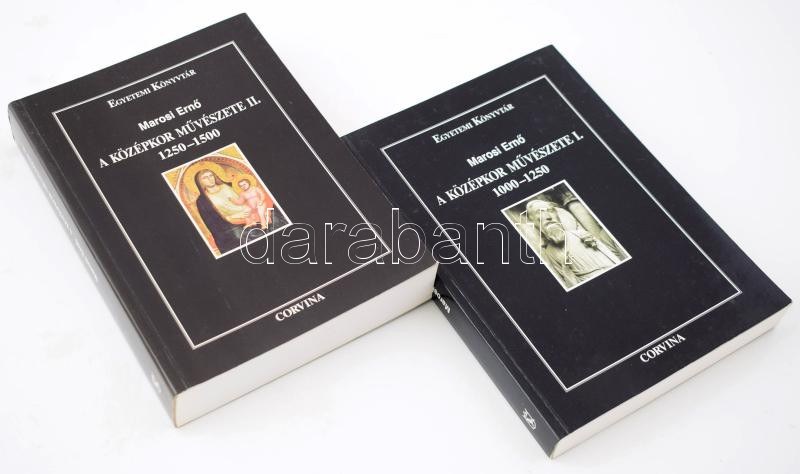Marosi Ernő: A középkor művészete I-II. köt. Egyetemi Könyvtár. Bp.,1997, Corvina, 252+370 p. Fekete-fehér fotókkal illusztrált. Az I. kötet. 2. kiadás. A II. kötet 1. kiadás. Kiadói papírkötés, karcos borítóval, de ezt leszámítva jó állapotban. Marosi Ernő (1940-2021) Széchenyi-díjas művészettörténész, egyetemi tanár, a MTA tagja, az MTA Művészettörténeti Intézetének igazgatója (1991-2000.)