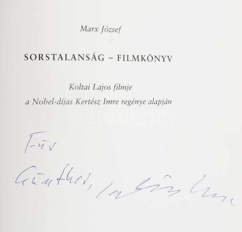 Marx József: Sorstalanság - filmkönyv. Koltai Lajos filmje a Nobel-díjas Kertész Imre regénye alapján. Az író, Kertész Imre (1929 - 2016) által DEDIKÁLT példány. Bp., 2005, Vince. Kiadói papírkötés.