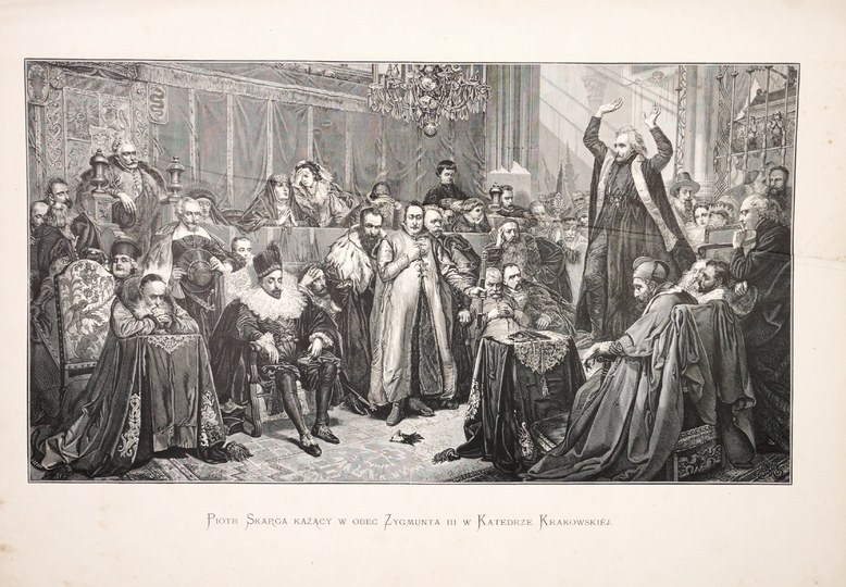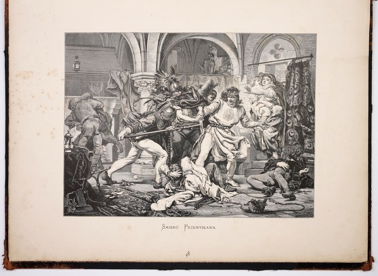 Otarcia grzbietu i okł., podklejony ubytek górnej części grzbietu, załamania pierwszej i przedostatniej tablicy, załamania kilku kart z tekstem objaśniającym, miejscami zaplamienia tablic. Podpis własn. Wysokiej klasy drzeworytowe reprodukcje obrazów i rysunków Jana Matejki. Duża część rycin została przeniesiona na klocki drzeworytnicze przez samego artystę. Grafiki odbito głównie w Drzeworytni Kłosów na specjalnie sprowadzonym papierze z Jeziornej i Pilicy. Wydawca tak pisał o swojej publikacji: "Wydawnictwo tego rodzaju, to już nie druk książki zwyczajnej: wykonanie każdego z takich drzeworytów, jak np. Stefan Batory, Sejm w Lublinie i t. p., wymagało po sześć miesięcy czasu, nie licząc użytego do narysowania onych na drzewie".