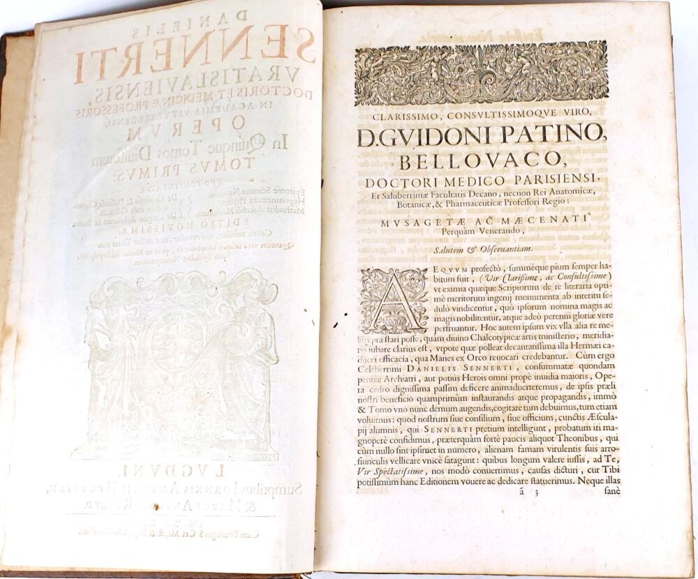 Oferowane dzieło zawiera w t.1 księgę konsensusu i niezgody chemików z Arystotelesami i Galenistami, najnowsze wydanie uosobienia nauk przyrodniczych; w t.2: Instytucje medyczne - księga piąta, O gorączce - księga czwarta; Garść leków na zarazę.